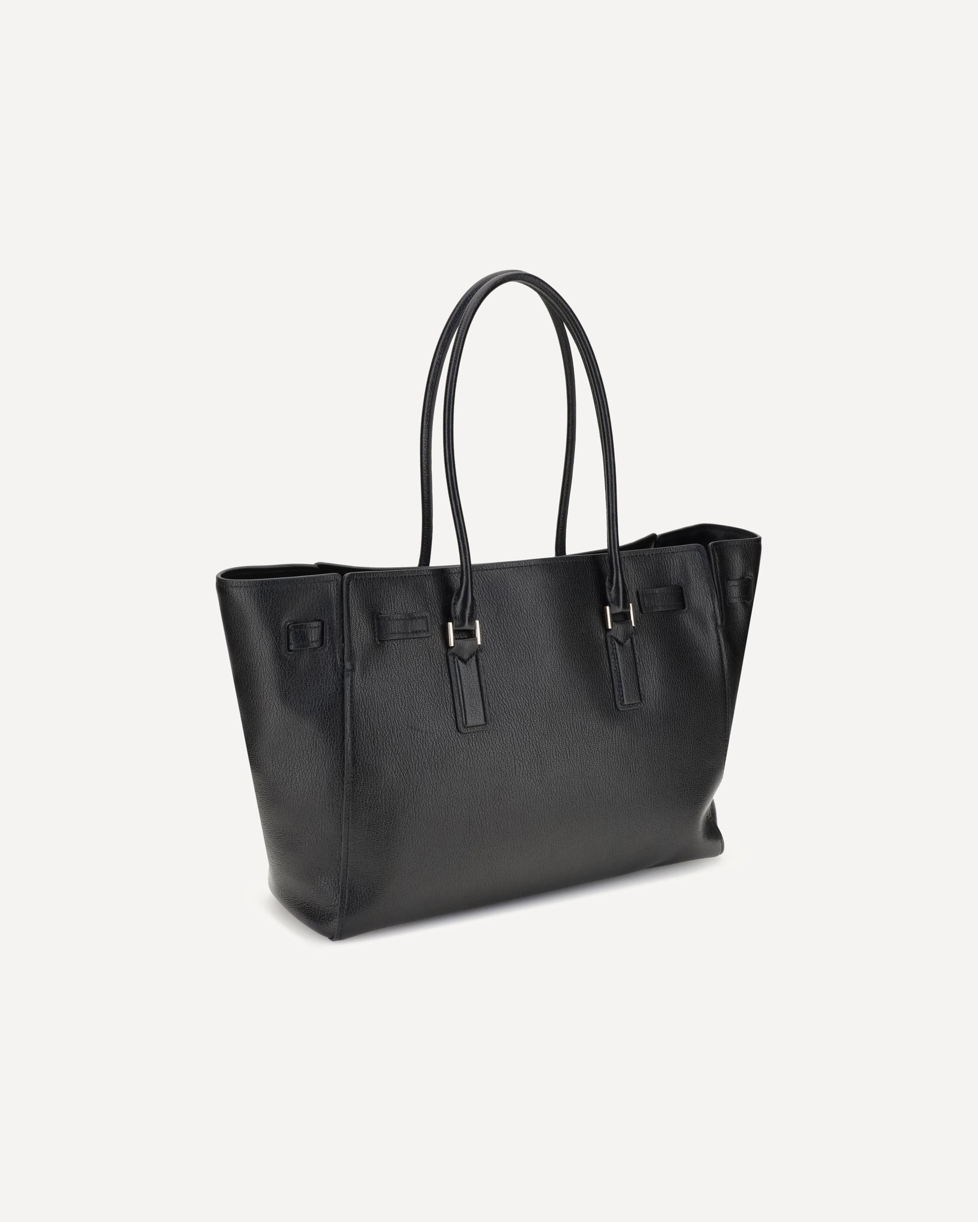 The Hamilton Moderne large Tote Bag by Michael Kors is a roomy, structured model designed to combine functionality and elegance. The silhouette with decorative belt and iconic padlock pendant define its sophisticated style, ideal for everyday use. Featuring a zippered closure, it has an organized interior with a back zippered pocket and two front pouch pockets, perfect for storing laptops, documents and personal items neatly and conveniently.