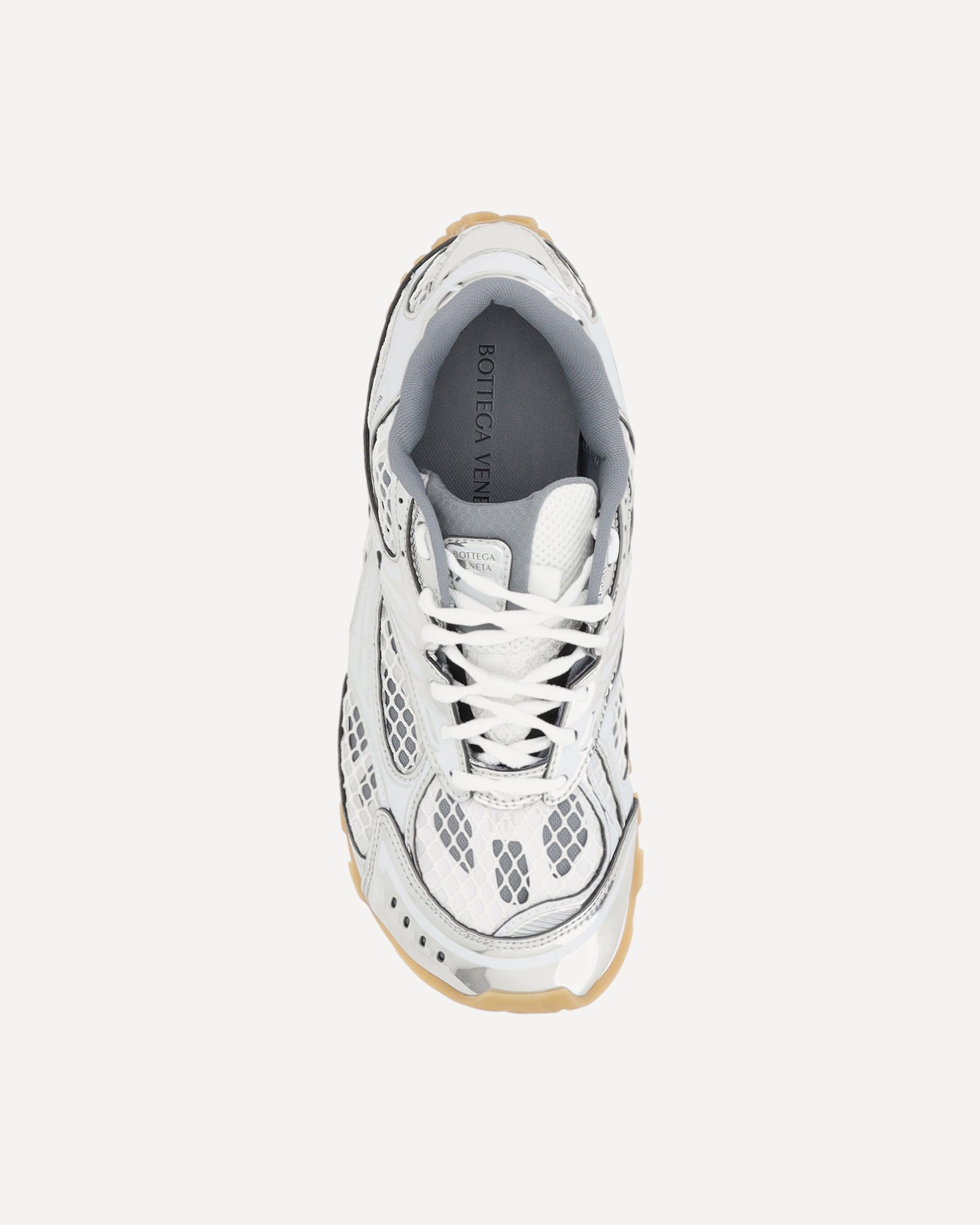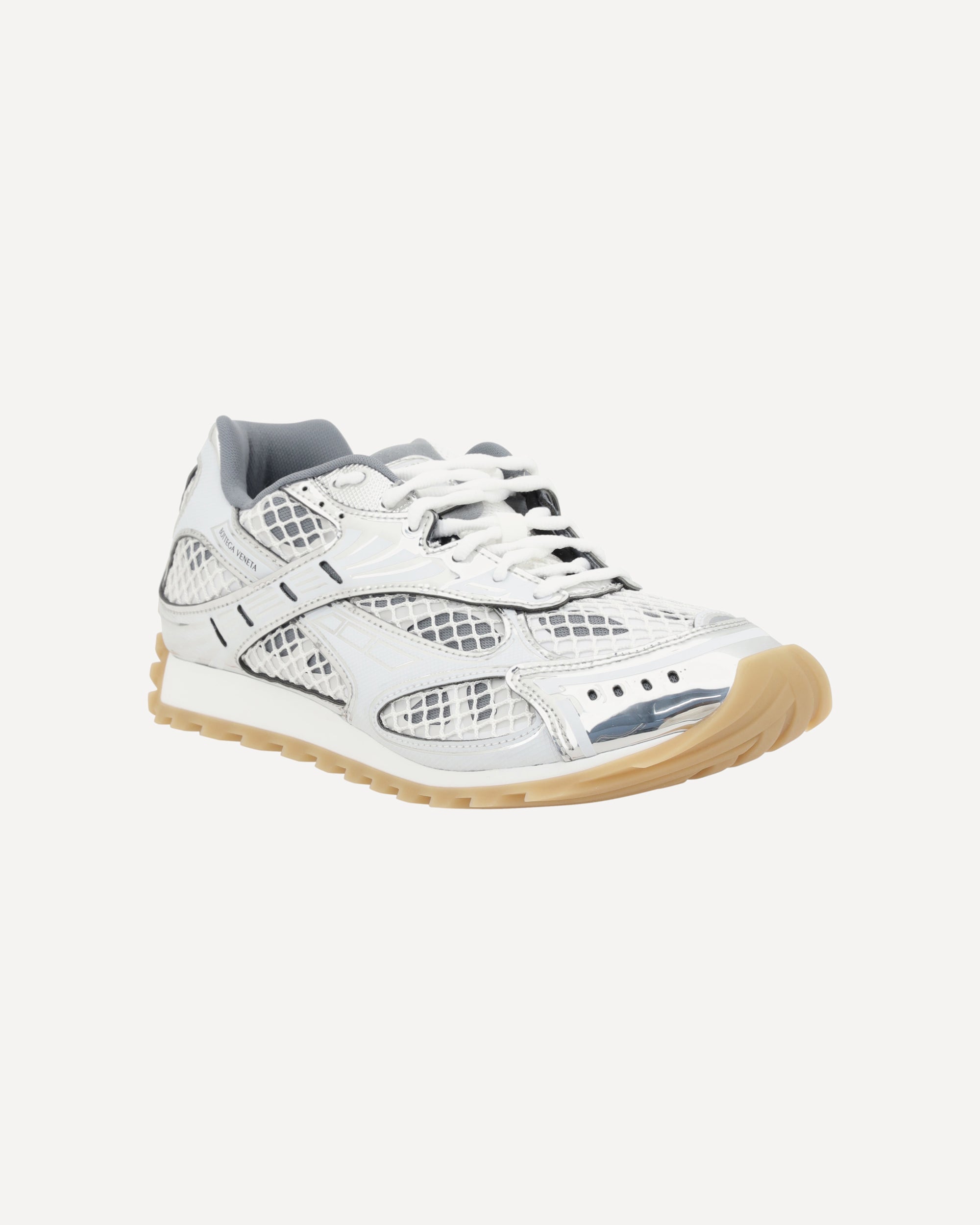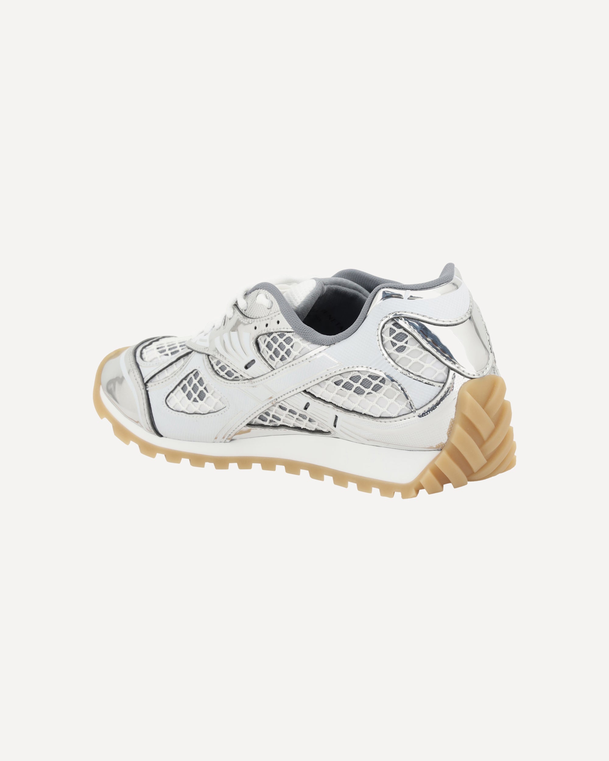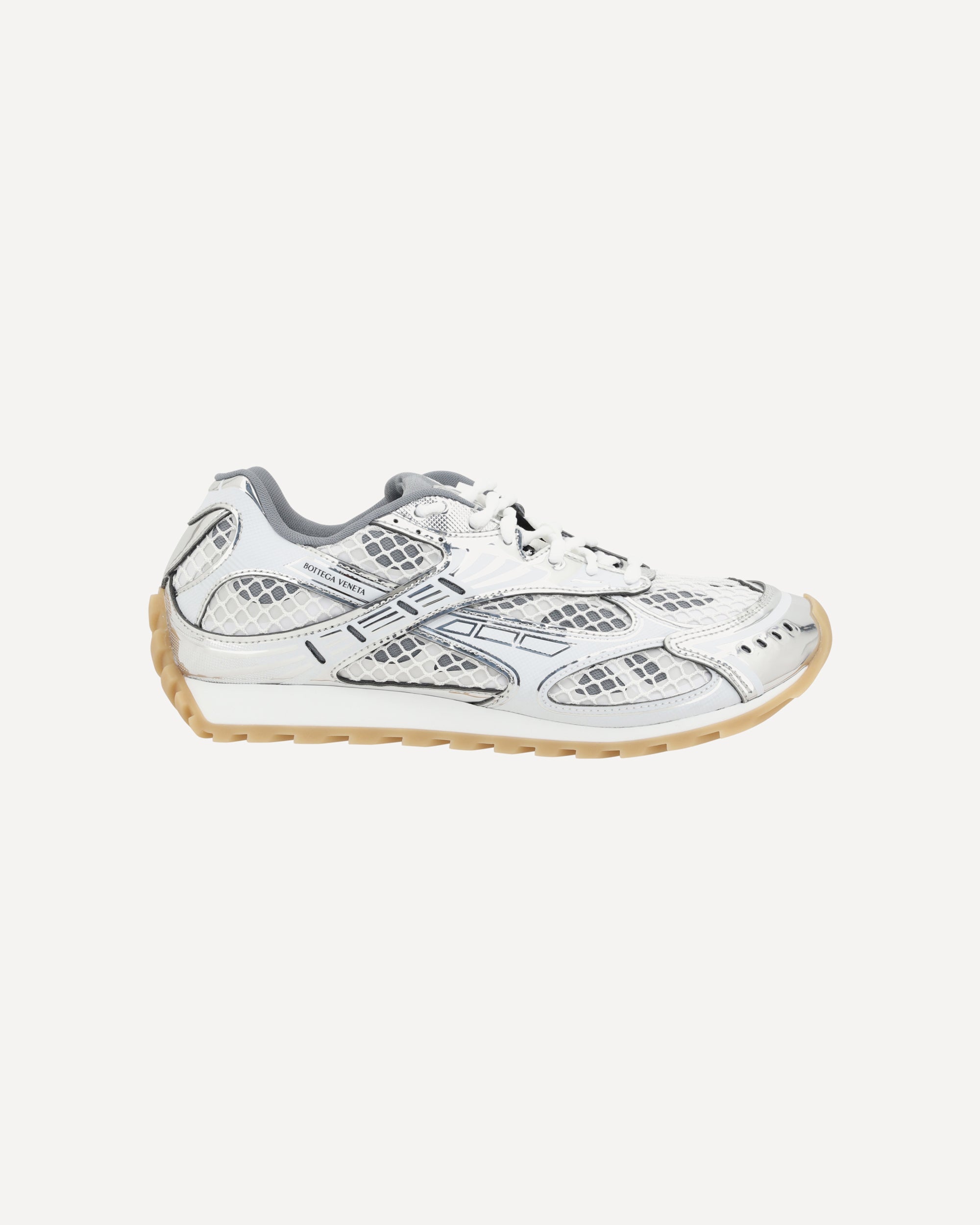 Bottega Veneta's Orbit Sneakers combine a contemporary aesthetic with high-quality technical materials. The paneled mesh and technical fabric upper ensures lightness and breathability, while the non-slip rubber sole offers stability and comfort. A lace-up closure, padded tongue and logoed details complete a style designed for an urban, refined style.