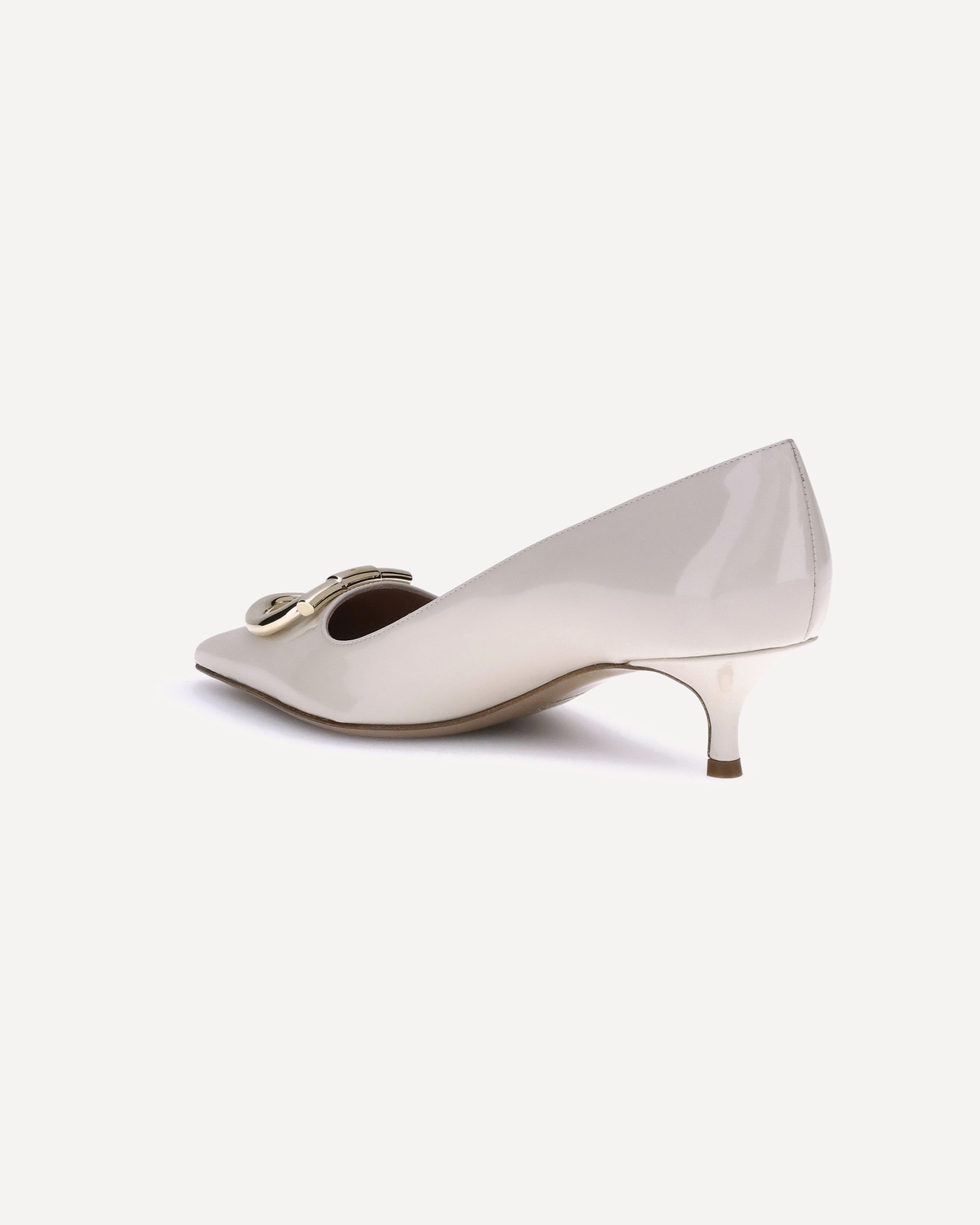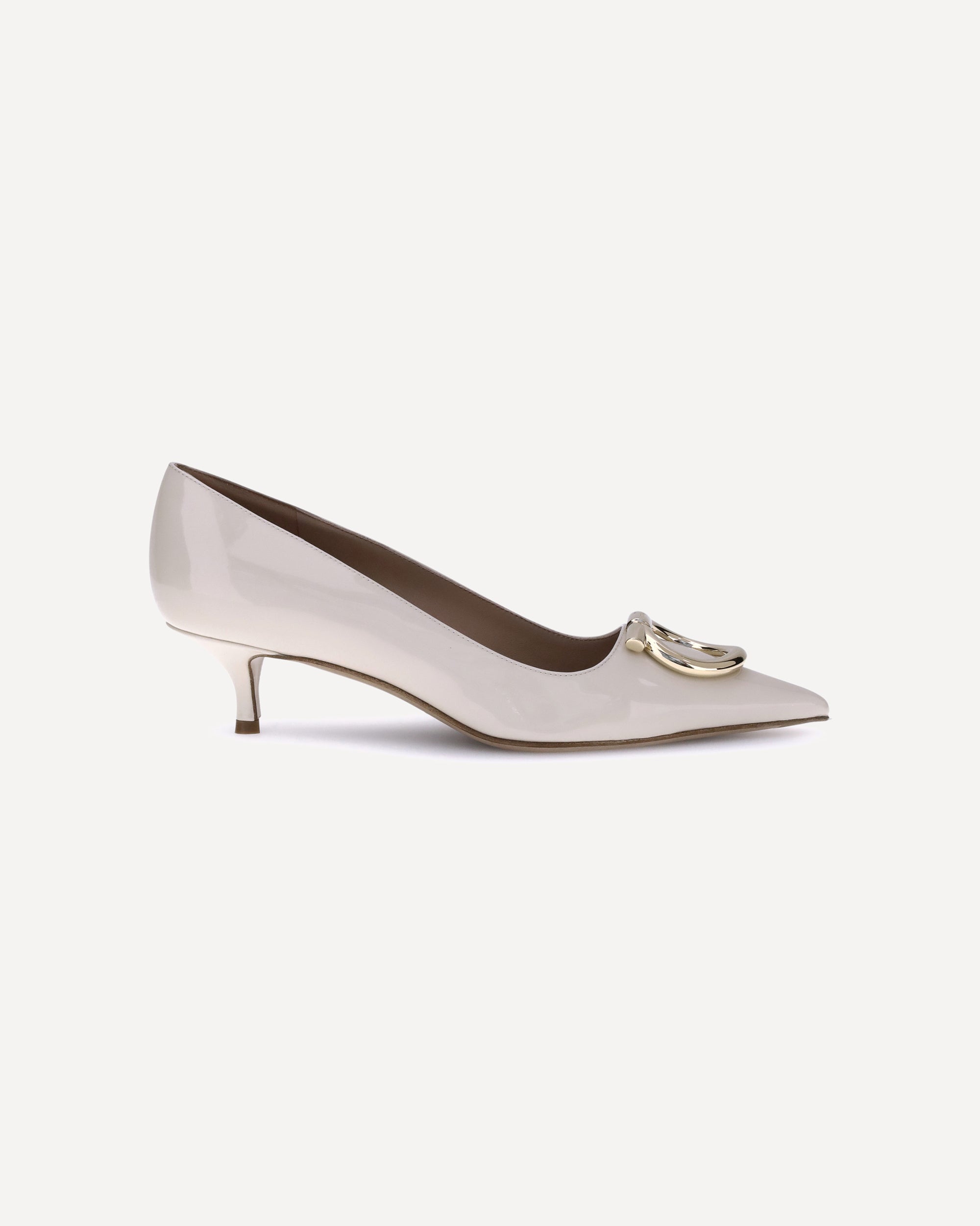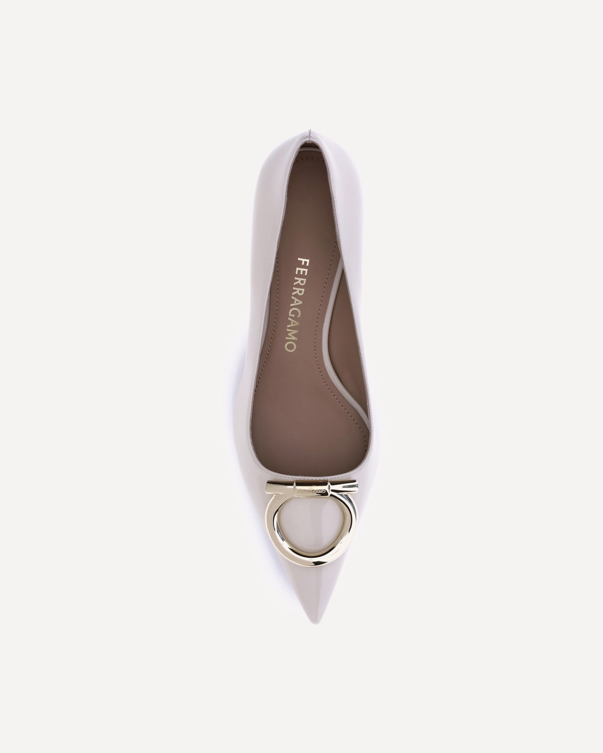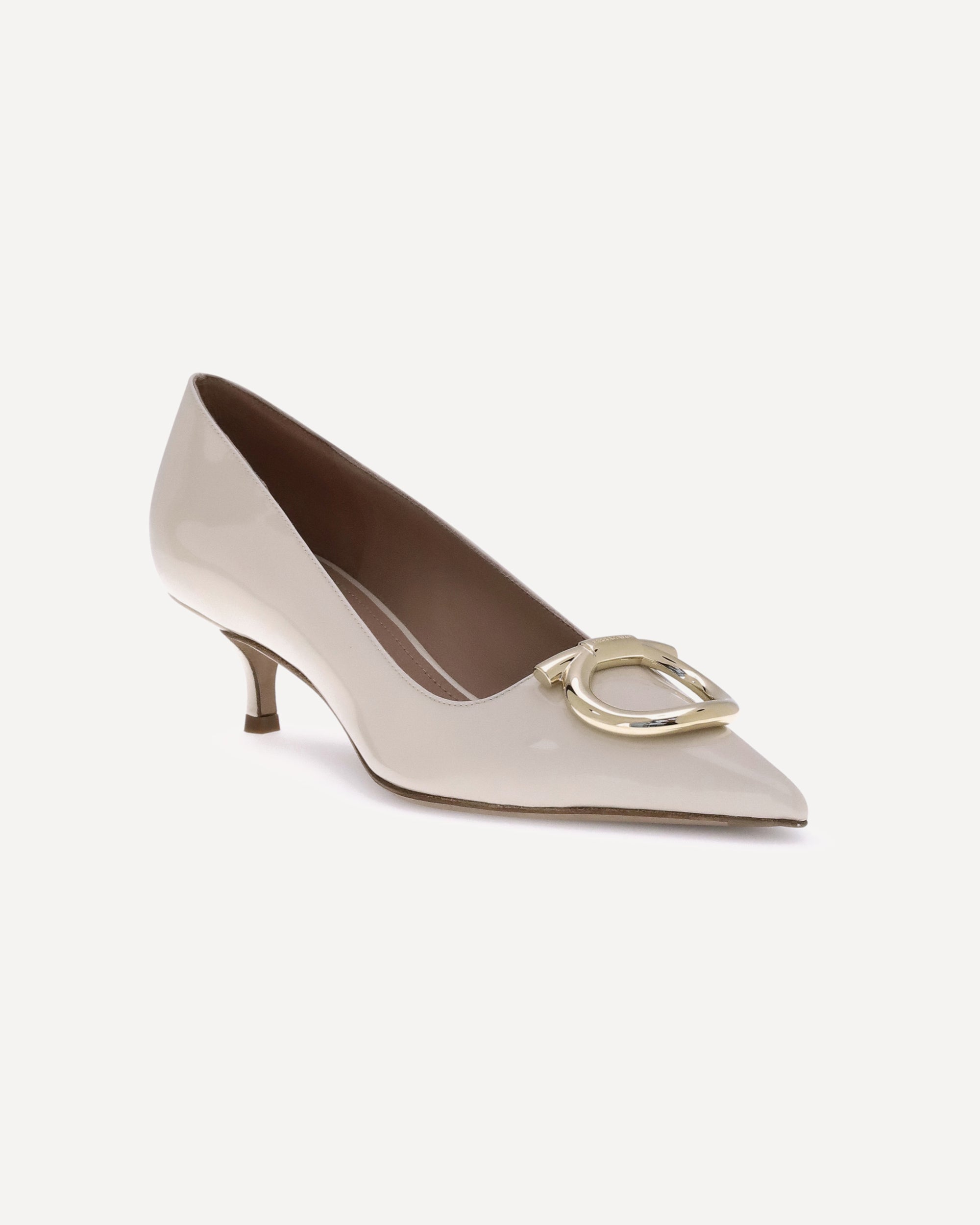 Ferragamo's Gancini Pumps embody sophisticated and timeless elegance. Featuring a tapered toe and a slim kitten heel covered in tone-on-tone, they feature the iconic Gancini ornament in a maxi version with a gold finish. The gently rounded neckline slims the silhouette, making them perfect from day to evening.