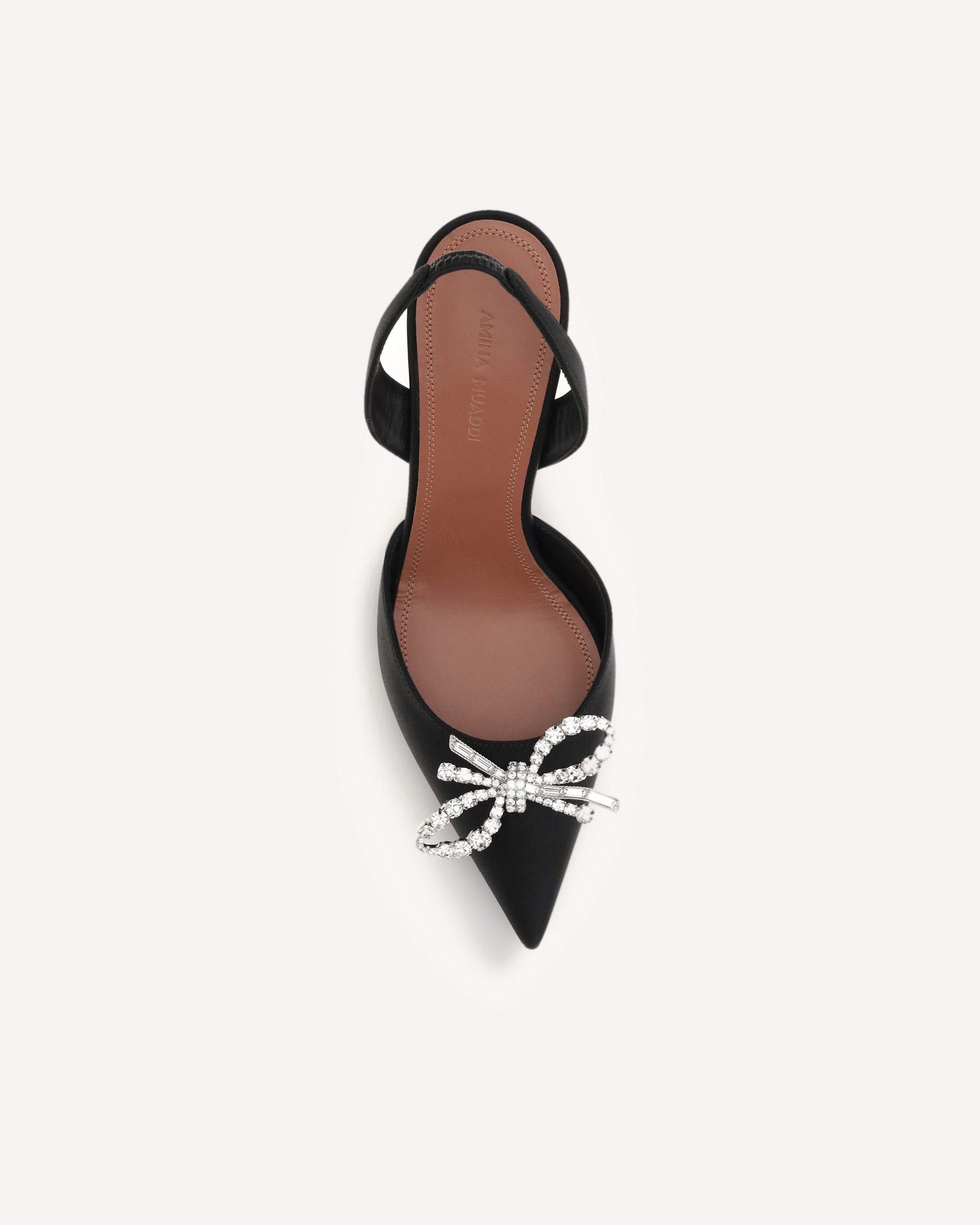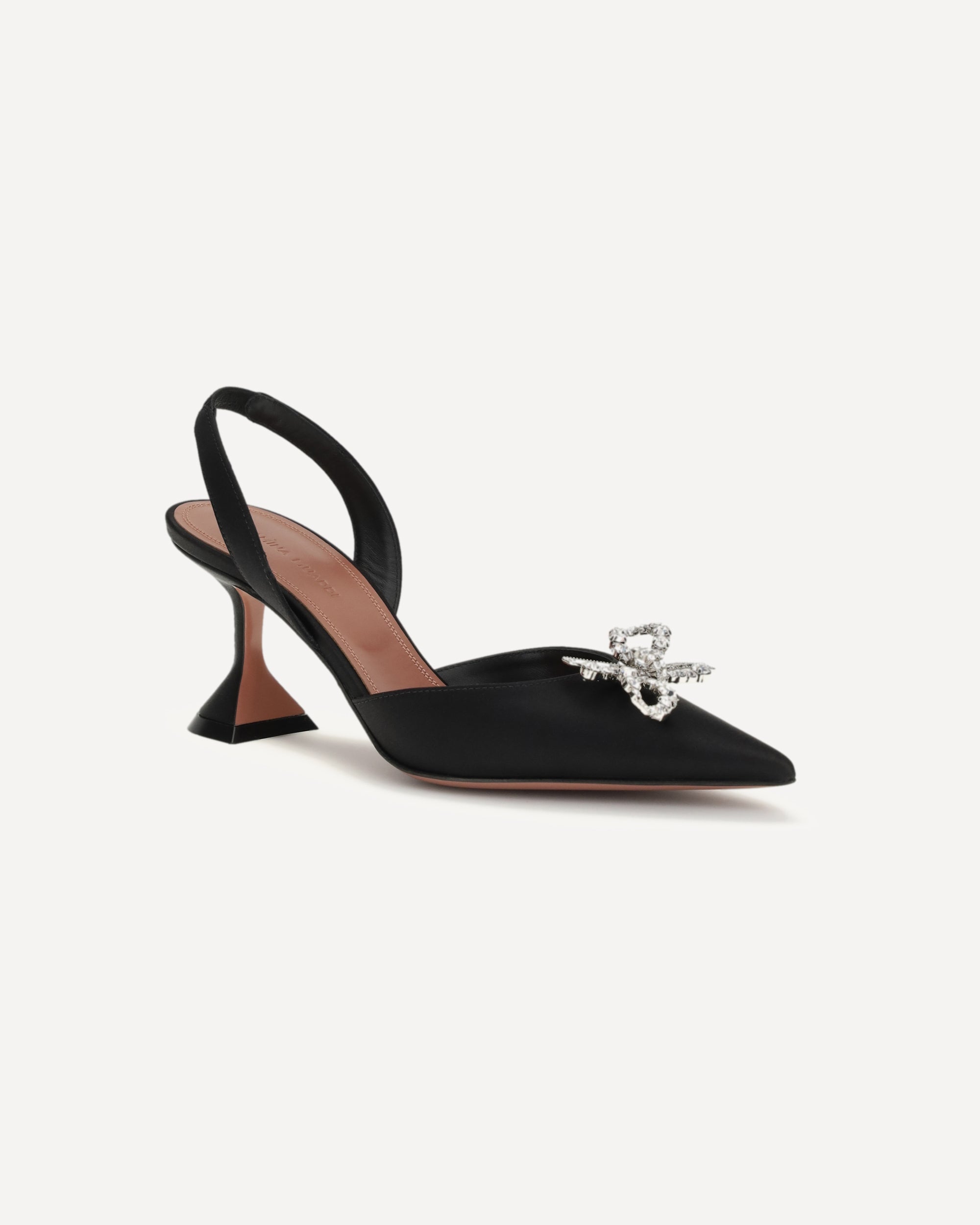 The Rosie slingback Pumps by Amina Muaddi are an expression of refinement and glamour. The bow detail embellished with crystals adds a touch of light and elegance, while the tapered toe emphasizes femininity with a slimming effect. The iconic sculptural heel, distinctive of the brand, gives a unique and bold charm, making these shoes a true style statement. Perfect for those seeking a balance between sophisticated elegance and sparkling details, the Rosie pumps are ideal for special occasions or to add a touch of luxury to everyday life.