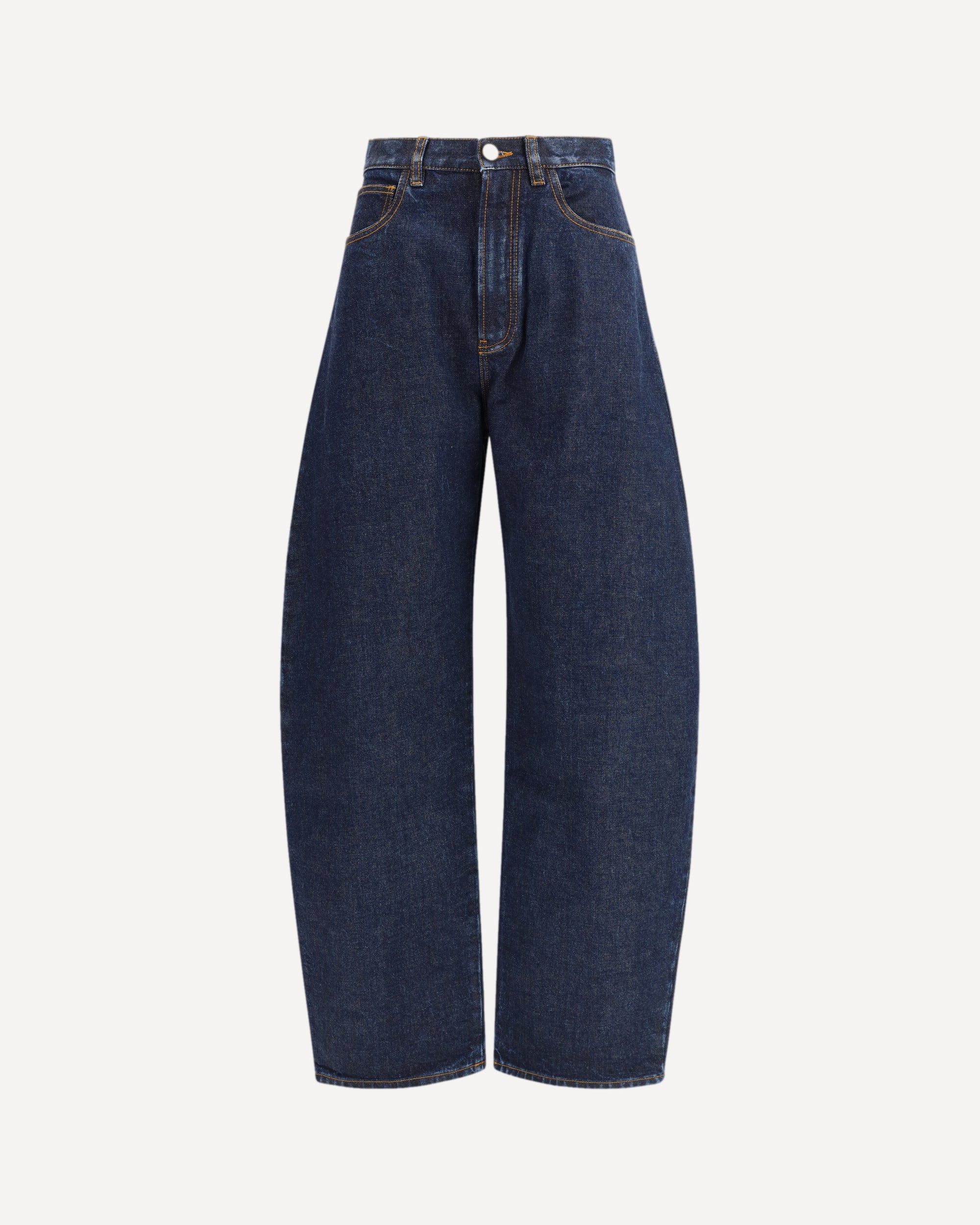 The rounded denim Pants by Alaïa embody a sculptural and contemporary interpretation of denim. Crafted from dark blue cotton denim, they feature a distinctive rounded-leg silhouette that shapes the figure with effortless precision. The low-rise waist with zip and button closure lends a modern edge, while silver-finish metal hardware adds a refined accent. Classic front and back pockets are balanced by the signature back dart, a subtle tailoring detail that defines the piece’s identity. Contrasting stitching completes the design, offering a clean aesthetic with a regular, elegant fit.