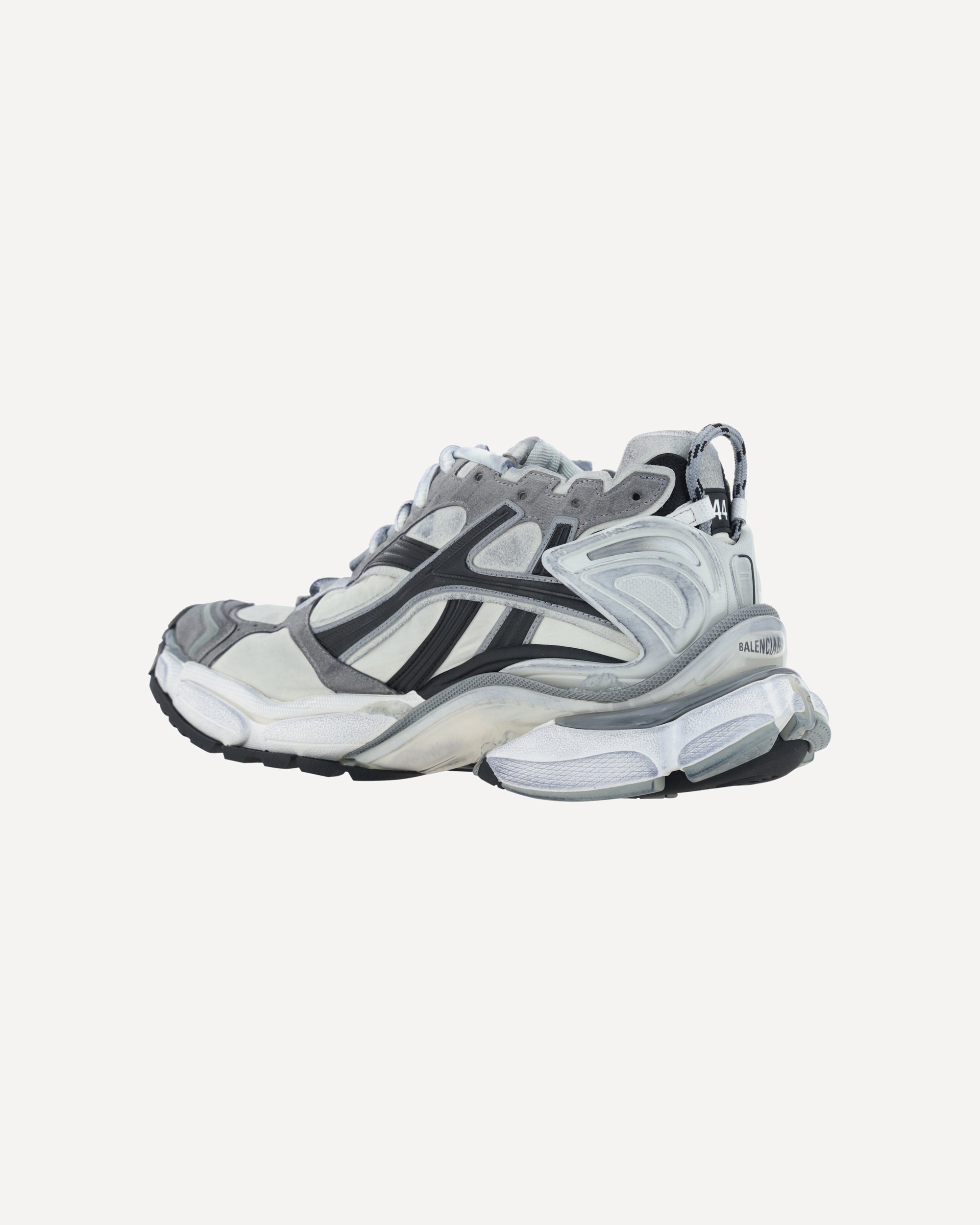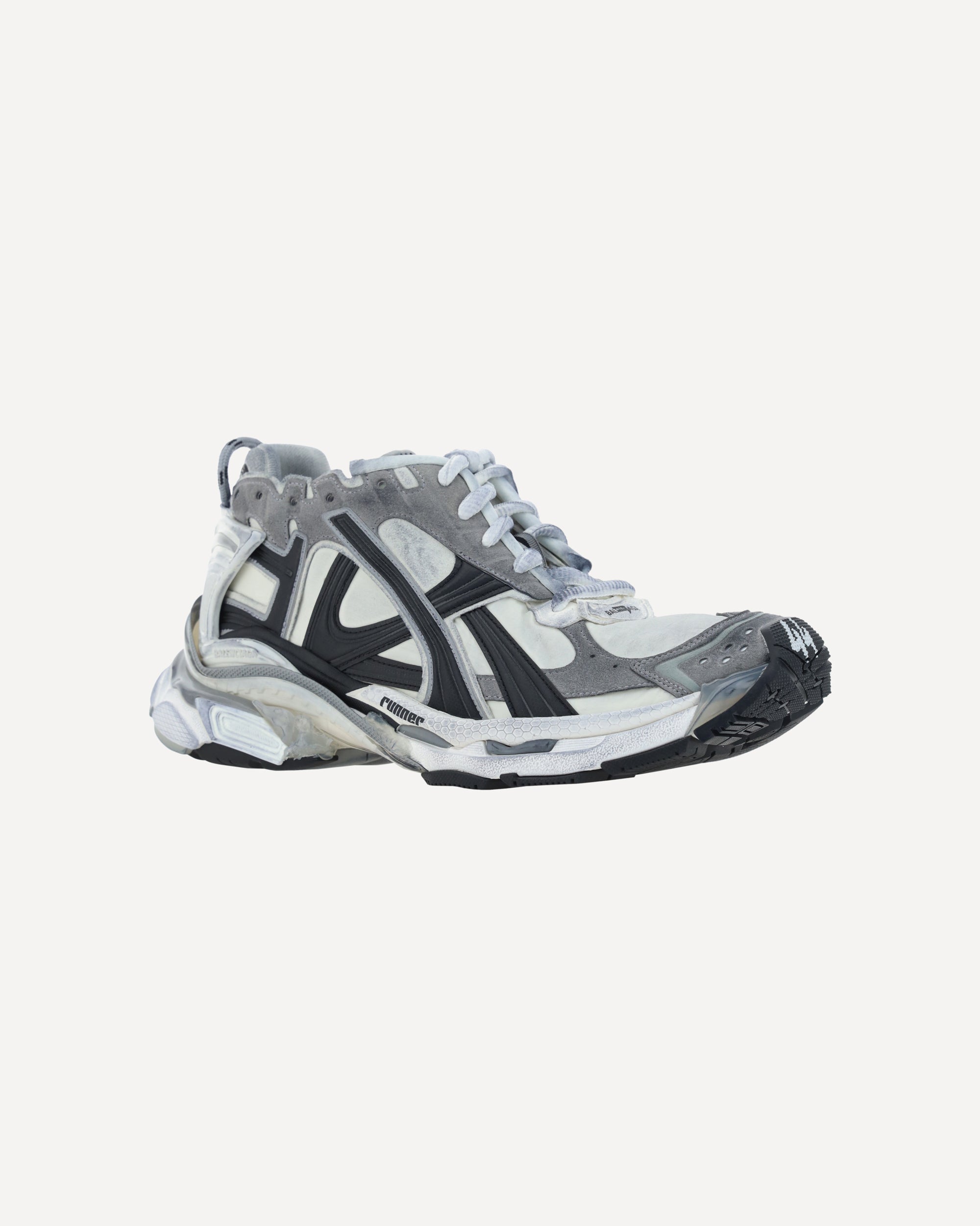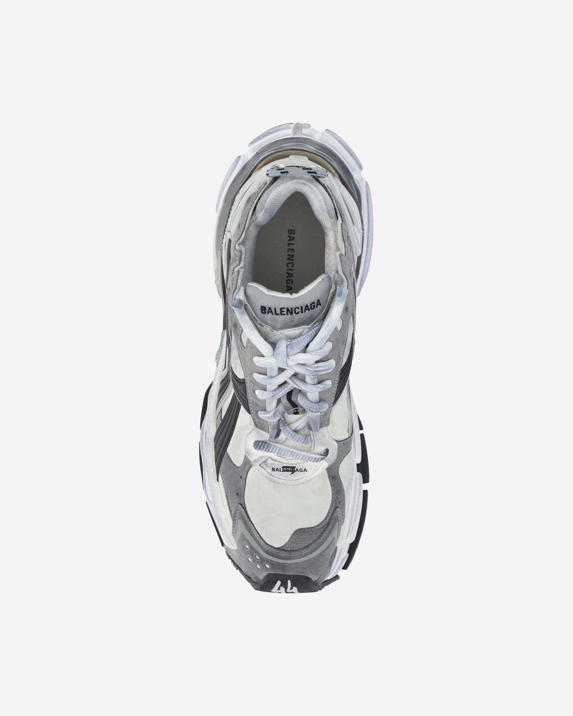 Runner Sneakers by Balenciaga, front closure via multiple laces, mesh and mesh paneling, textured chunky rubber sole, logo on sole and insole, double tongue closure, logo insole, reflective details, oversize design.