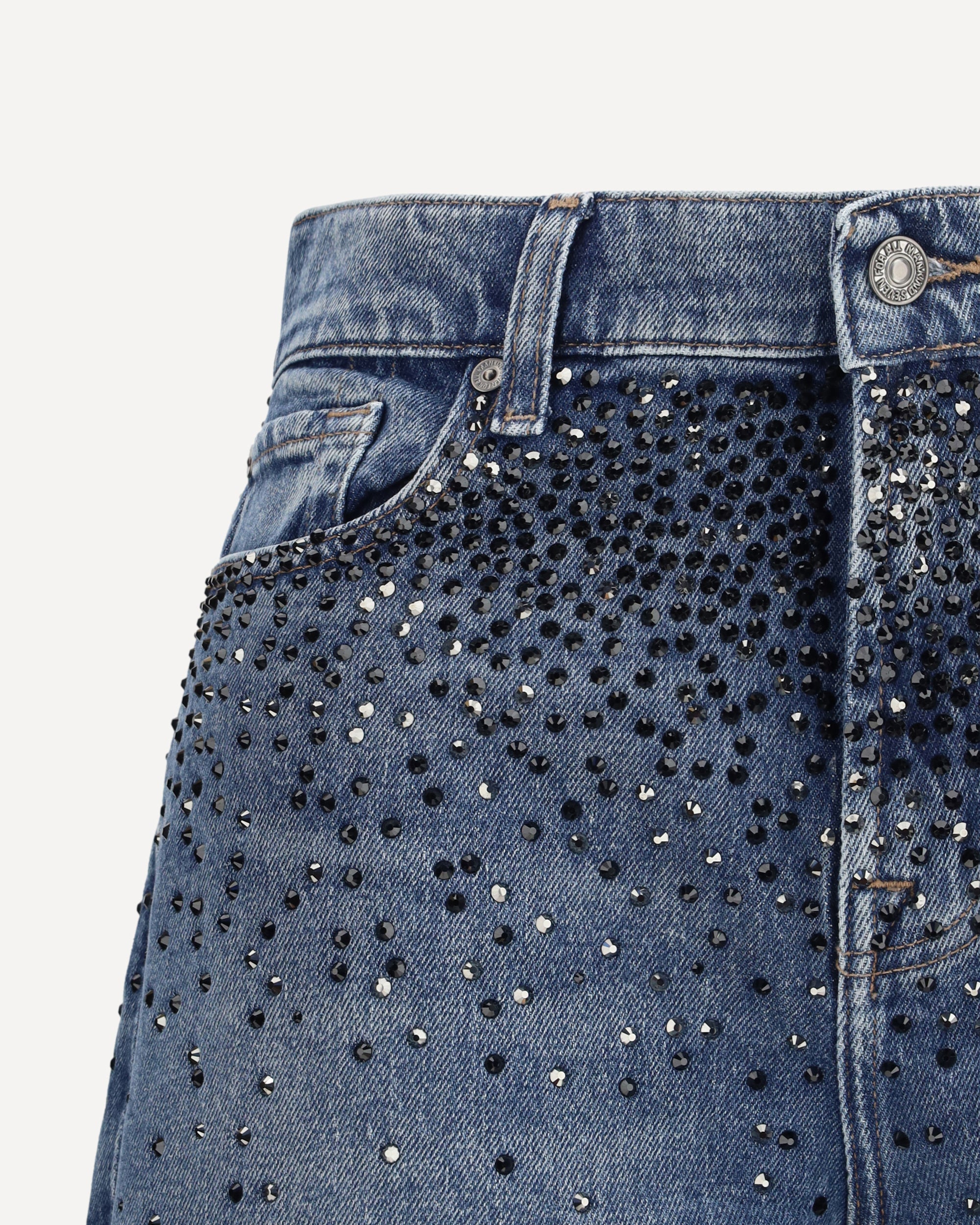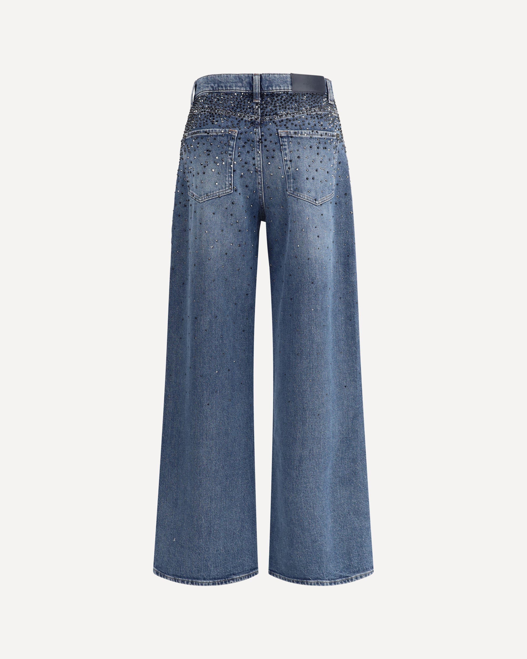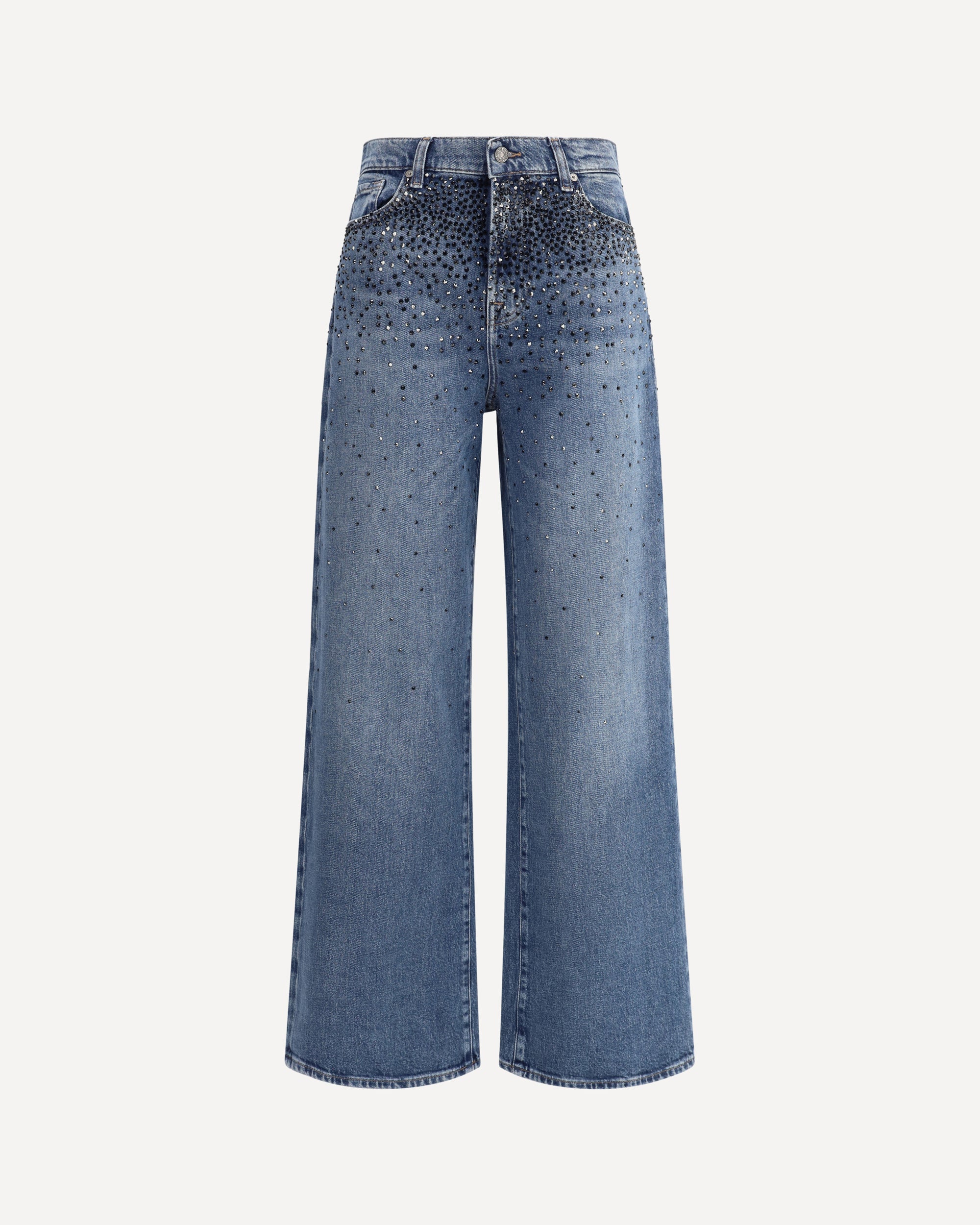The Scout Candy Jeans by 7For are a bold and sophisticated piece, featuring a palazzo style that gives a loose, flowing silhouette. The high waist and five-pocket pattern add a classic touch, while the front zipper-and-button closure ensures a perfect fit. Belt loops on the waistband allow you to customize the look. A distinctive detail is the rhinestone appliqué on the front and back, which lends brightness and a touch of glamour.