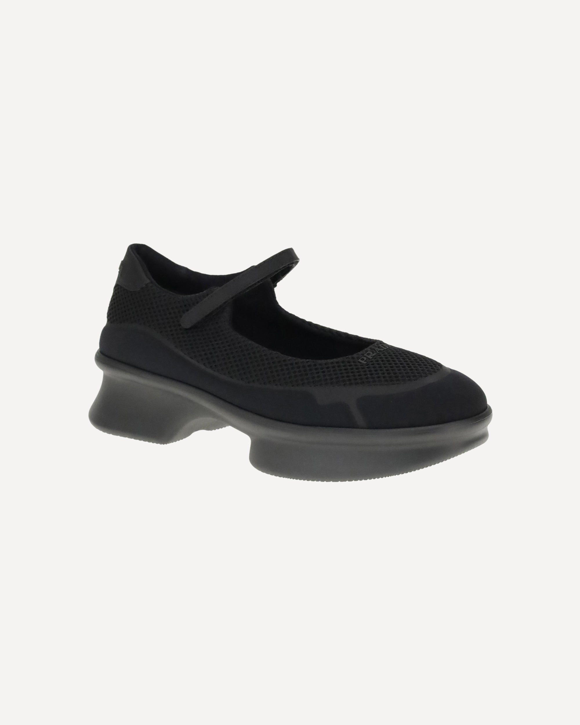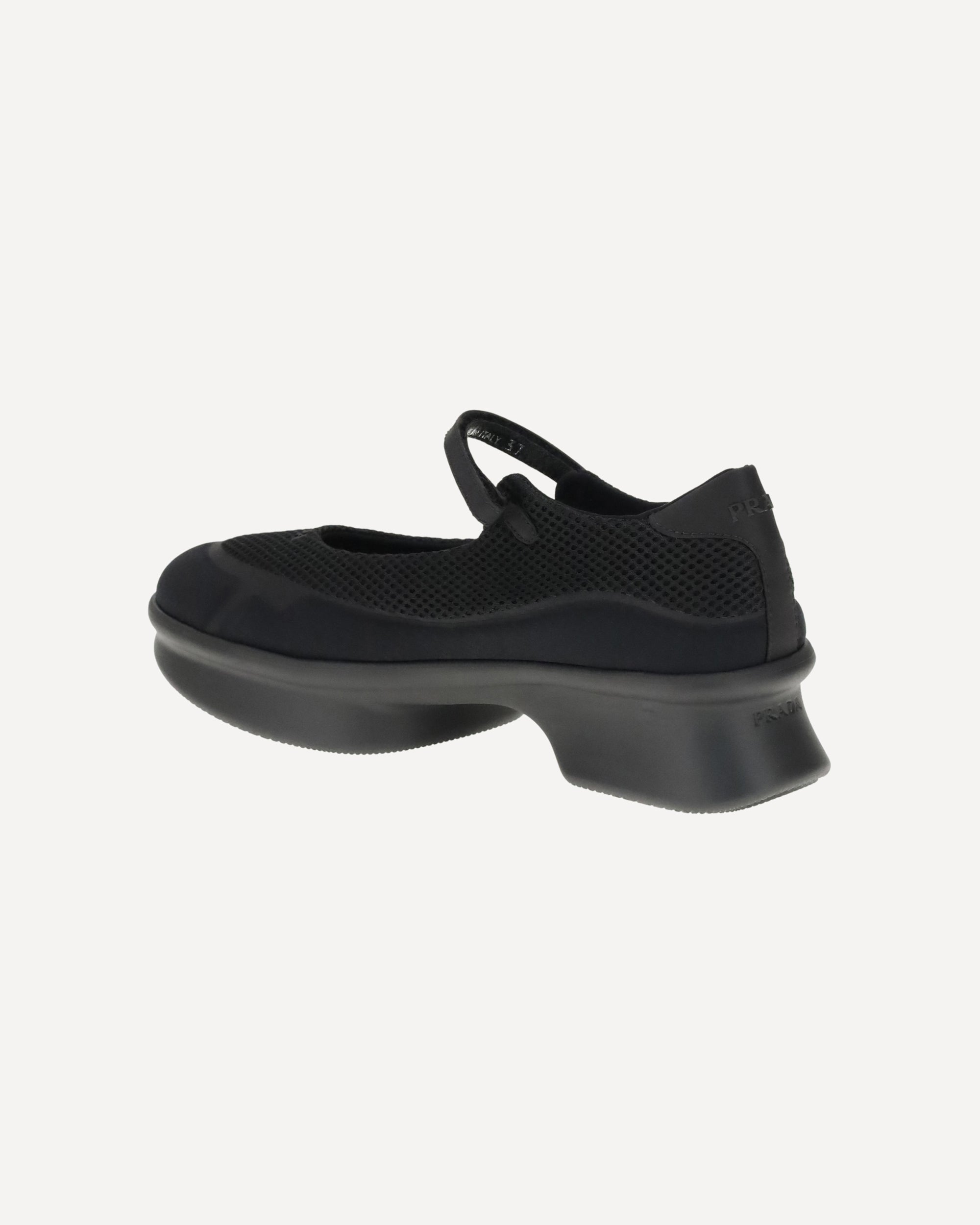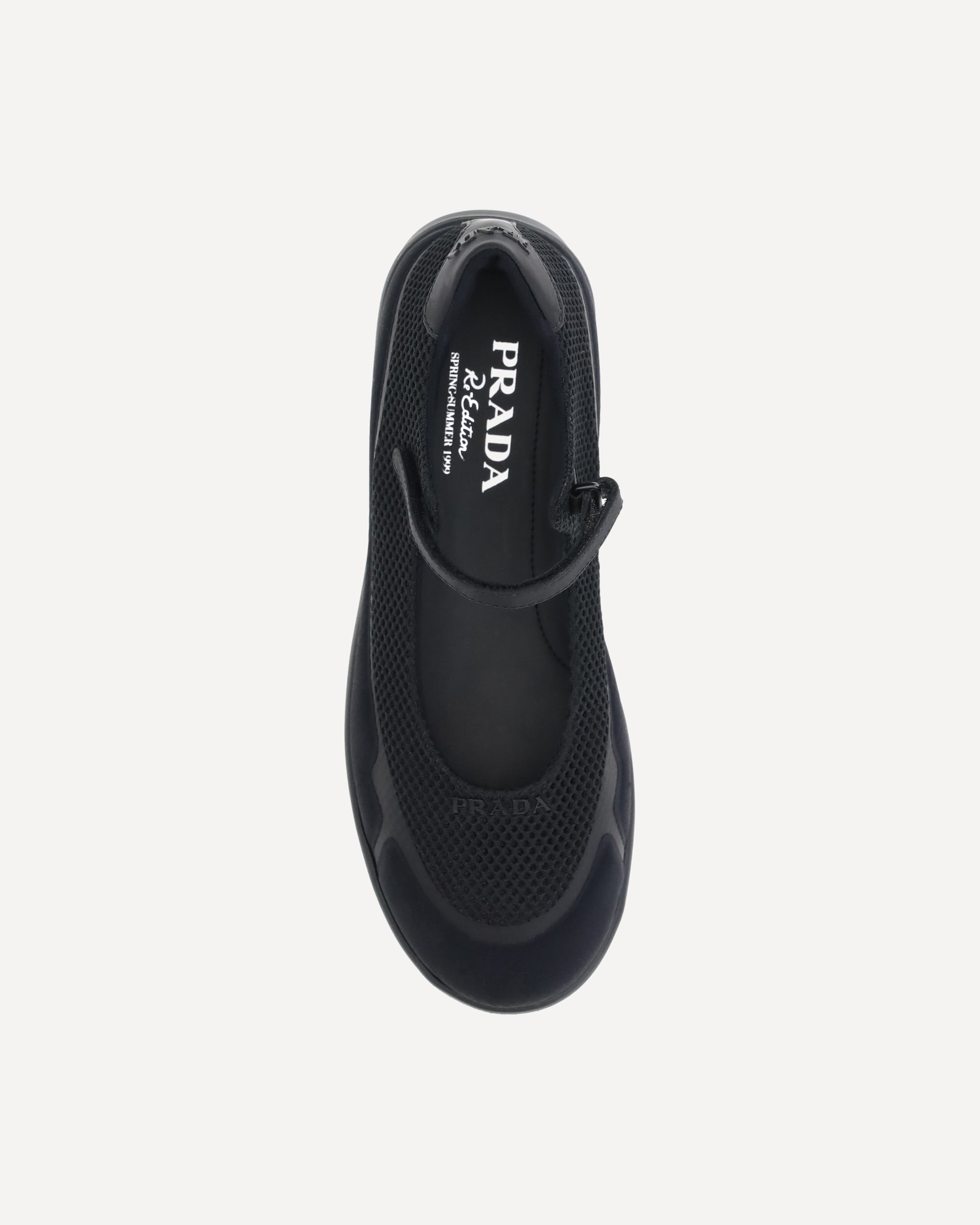 Prada's mesh ballerinas combine lightweight and sporty style in an innovative design. Featuring a round toe and an adjustable Velcro strap at the instep, they offer a comfortable and secure fit. The embossed logo on the front and heel, along with the embossed logo on the back and printed on the inside, firmly sign the brand's identity. The contoured sole completes the look with a dynamic and modern touch.