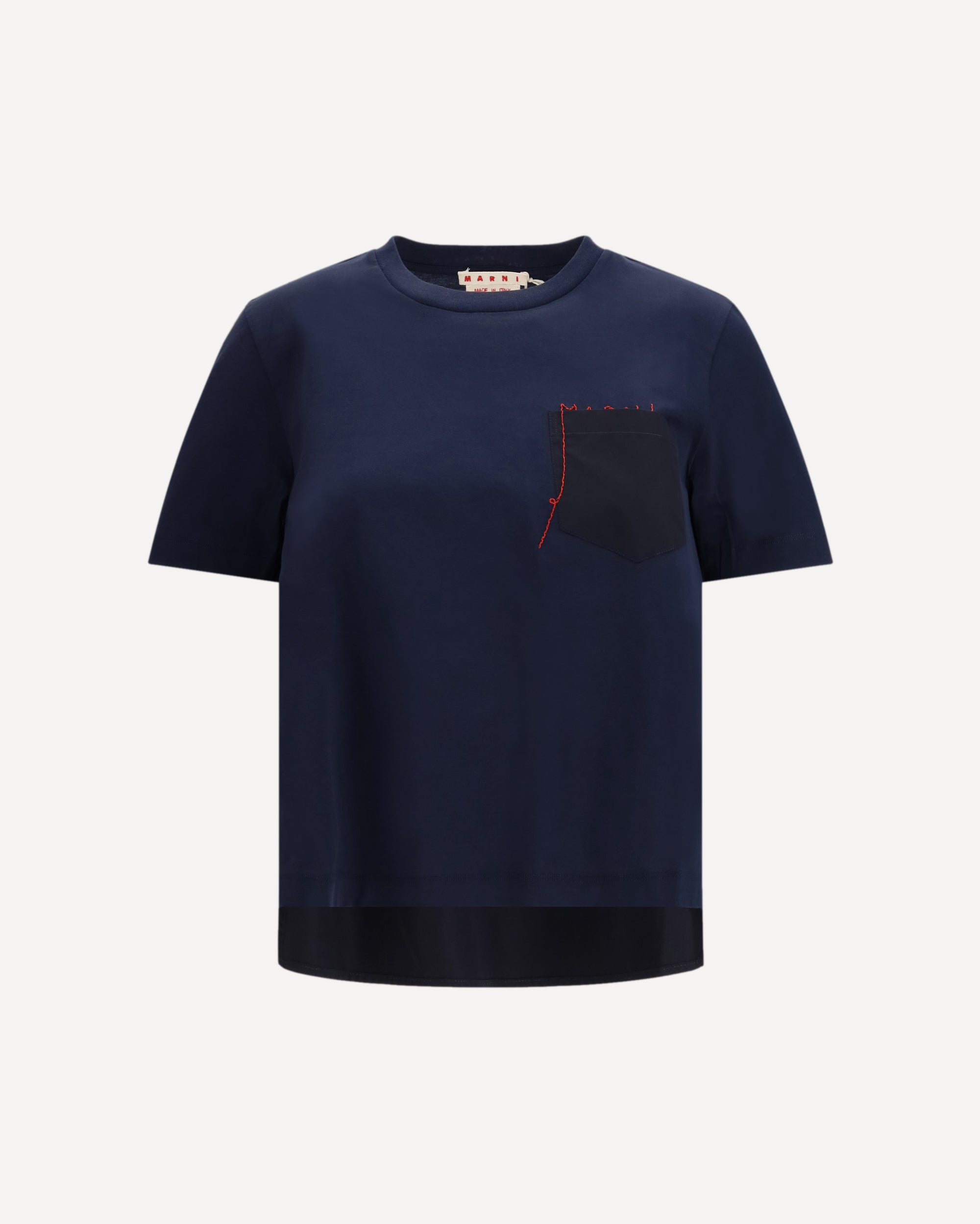 The embroidered logo T-shirt by Marni is a casual-chic piece that plays with details for a unique look. The ribbed crew neck and asymmetrical hem give it a modern and original shape, while the front patch pocket, with the logo embroidered in red above the pocket, adds a distinctive touch. The cotton poplin back creates an interesting contrast, giving the T-shirt a different texture and a compelling visual effect.