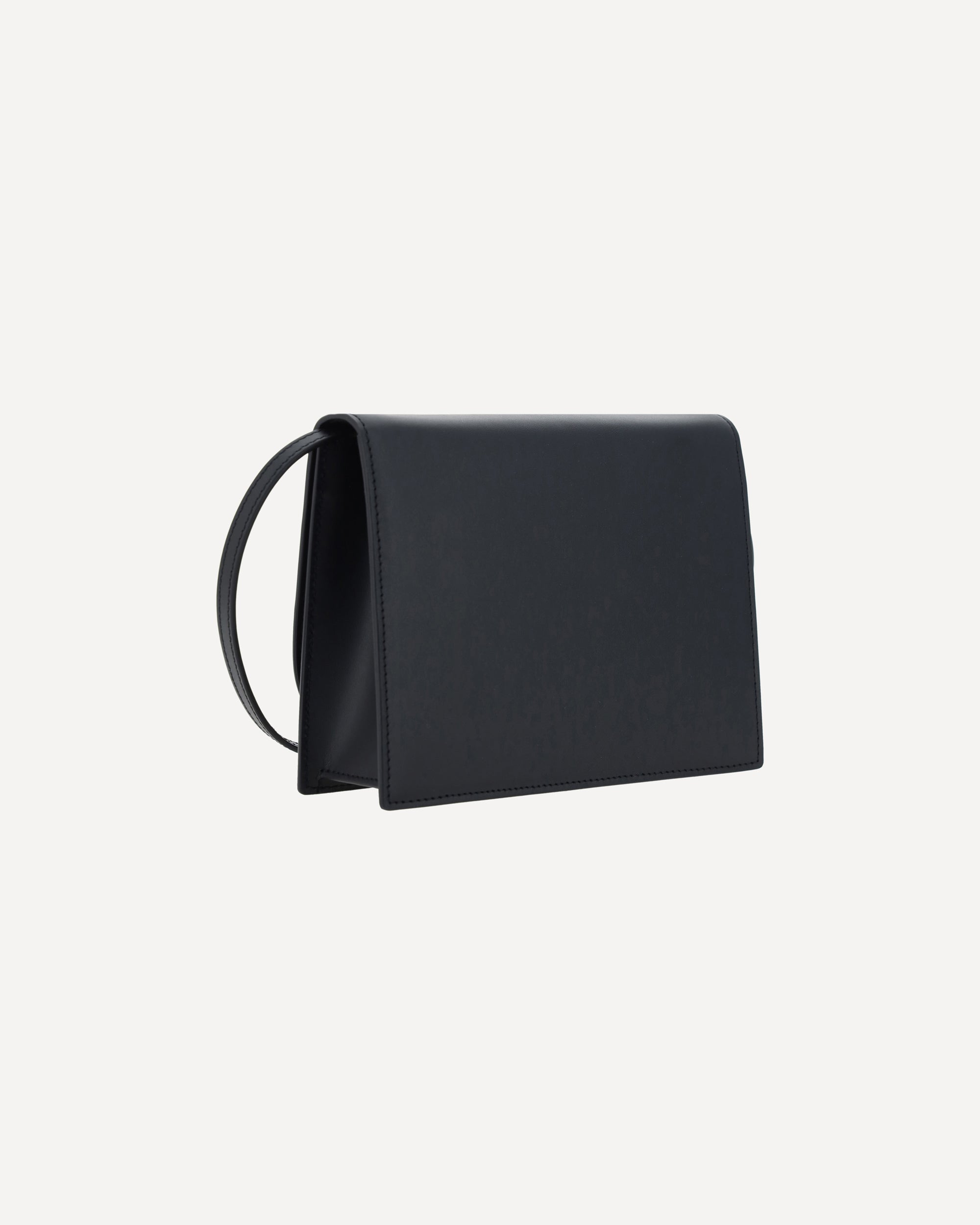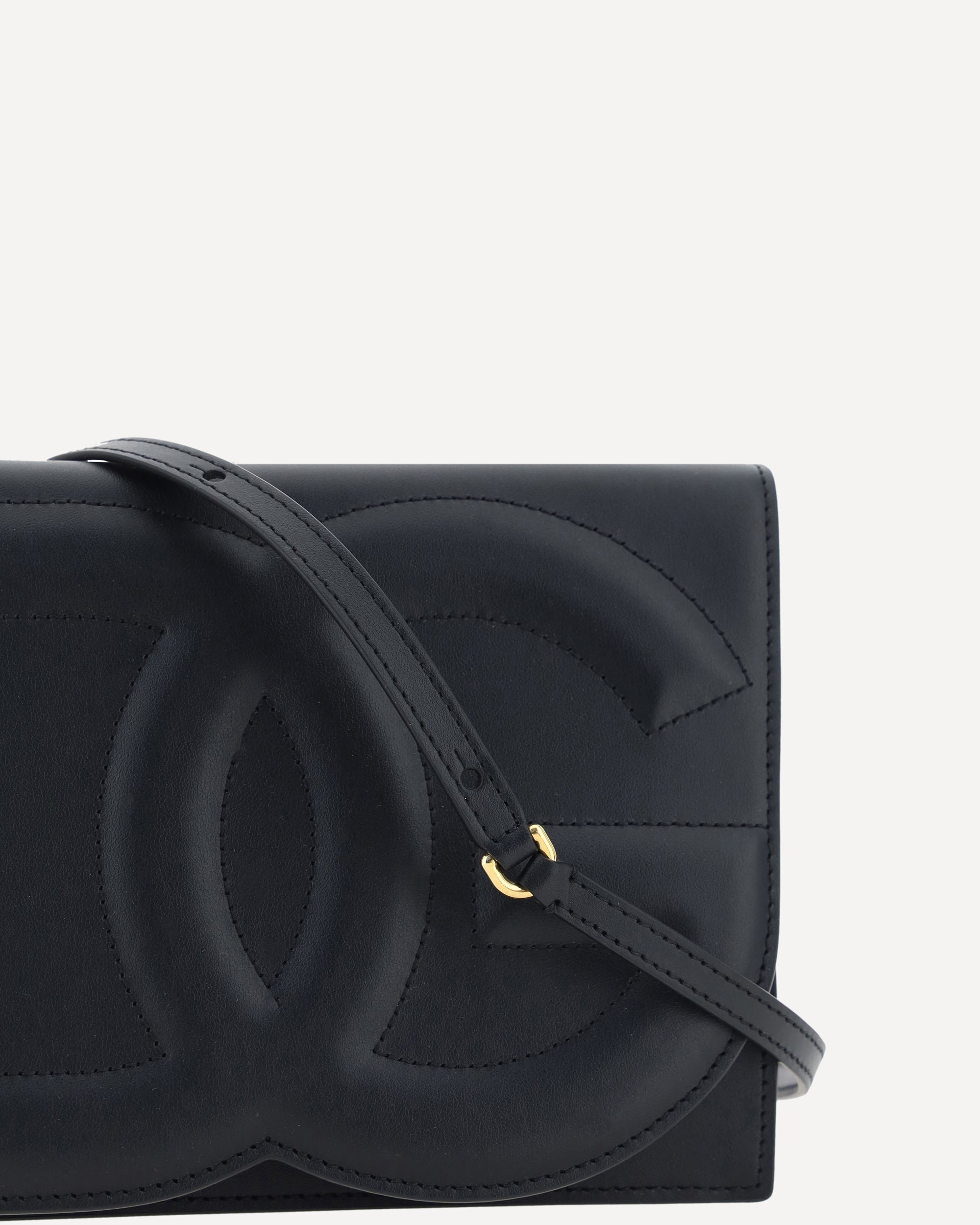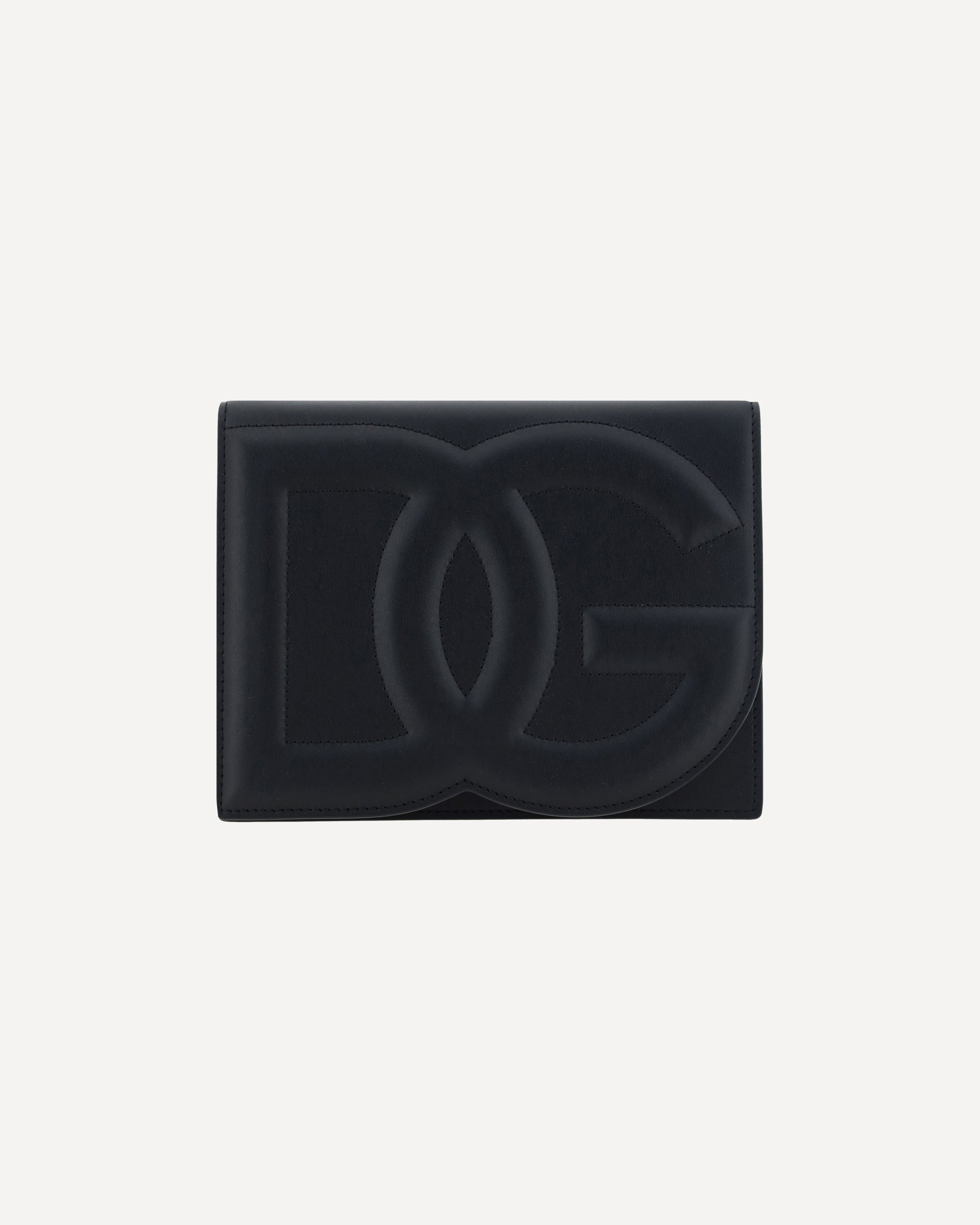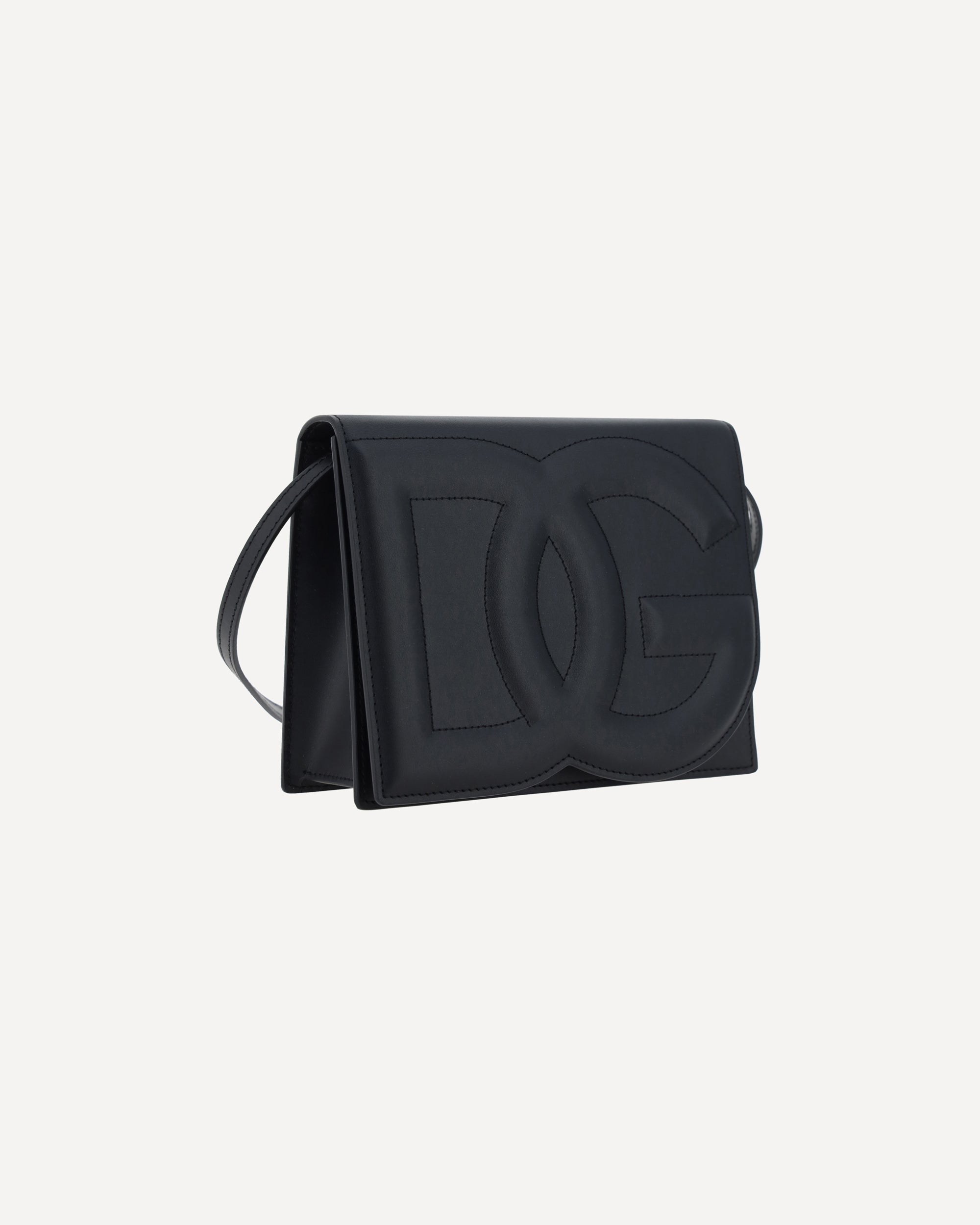 Calfskin Shoulder Bag by Dolce&Gabbana, maxi brand logo on front with tone-on-tone topstitching, front magnetic flap, flat leather shoulder strap, squared design, internal welt pocket.