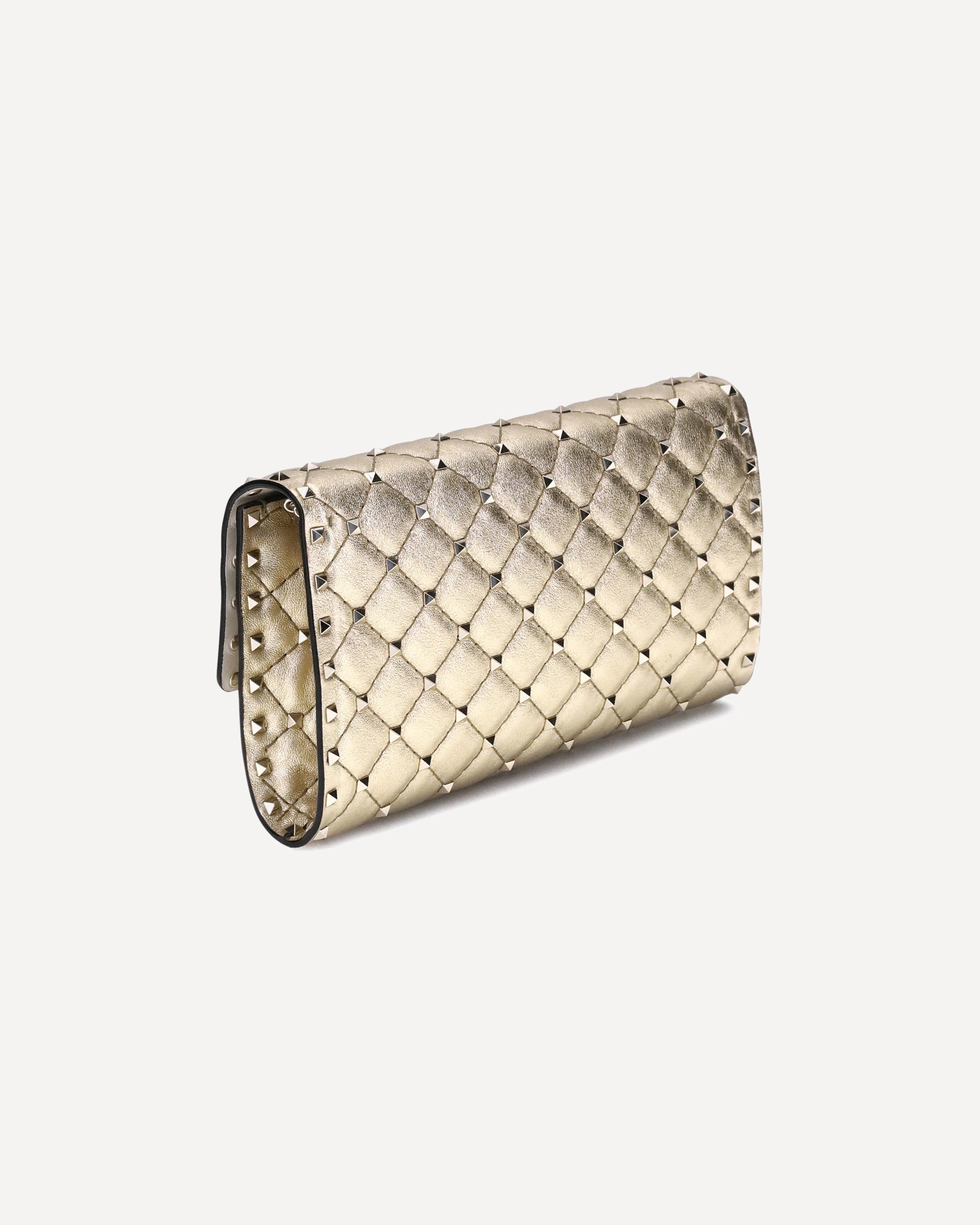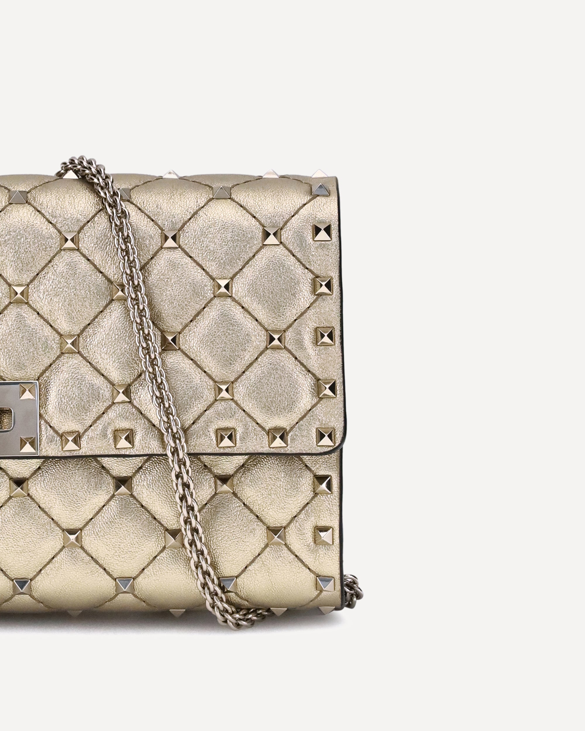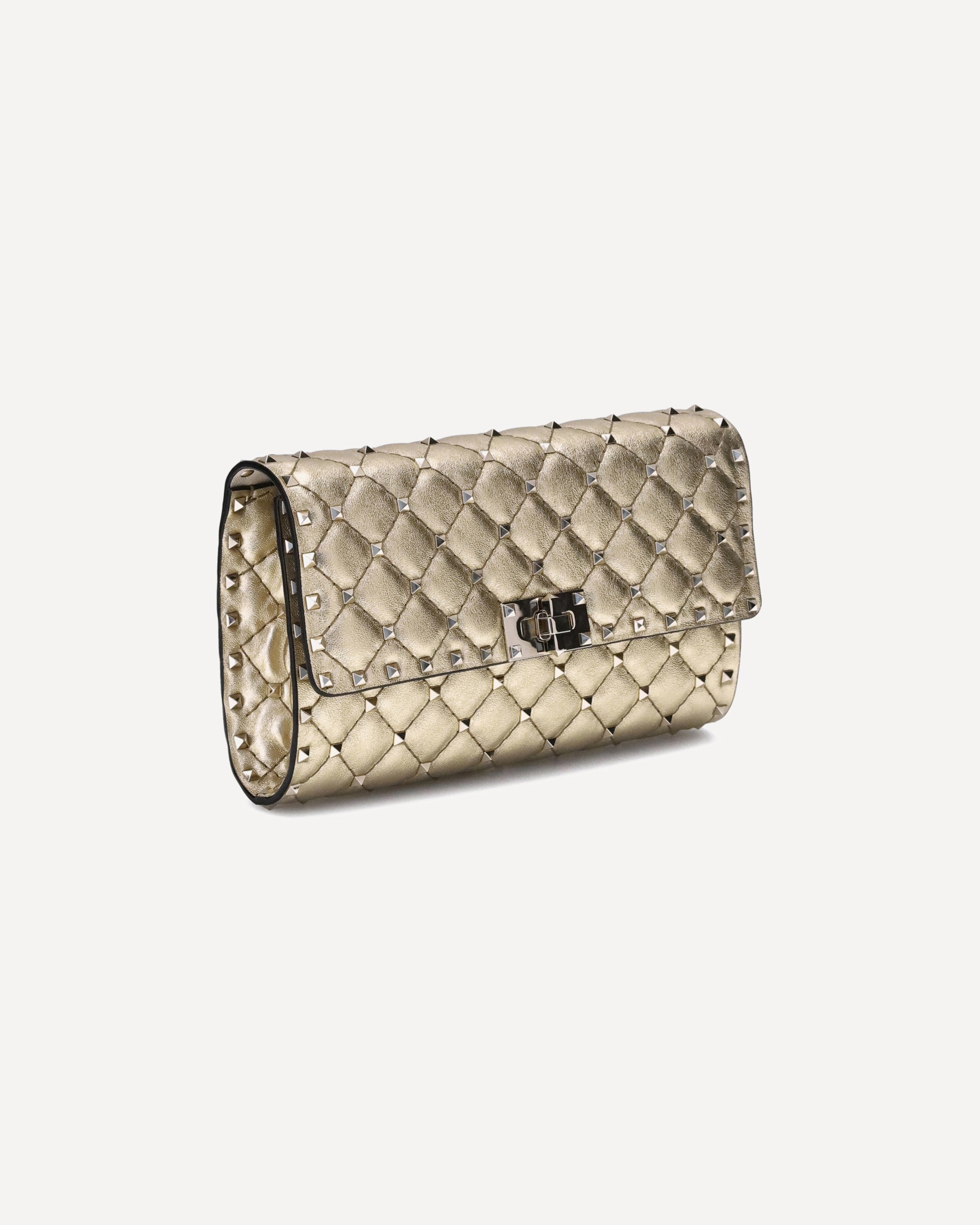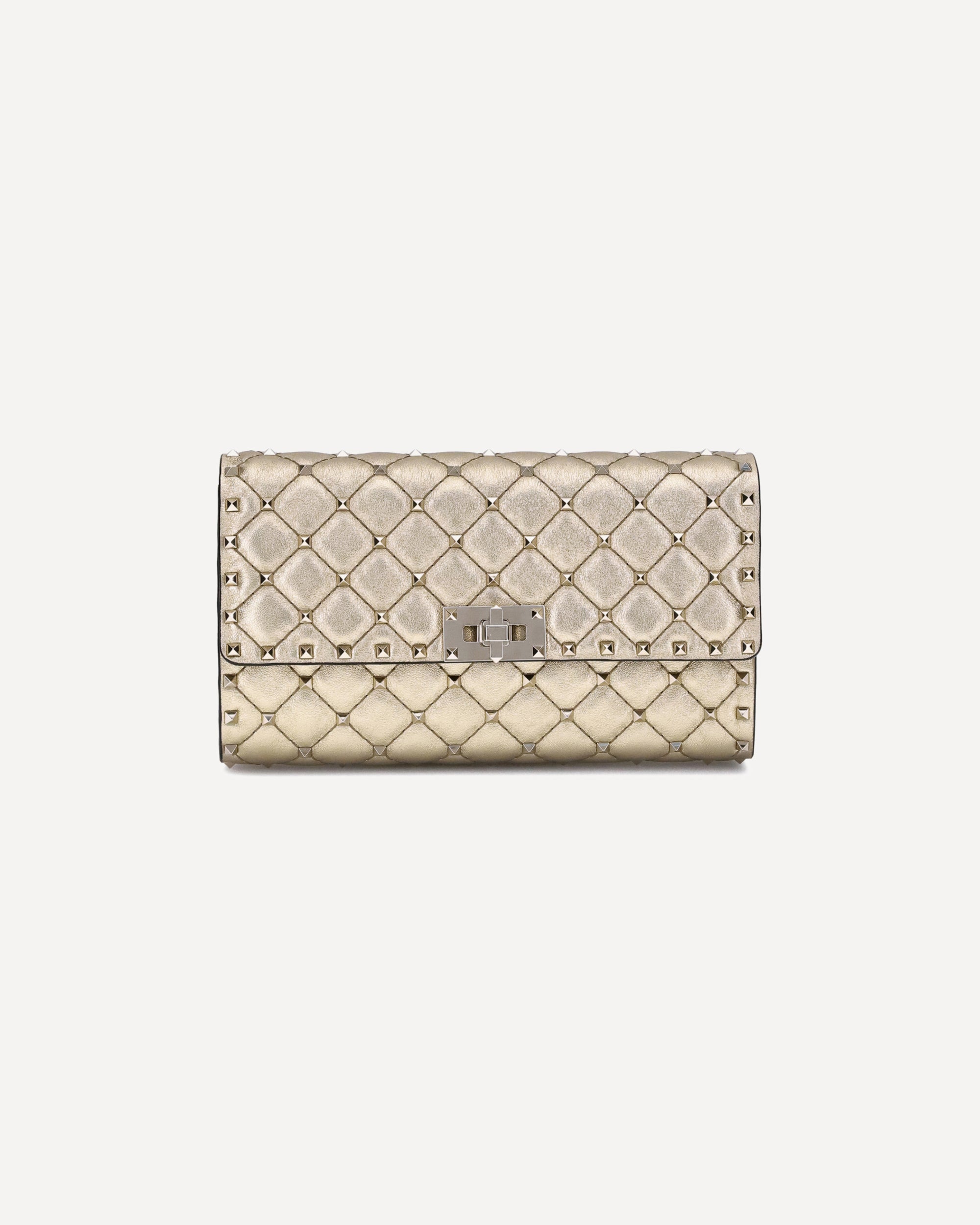 The Rockstud Spike Shoulder Bag by Valentino Garavani is an accessory with a strong and sophisticated character. Made with refined quilted workmanship and embellished with small studs, it combines elegance and rock attitude. Versatile in design, it can be worn on the shoulder, cross-body or hand-held thanks to the removable chain. The front flap and swivel closure completes the look with a distinctive and secure touch.