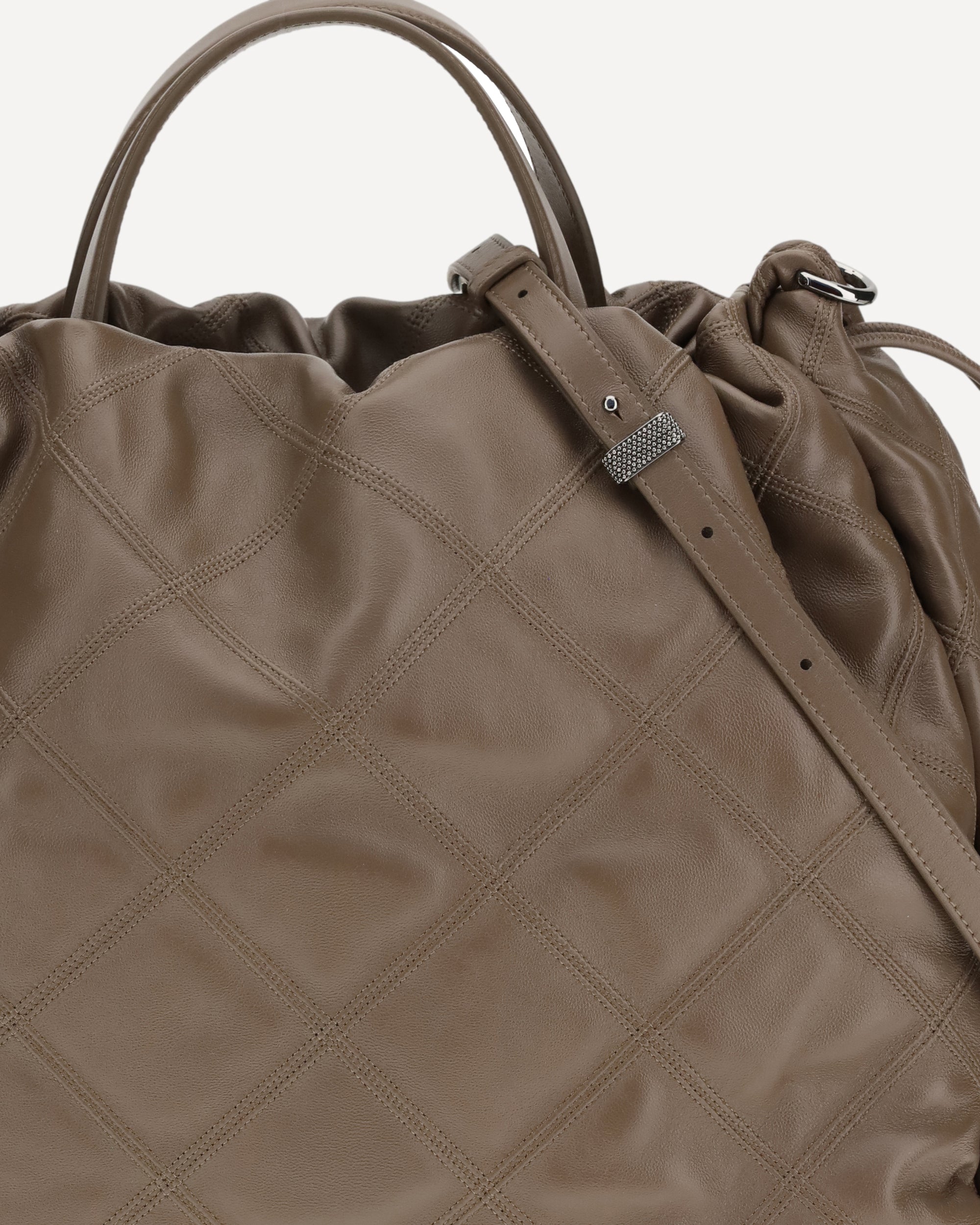 The large quilted Mellow Handbag by Brunello Cucinelli combines sophisticated elegance with everyday practicality. The drawstring closure and double handles, along with the adjustable and removable shoulder strap, offer versatility in use. The leather lining and interior zippered pocket provide functionality, while the nickel-free monile decoration adds a refined and secure touch.