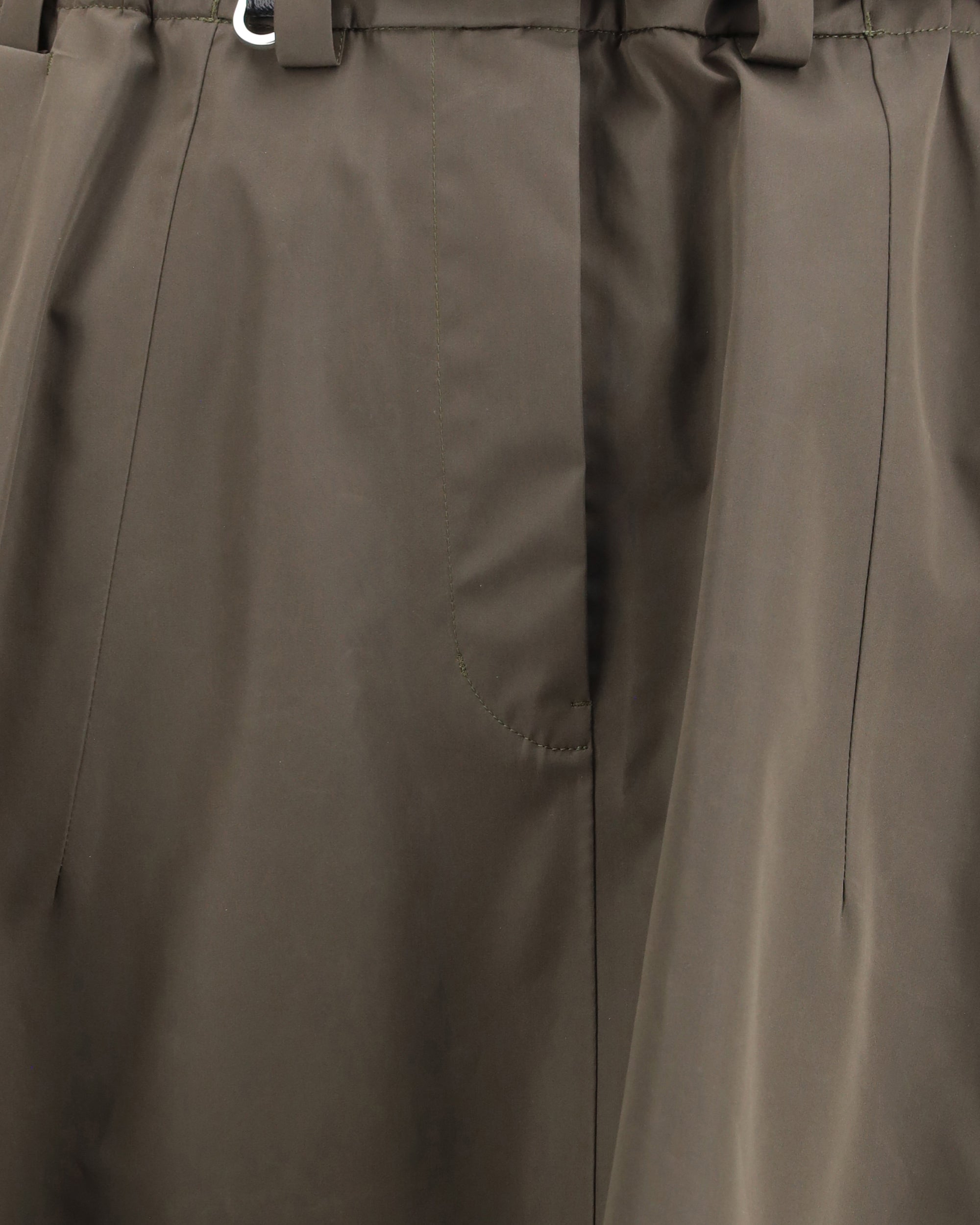 The nylon midi Skirt by Prada is an item that combines practicality and sophistication, combining technical materials with tailored details. Made of durable nylon, the skirt is unlined for lightness and comfort. A zipper and button closure, along with an elastic waistband, provide a comfortable and adjustable fit. Waxed zipper pockets add a functional and modern touch, while the buckled ribbon belt gives a distinctive detail. The sartorial label logo underscores the quality and care of the design, while the heat-sealed garment highlights the technical innovation typical of Prada's creative vision.