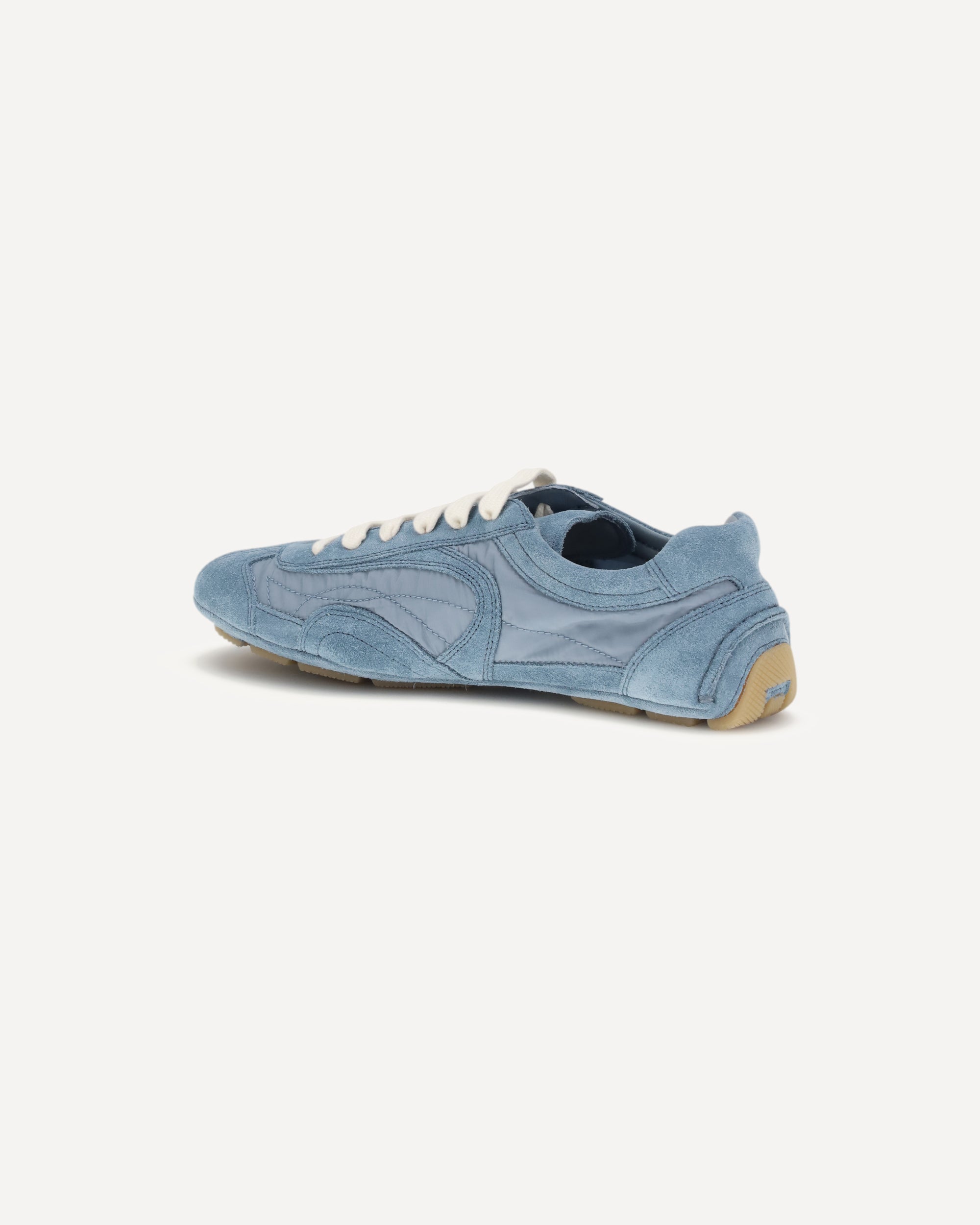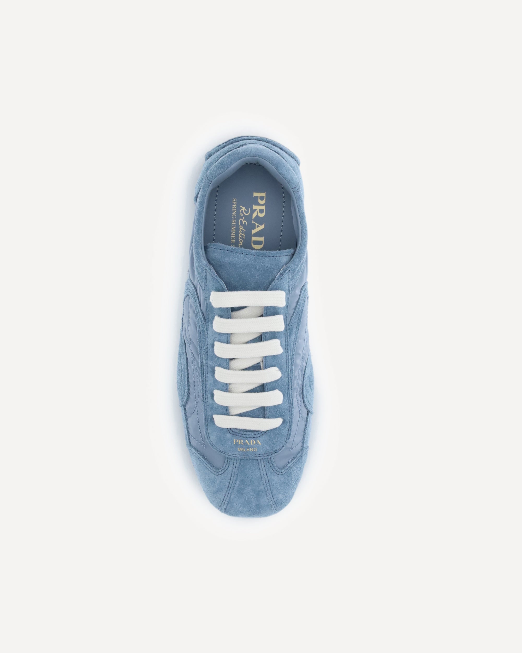The Montecarlo Re-Edition 2005 Sneakers by Prada revisit a model first introduced in 2005 for the Linea Rossa collection, blending style and comfort in a refined, contemporary design. This new interpretation features a soft, flexible upper crafted from suede leather and Re-Nylon, echoing the lightweight spirit of classic driving shoes. The silhouette is defined by its deconstructed rubber soles, which give the sneaker a linear aesthetic and an exceptionally light feel. Leather inserts, a Prada Milano printed logo, and flat laces complete the design, while the removable leather-lined insole ensures comfort and practicality. The lightweight rubber sole, with small blocks emerging slightly from the upper, adds a distinctive technical touch.