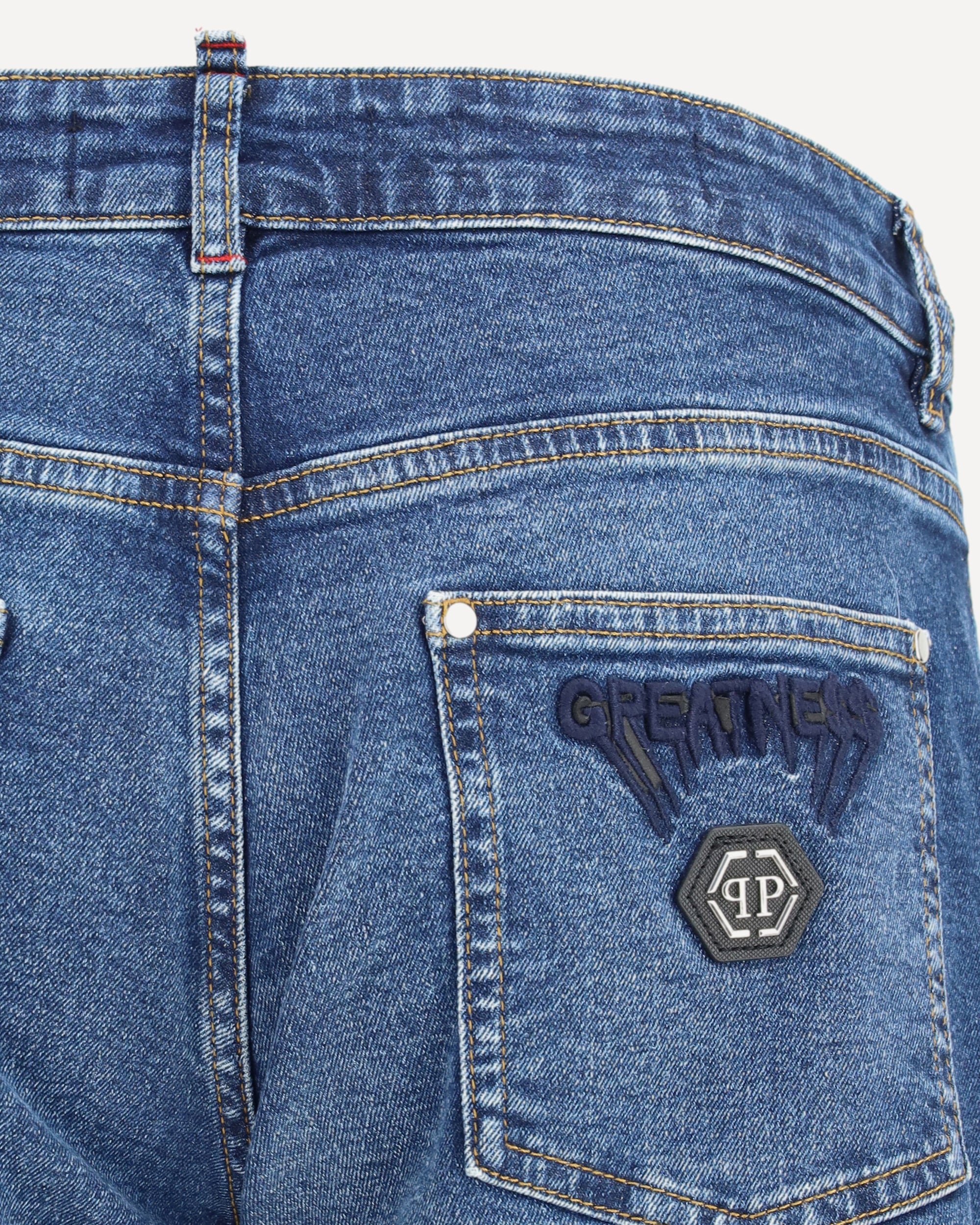 The Super Straight Cut Jeans by Philipp Plein reimagine the classic five-pocket design with the brand’s bold attitude. Crafted from distressed denim, they feature a stitched back label and a metal button-adjusted waistband. The Super Straight fit delivers a clean, contemporary silhouette that perfectly embodies Plein’s signature blend of edge and sophistication.