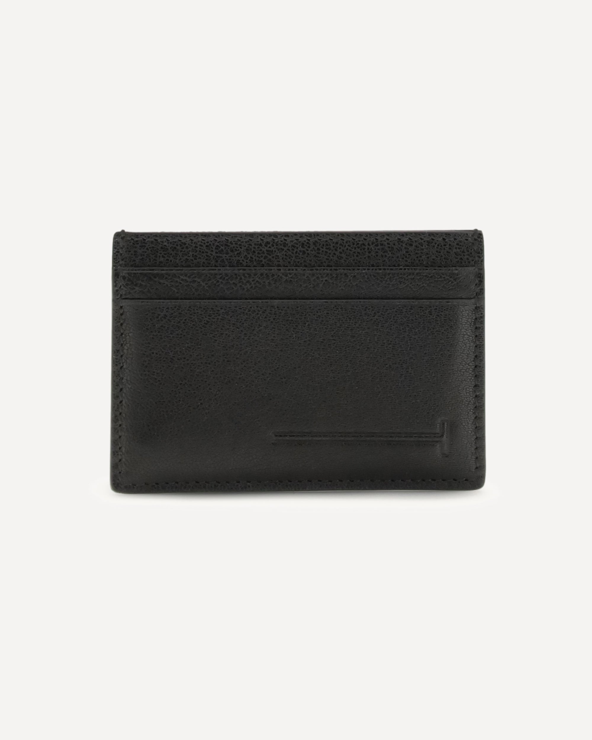 The leather Card Holder by Tom Ford combines essentiality and style in a compact format. Made of high-quality leather, it features an elegant embossed logo on the front and the brand's signature on the back. The interior is organized with four card slots and a central pocket, perfect for storing cash or documents, offering functionality without sacrificing sophistication.