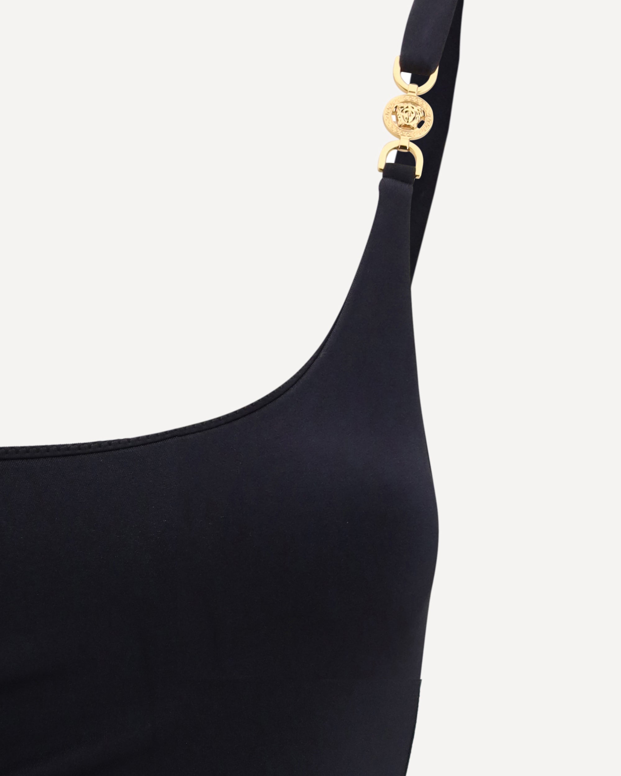 The Medusa ’95 Gathered Swimsuit by Versace pays tribute to Greek mythology through one of the house’s most recognizable emblems: the Medusa head. Featured as gold-tone hardware, it highlights the silhouette and defines the swimsuit’s unmistakable identity. The gathered detailing adds softness and sensual movement, while the unpadded top maintains a clean, natural look. A high-cut leg elongates the figure, delivering that bold, signature Versace attitude.