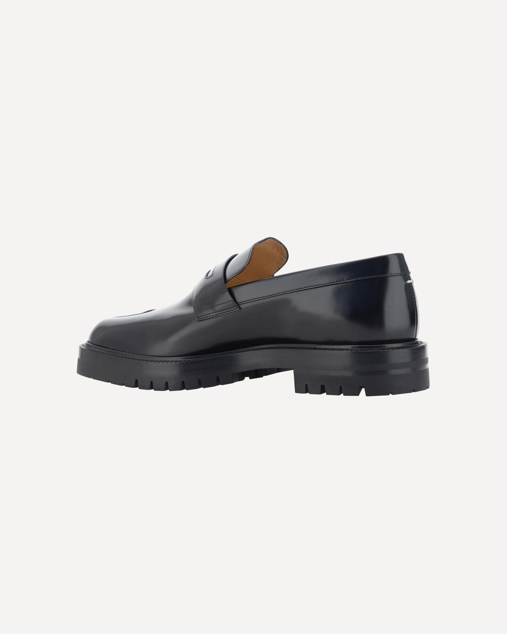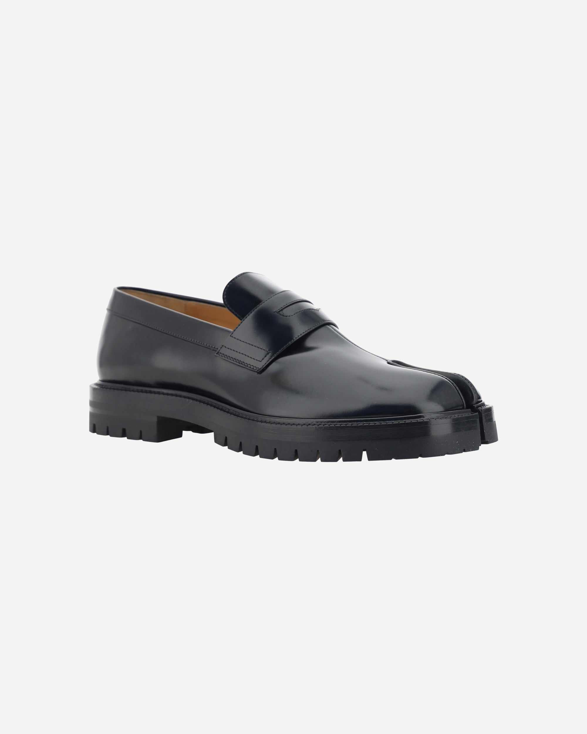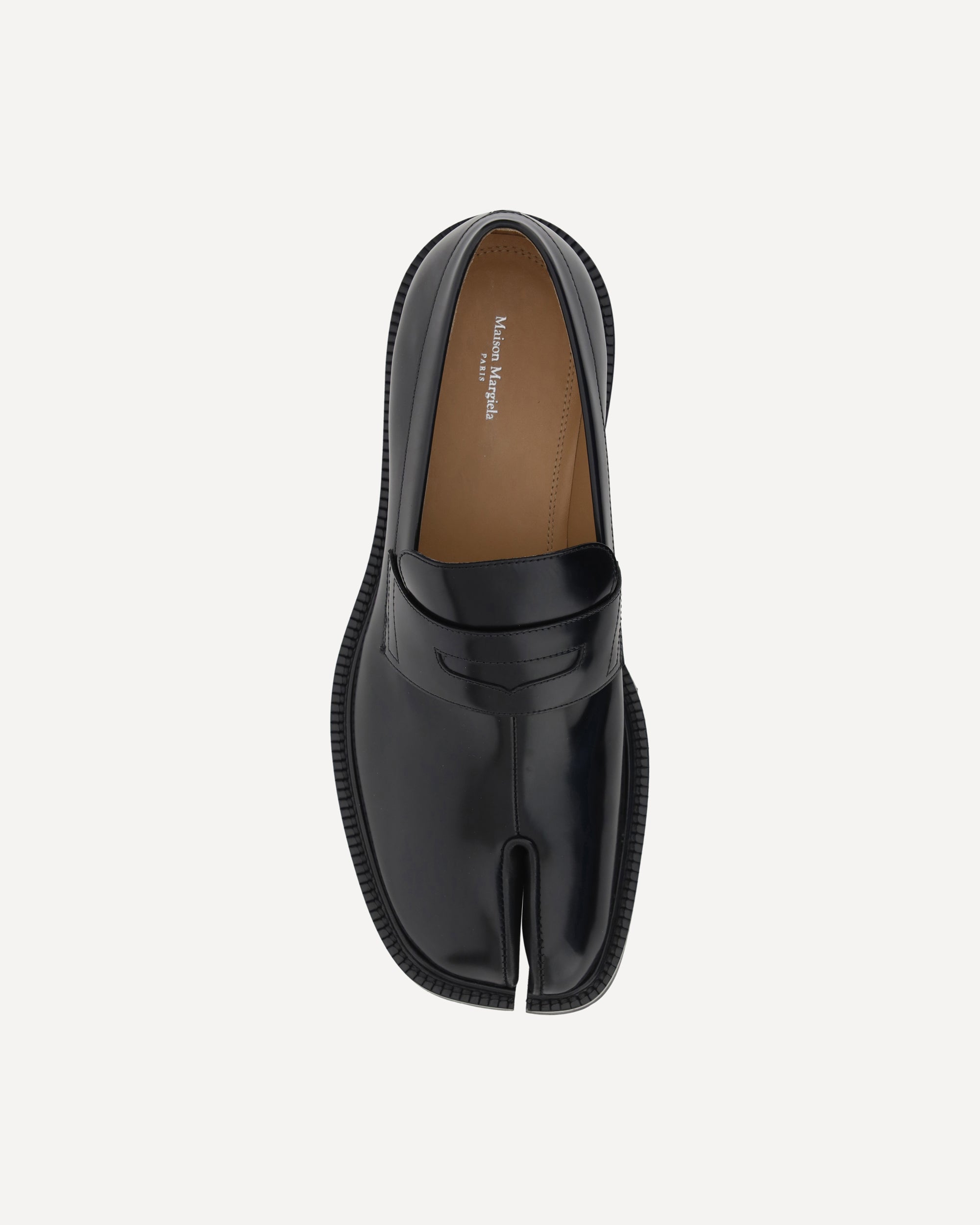 Calfskin Tabi Loafers by Margiela, iconic Tabi almond toe on front, block heel and non-slip sole, leather front tray.