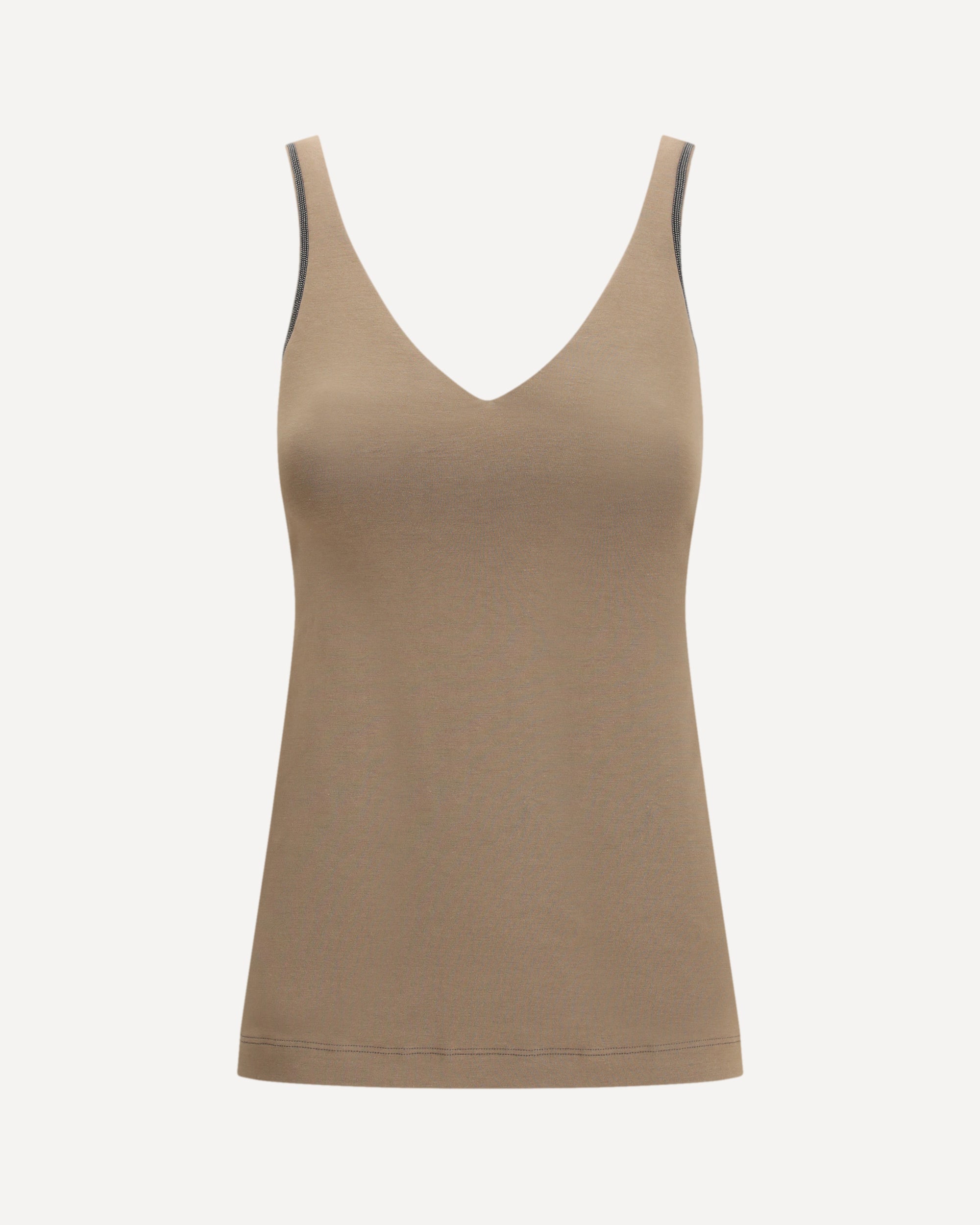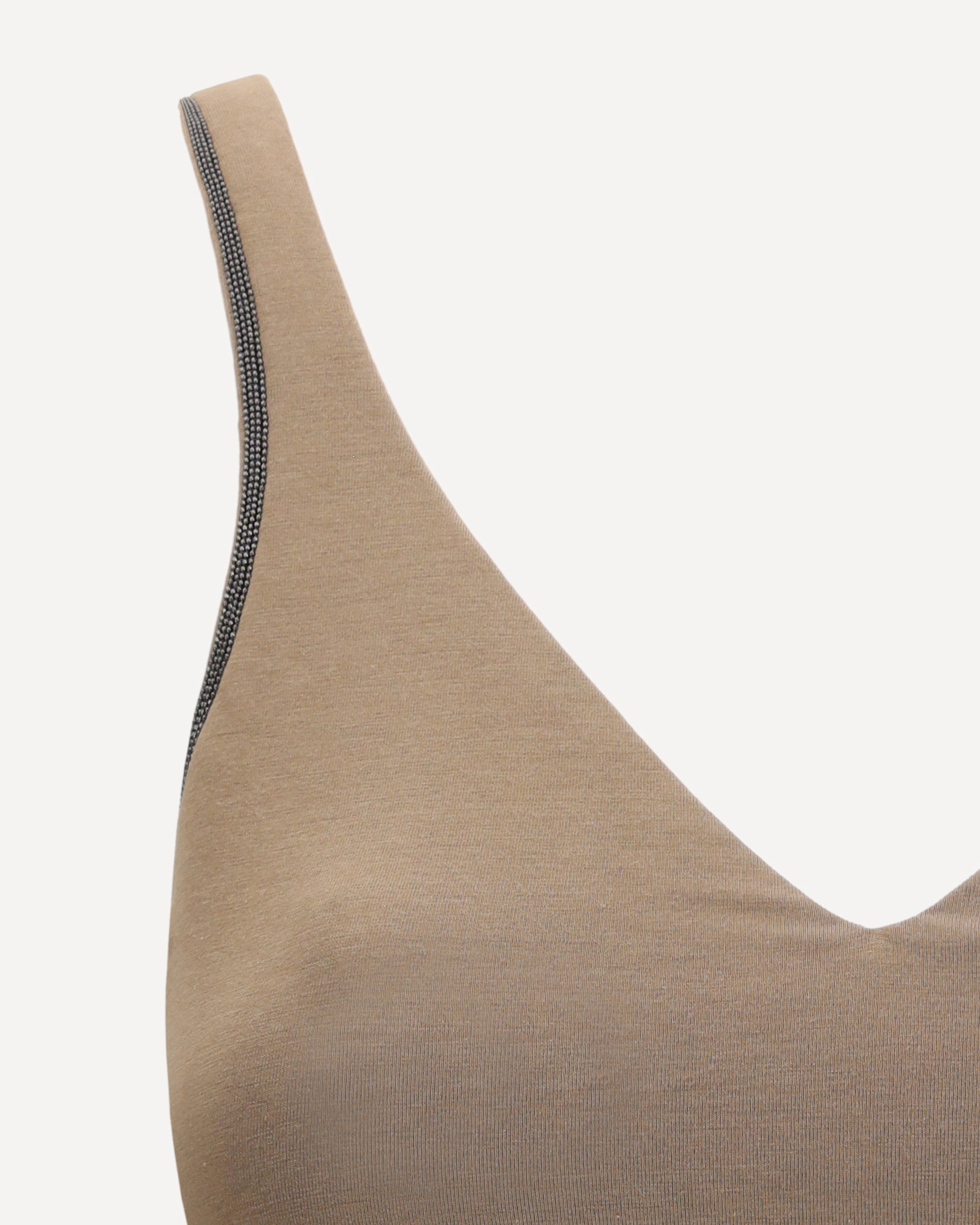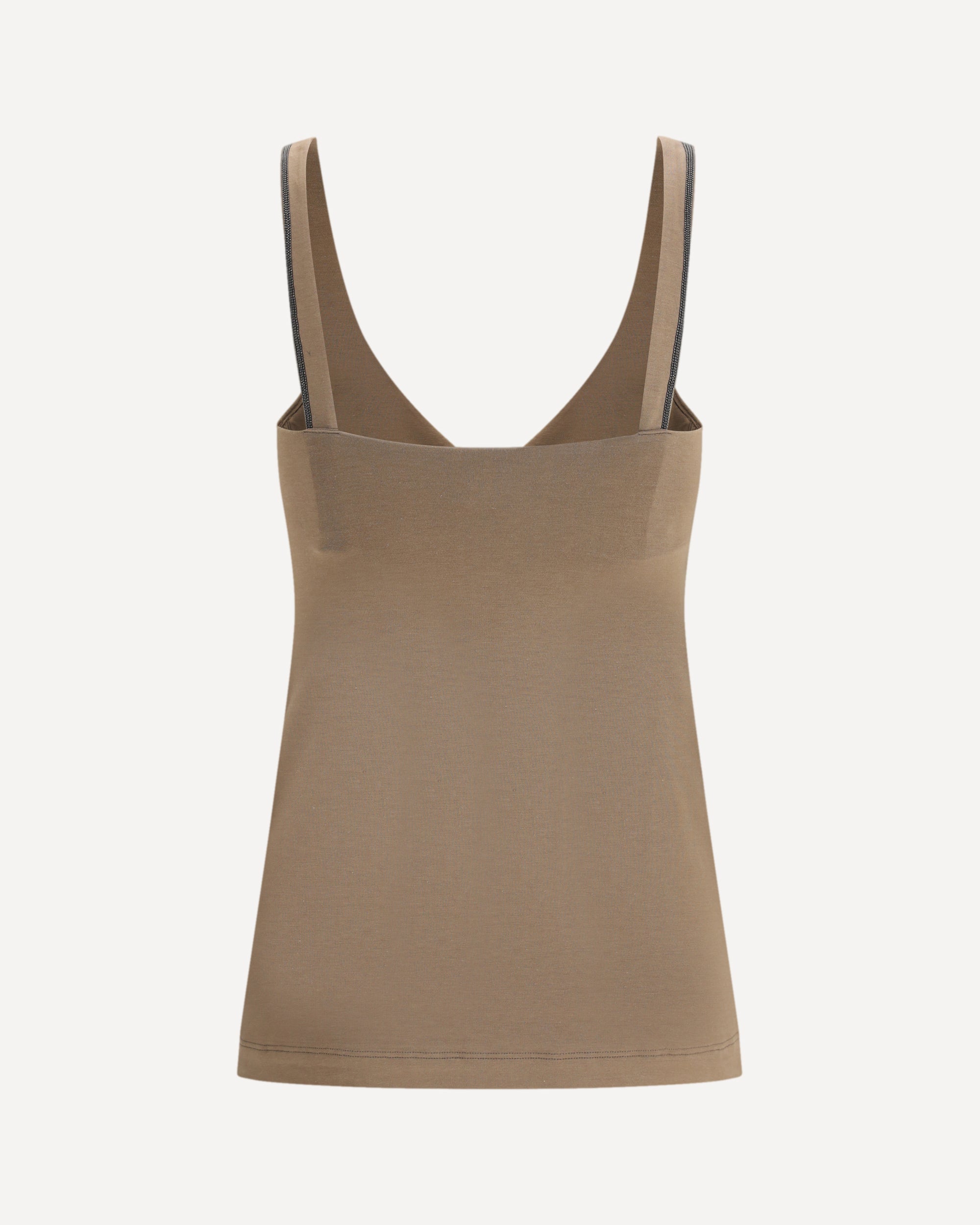 The cotton Top by Brunello Cucinelli is an elegant and refined piece perfect for sophisticated summer looks. The sleeveless design and V-neckline on the front create a feminine, lightweight silhouette, while the thin straps, embellished with the brand's iconic shiny jewels, add a touch of luxury and originality. The structured round chest ensures a comfortable and defined fit. With a monochrome pattern, this top is easy to pair with a variety of outfits, while the regular fit ensures all-day comfort.