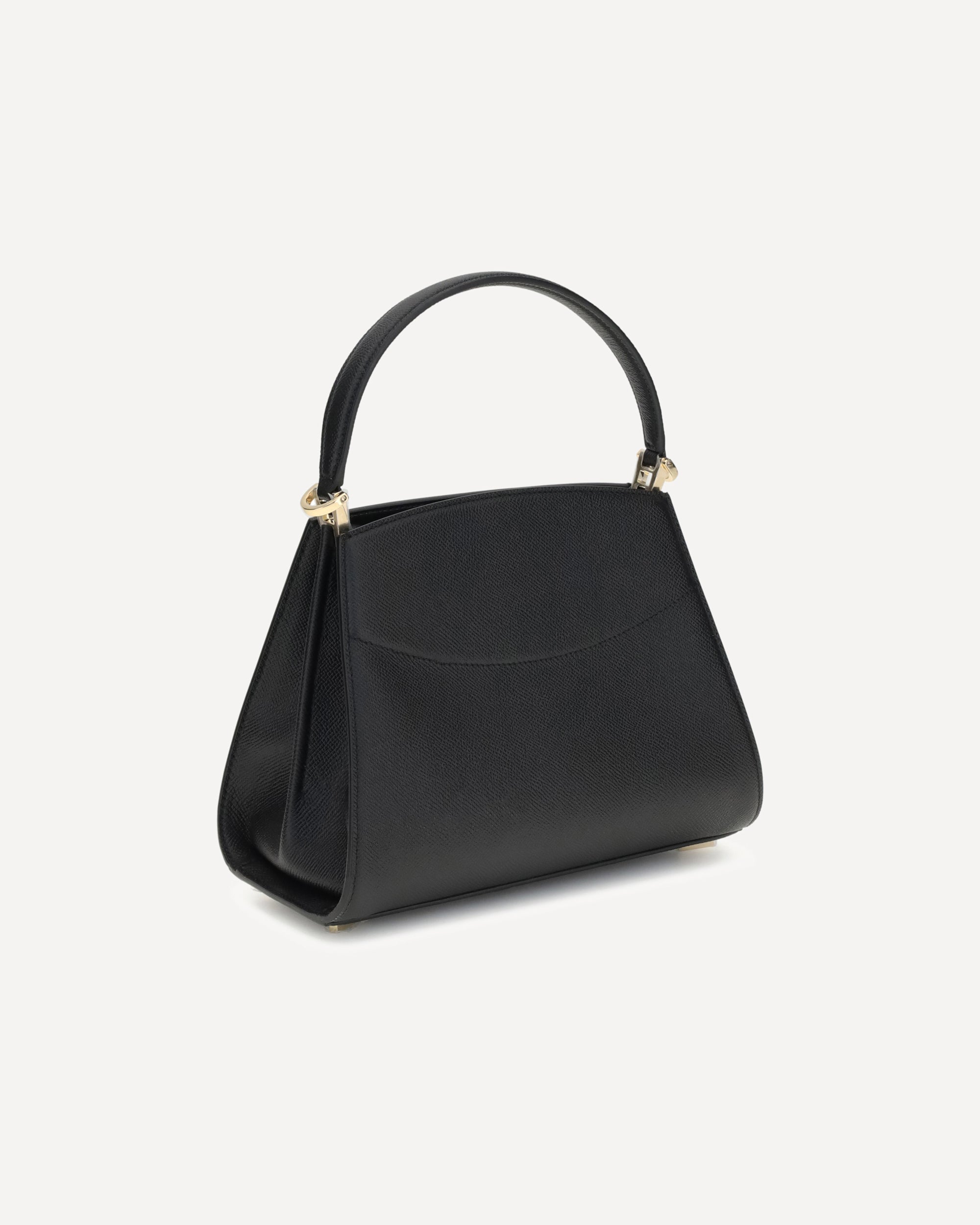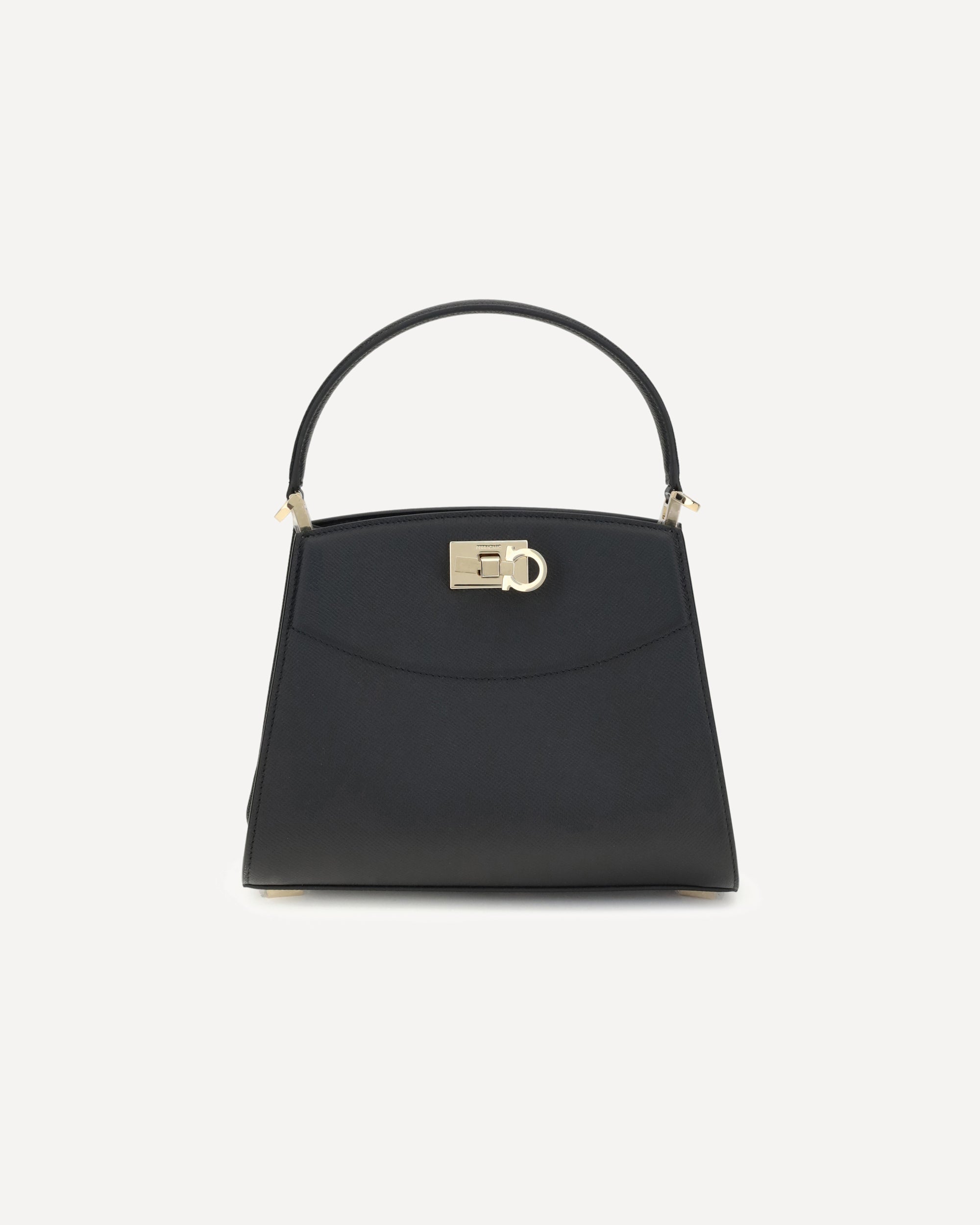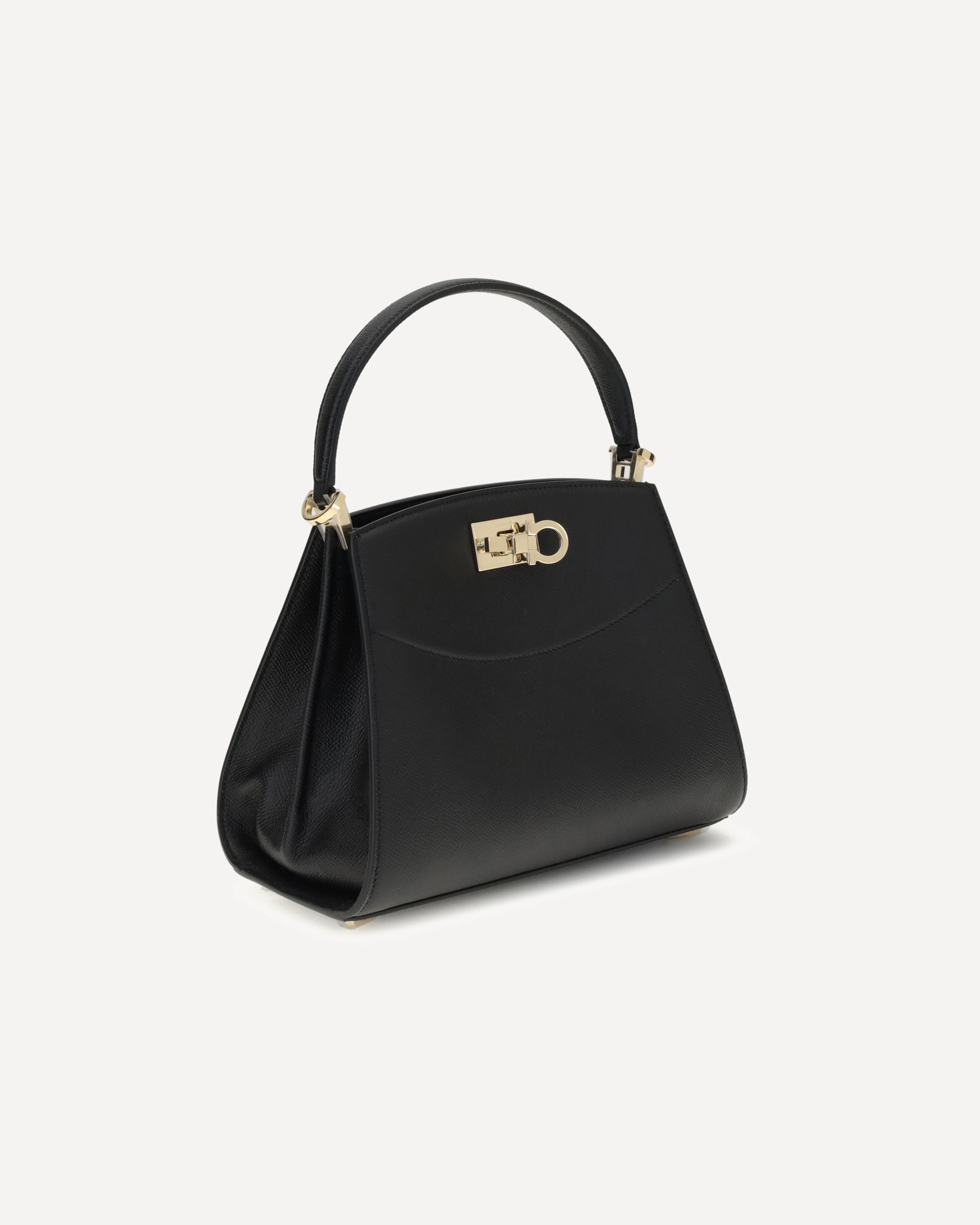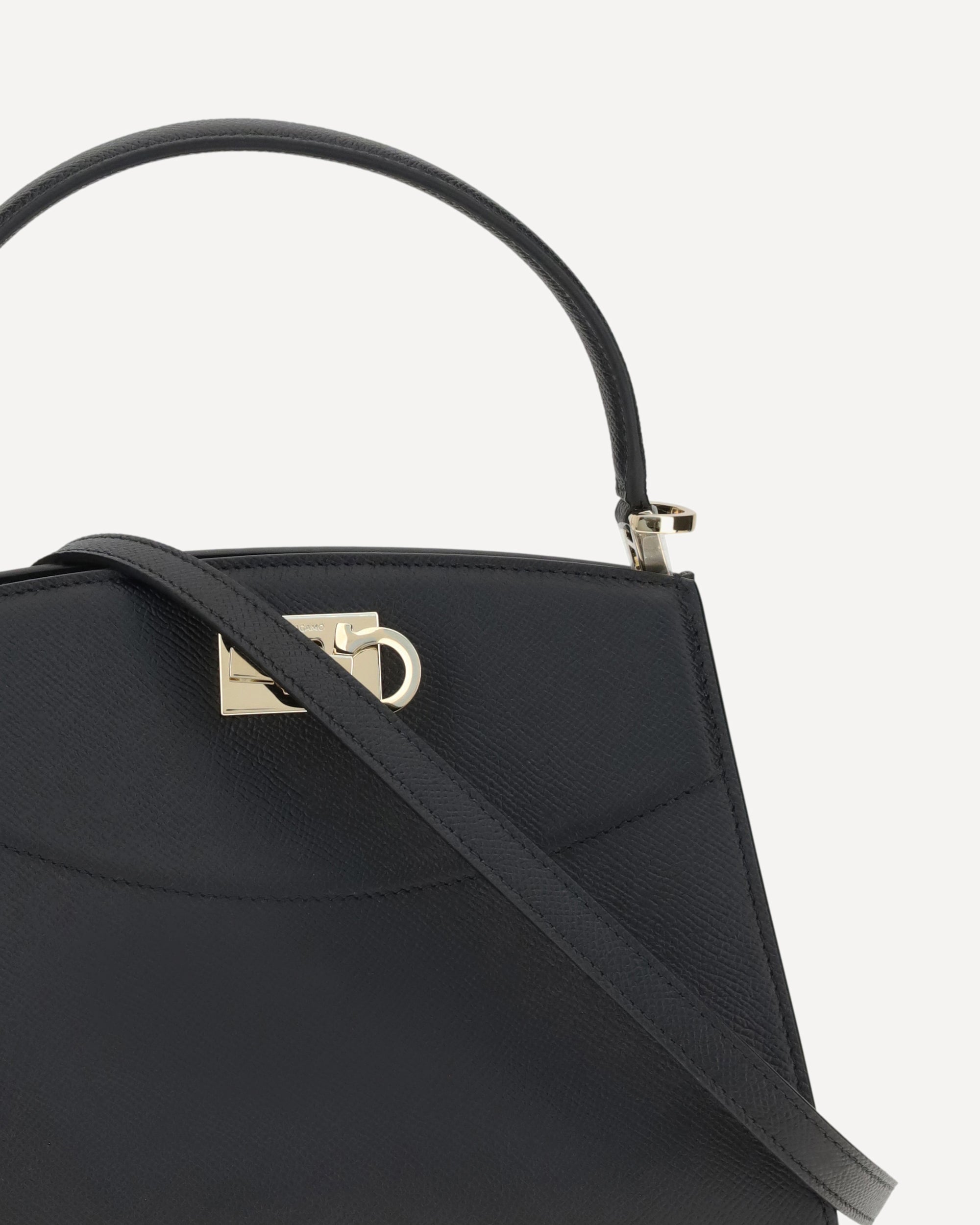 Ferragamo's Studio Box Bag combines structured elegance and iconic details of the Maison. With trapezoid lines and a ladylike allure, it is embellished with rounded stitching on the front and the Gancini slider closure, the brand's distinctive symbol. The lined interior, organized into two compartments, offers functionality and organization. The semi-rigid handle and adjustable, removable shoulder strap allow it to be carried either by hand or over the shoulder, for a versatile and sophisticated style.