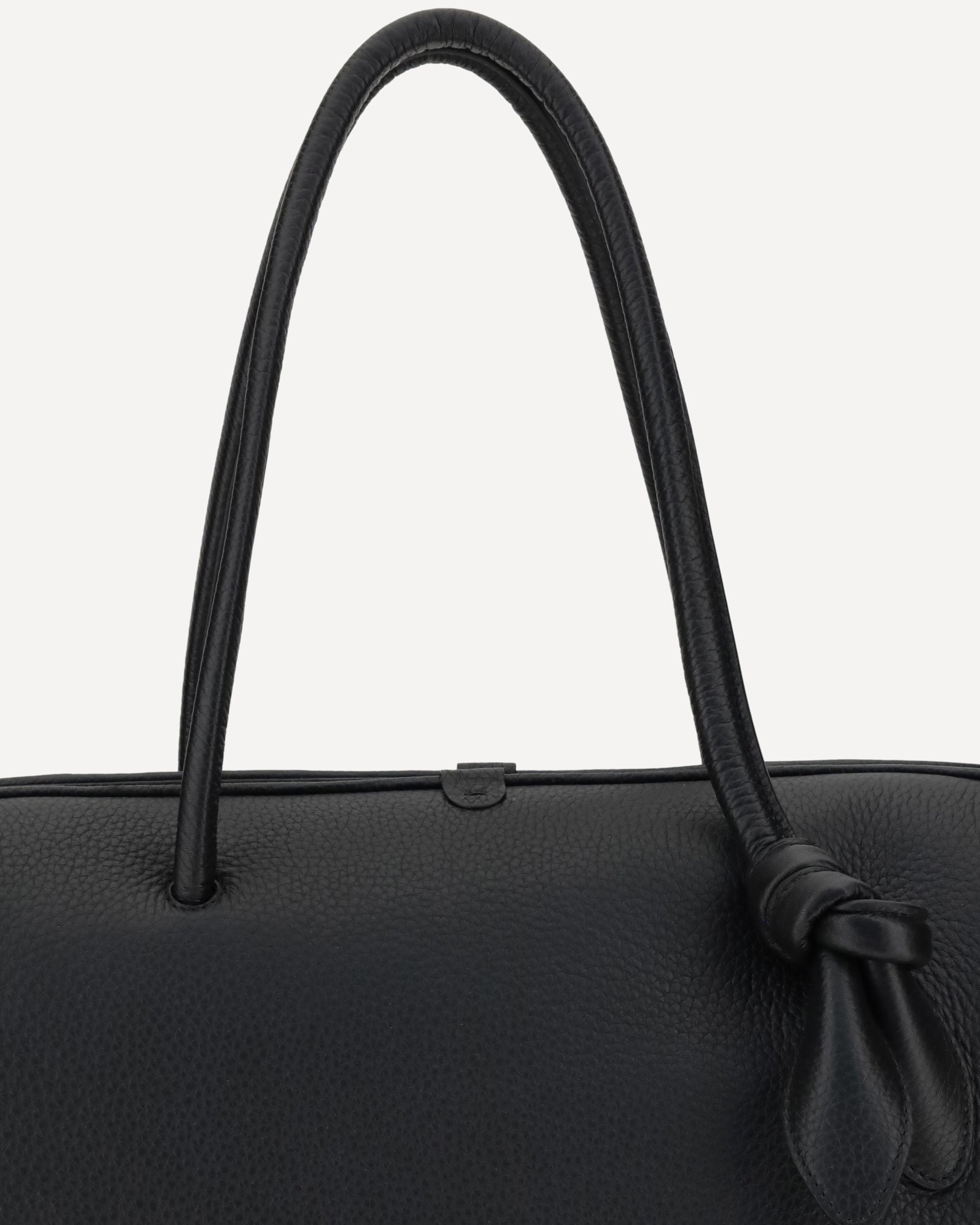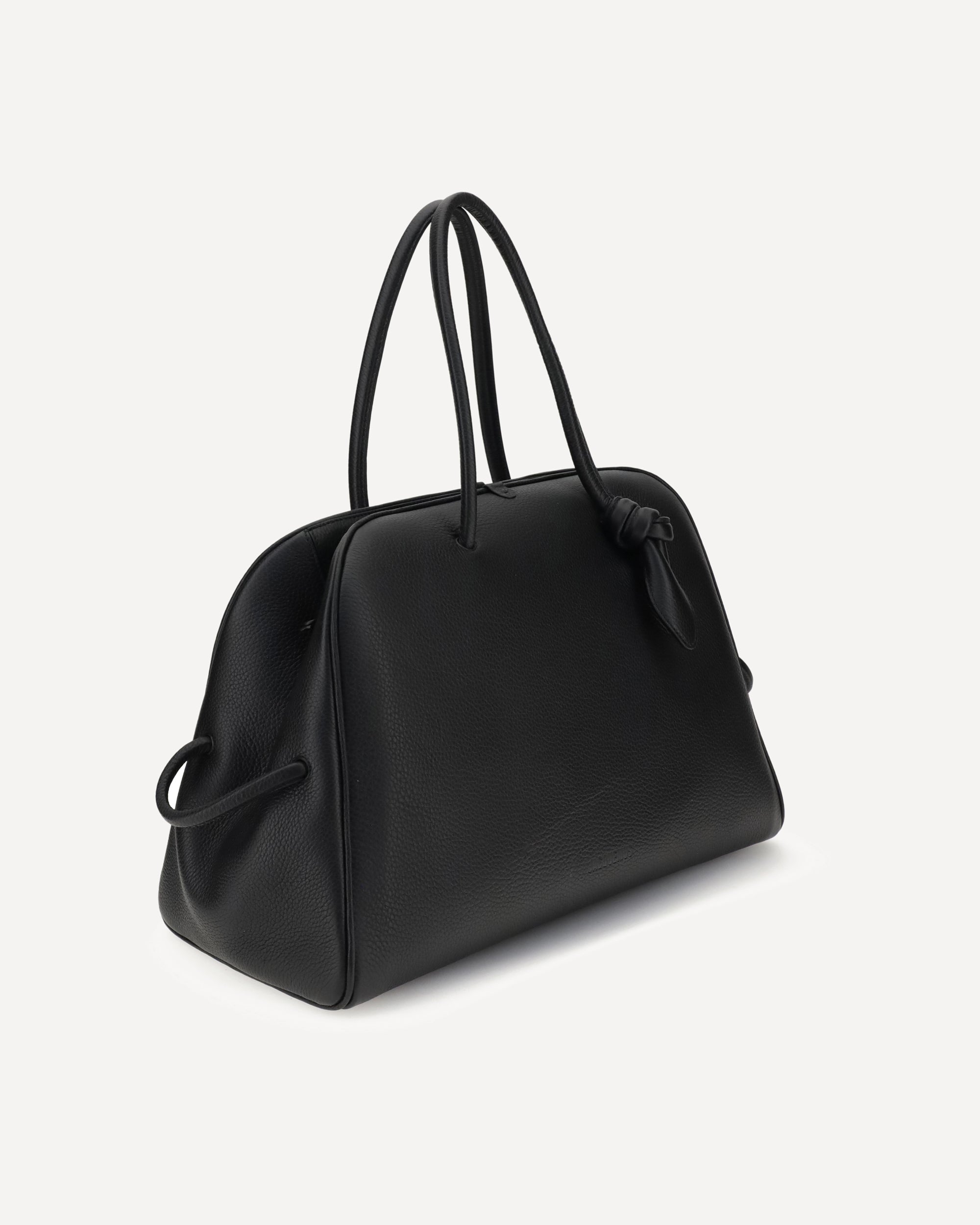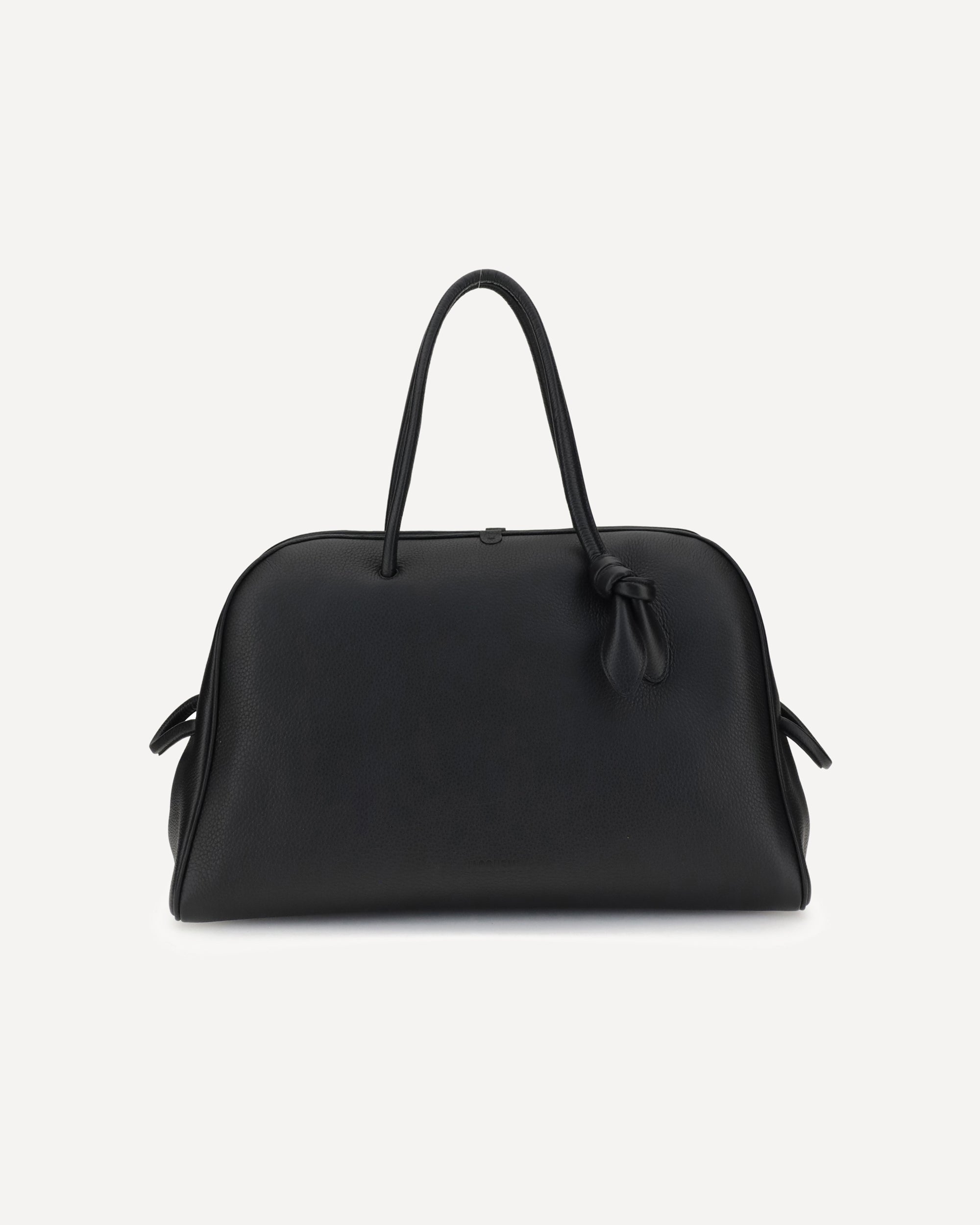 The Le Grand Tourisme Travel Bag by Jacquemus reinterprets the classic bowling bag in a modern and sophisticated key. Made of grained leather, it features a structured and functional design with a two-way zipper closure, interior zipper pocket and a large patch pocket on the front. The bow detail, the Maison's poetic signature, adds a distinctive and feminine touch. Perfect for weekend getaways or as an elegant carry-on.