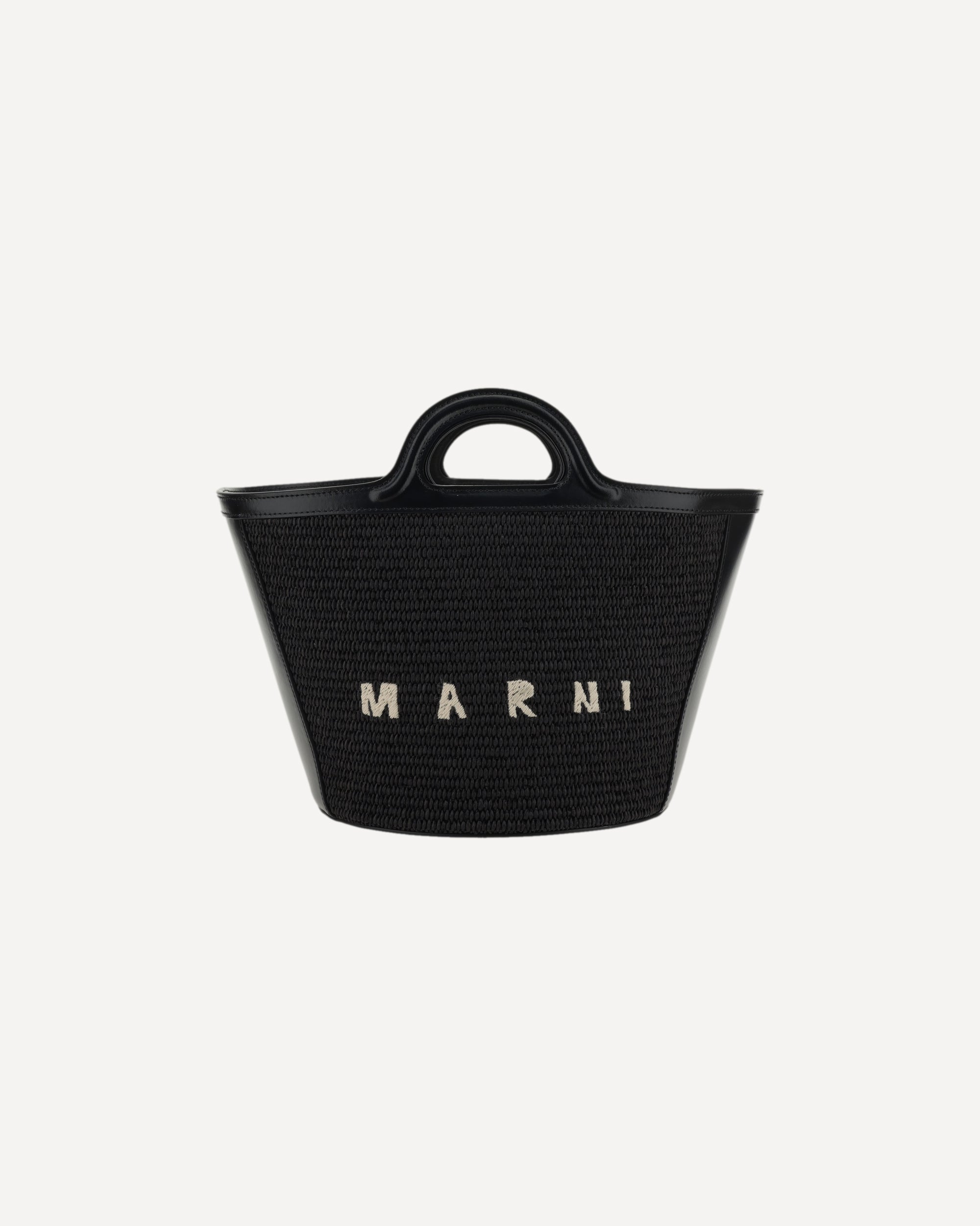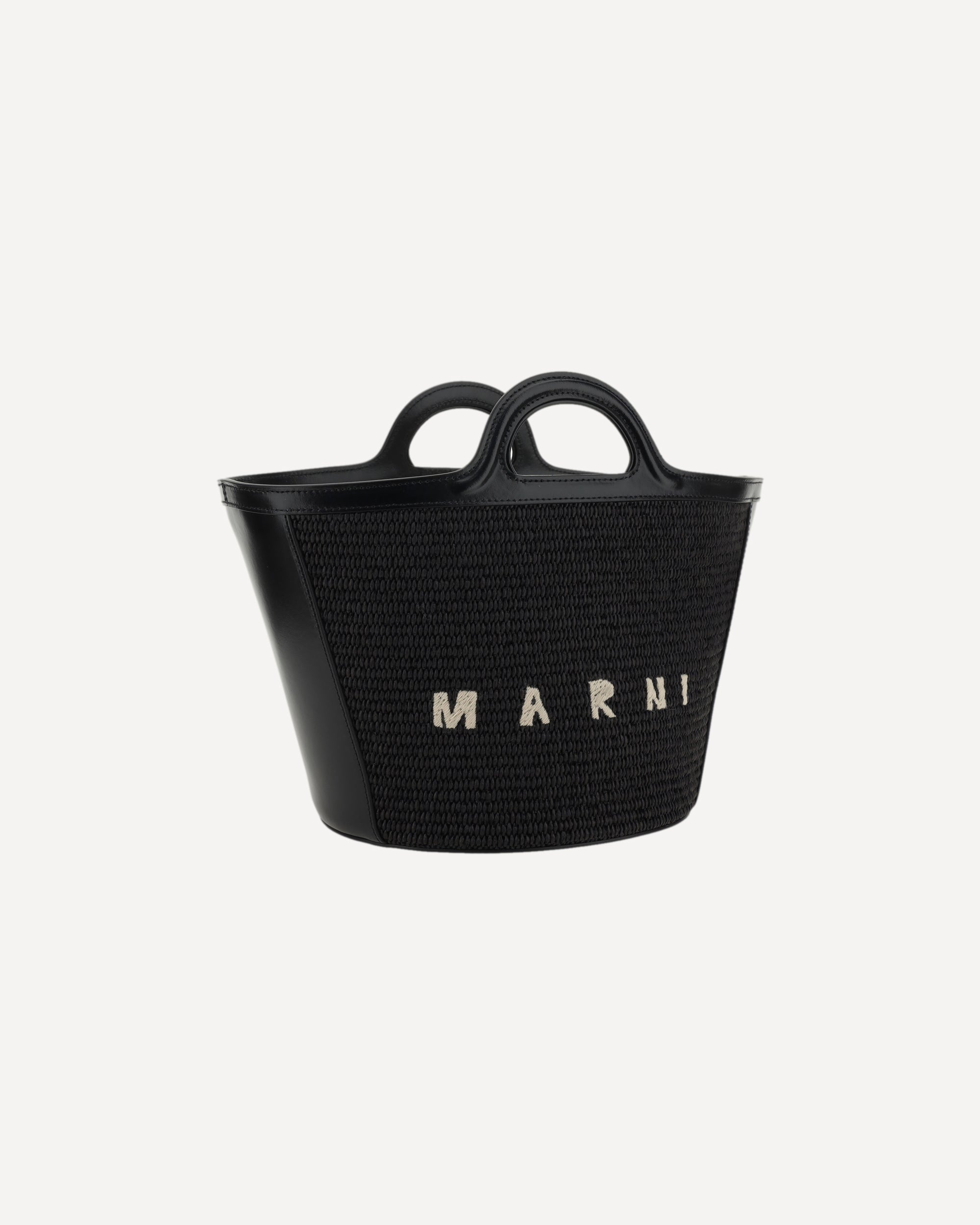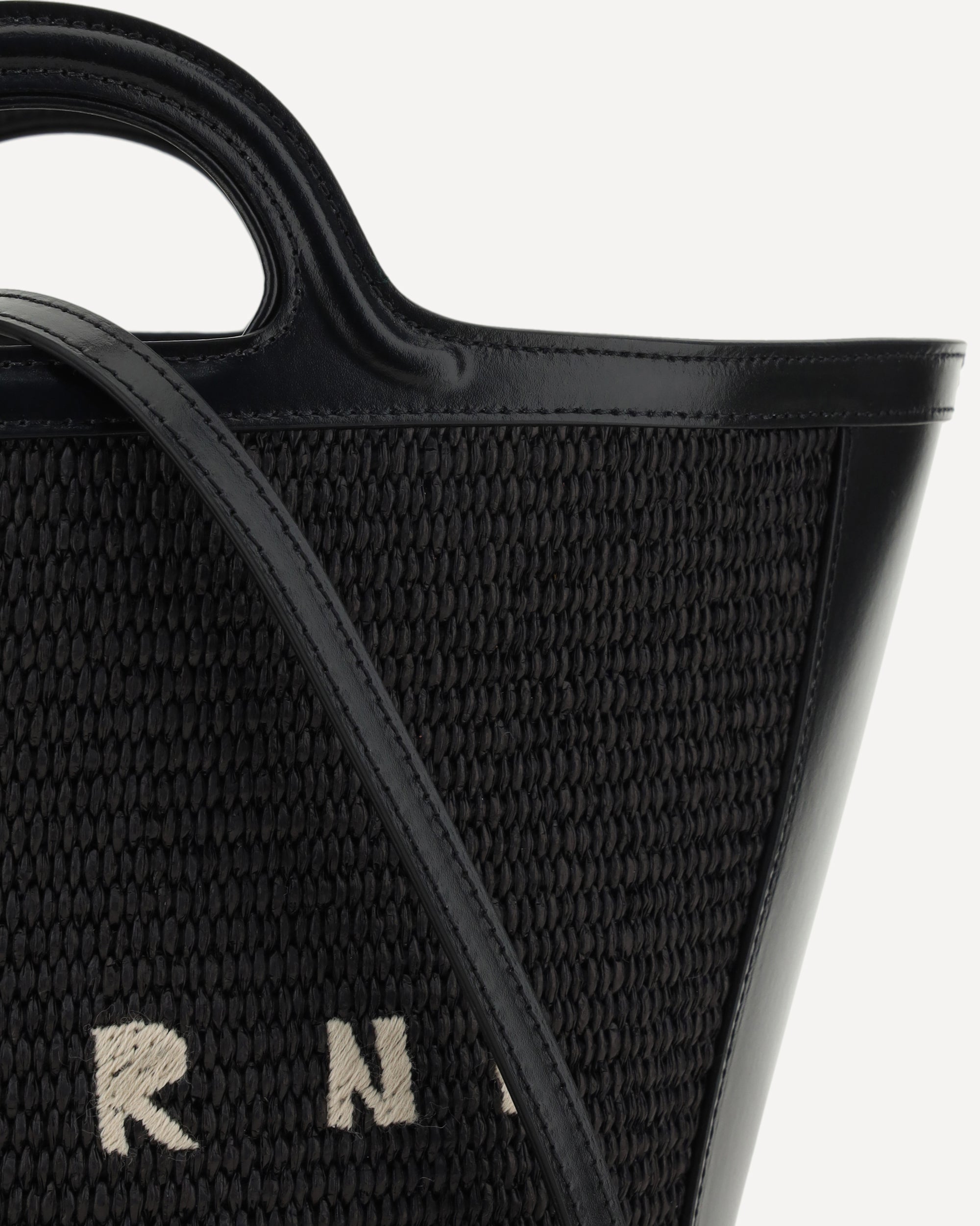 Tropicalia Bucket Bag by Marni, all-over raffia design, contrasting leather trim and details, double round and fixed leather top handles, adjustable flat shoulder strap, interior drawstring closure, matching fabric lining, iconic brand monogram embroidered in contrasting color on the front, interior zipper pocket.