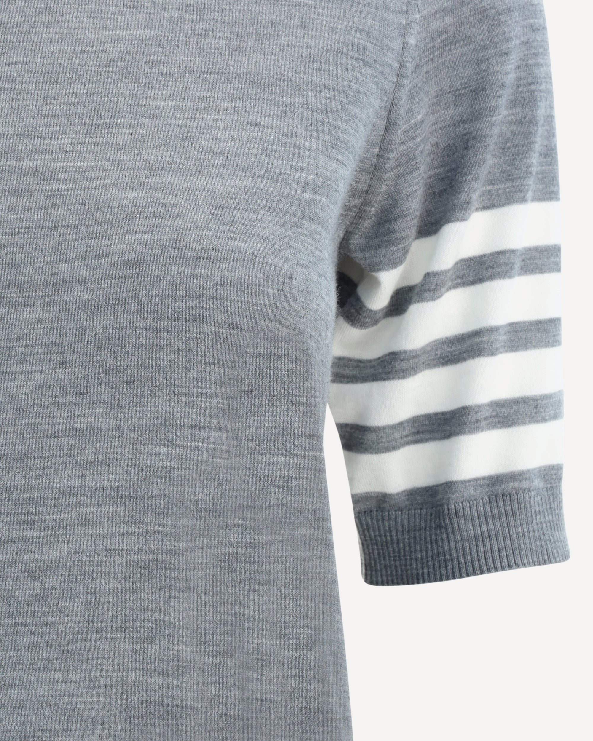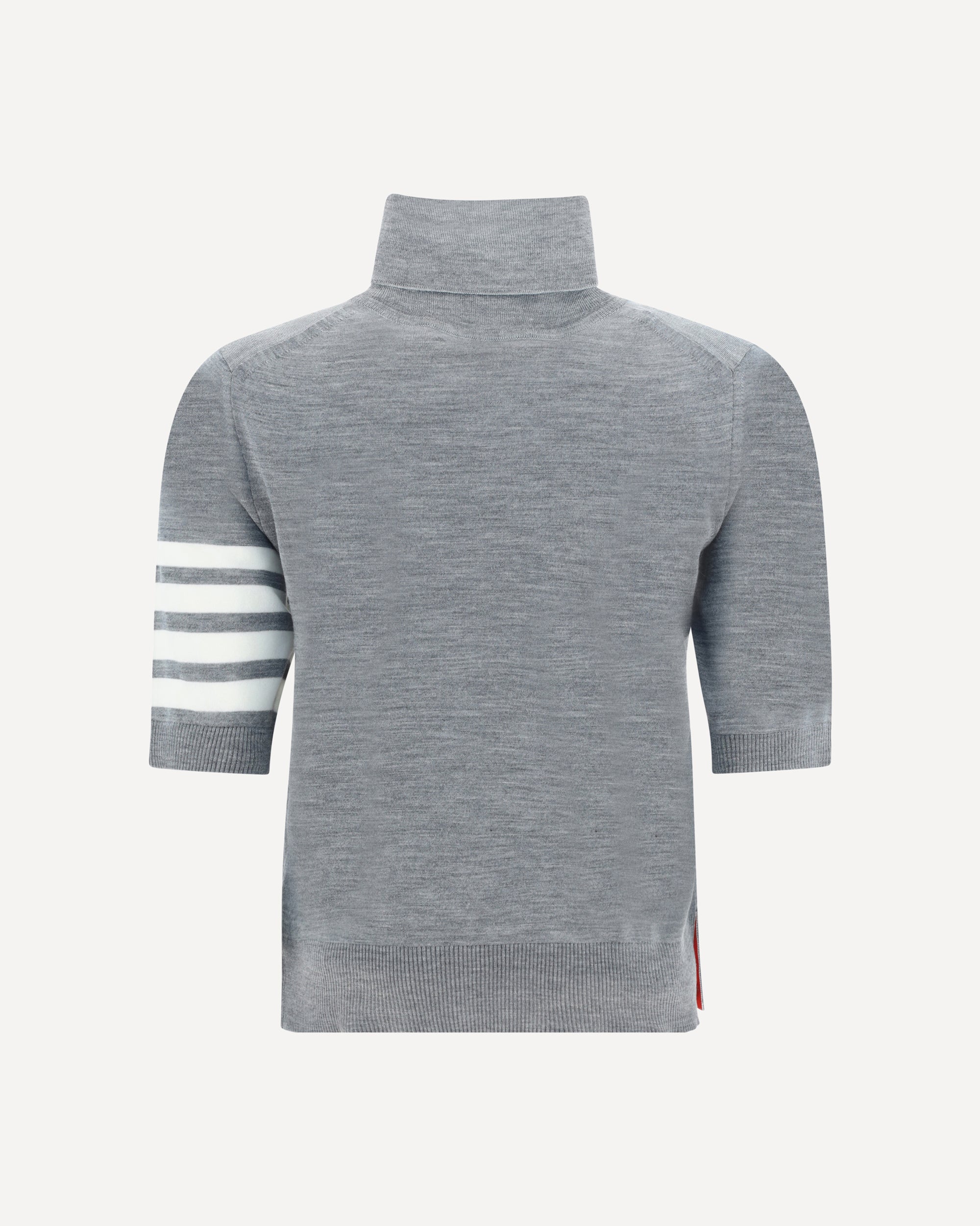 Thom Browne's Virgin Wool Turtleneck Sweater is a refined and sophisticated piece that combines elegance with distinctive details. With a ribbed turtleneck and short sleeves, it features a monochrome pattern enhanced by contrasting hems. The brand's iconic bands on the left sleeve and the ribbed hem with slight side slits add a touch of originality.