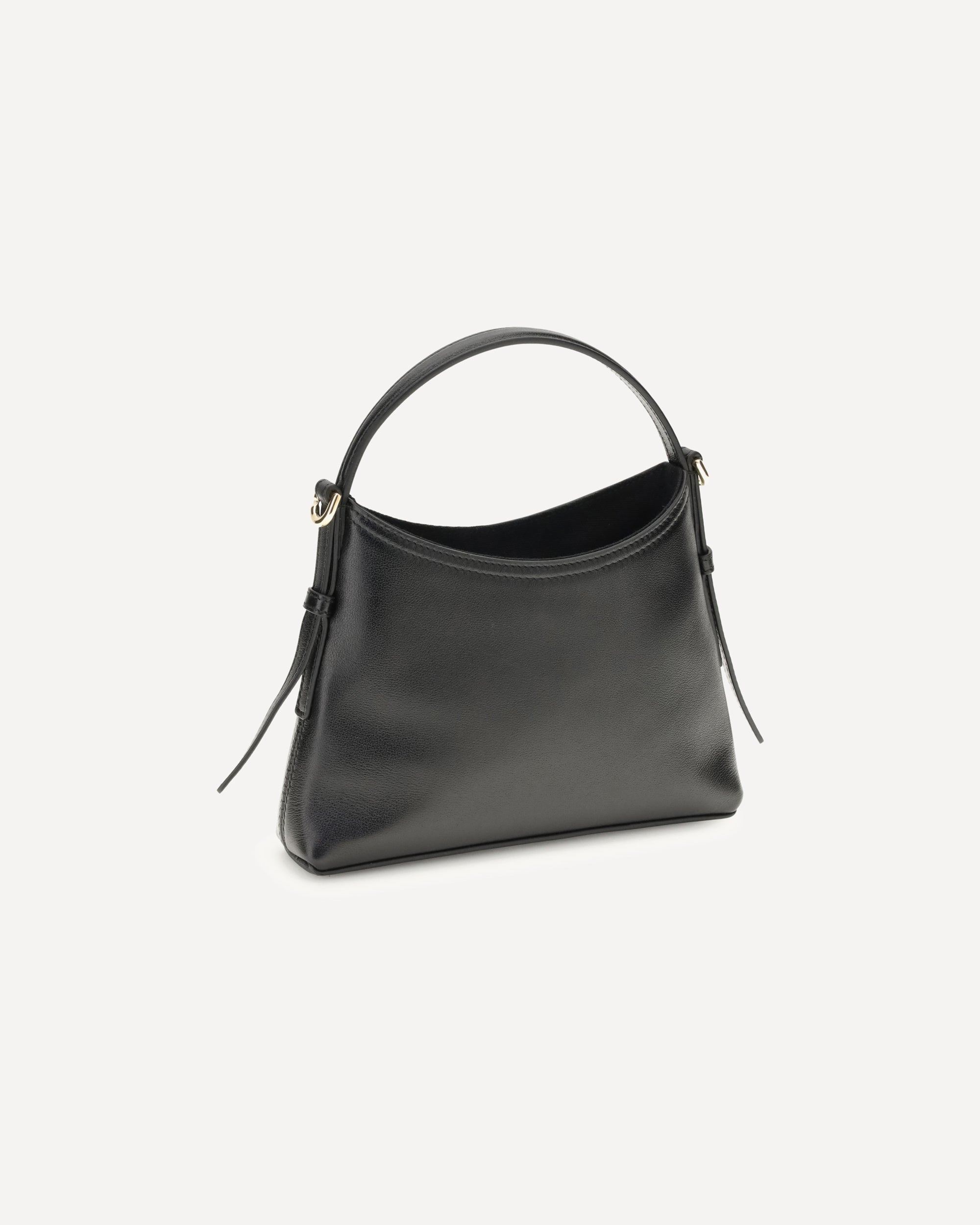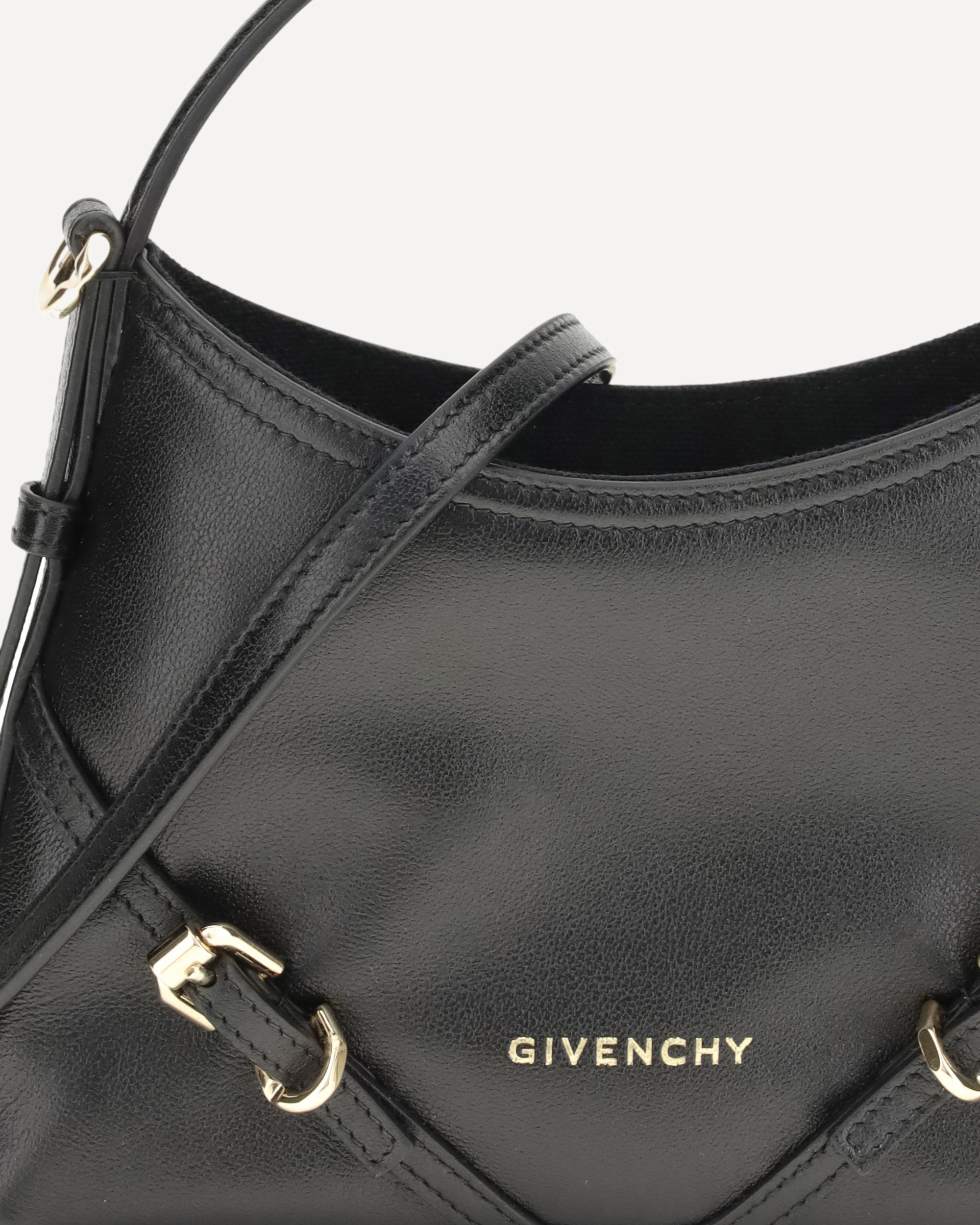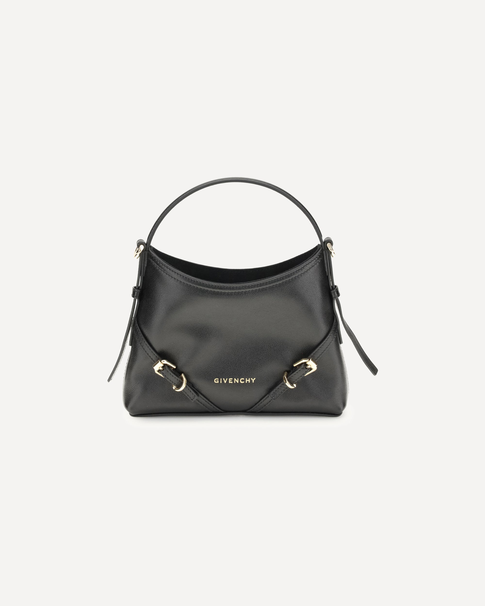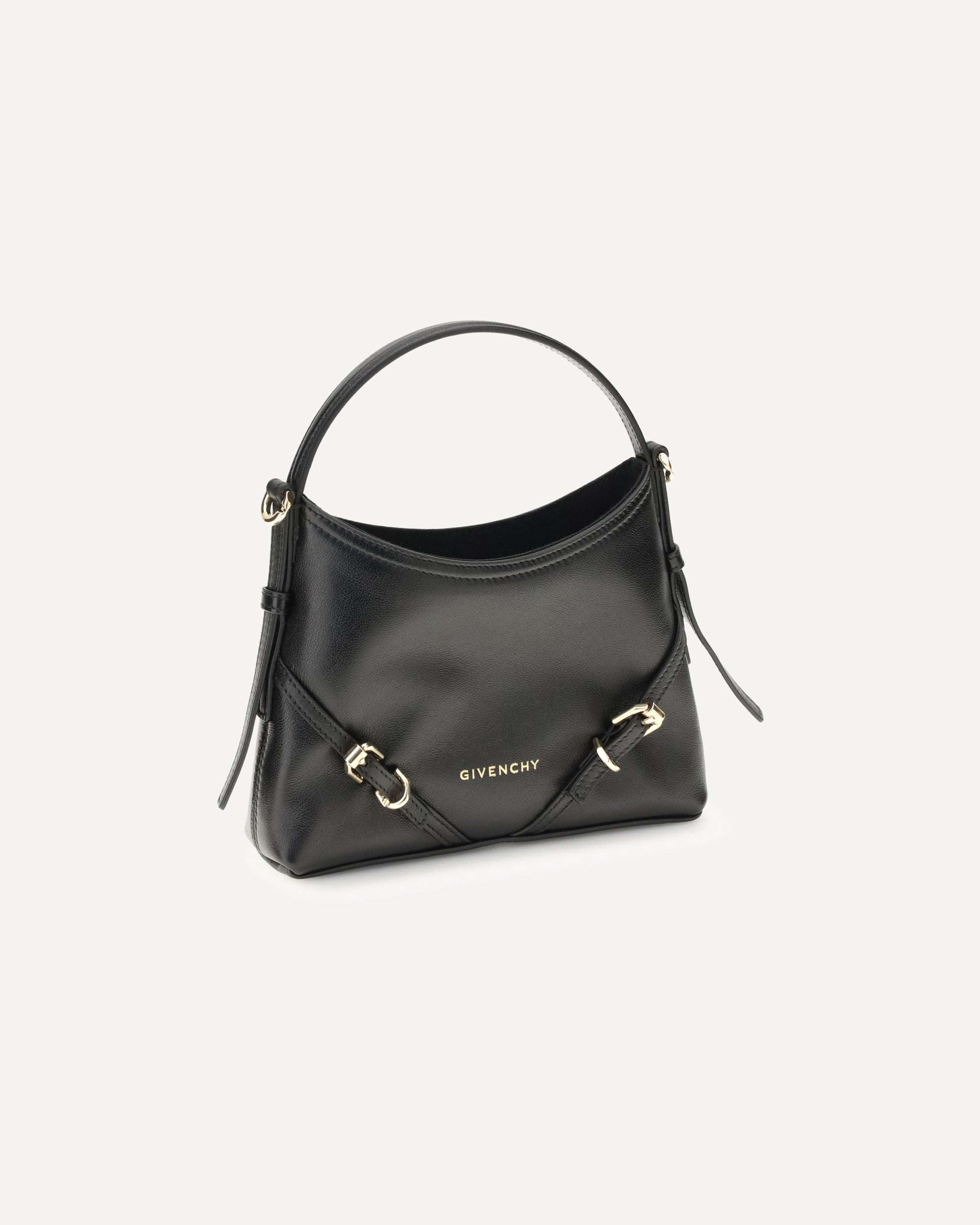 The Voyou Nano Bag by Givenchy, crafted from smooth and glossy calf leather, features a short handle, a removable thin shoulder strap, an embossed logo, and gold-toned metal details. With a main compartment lined in canvas, it combines style and practicality in a compact design.