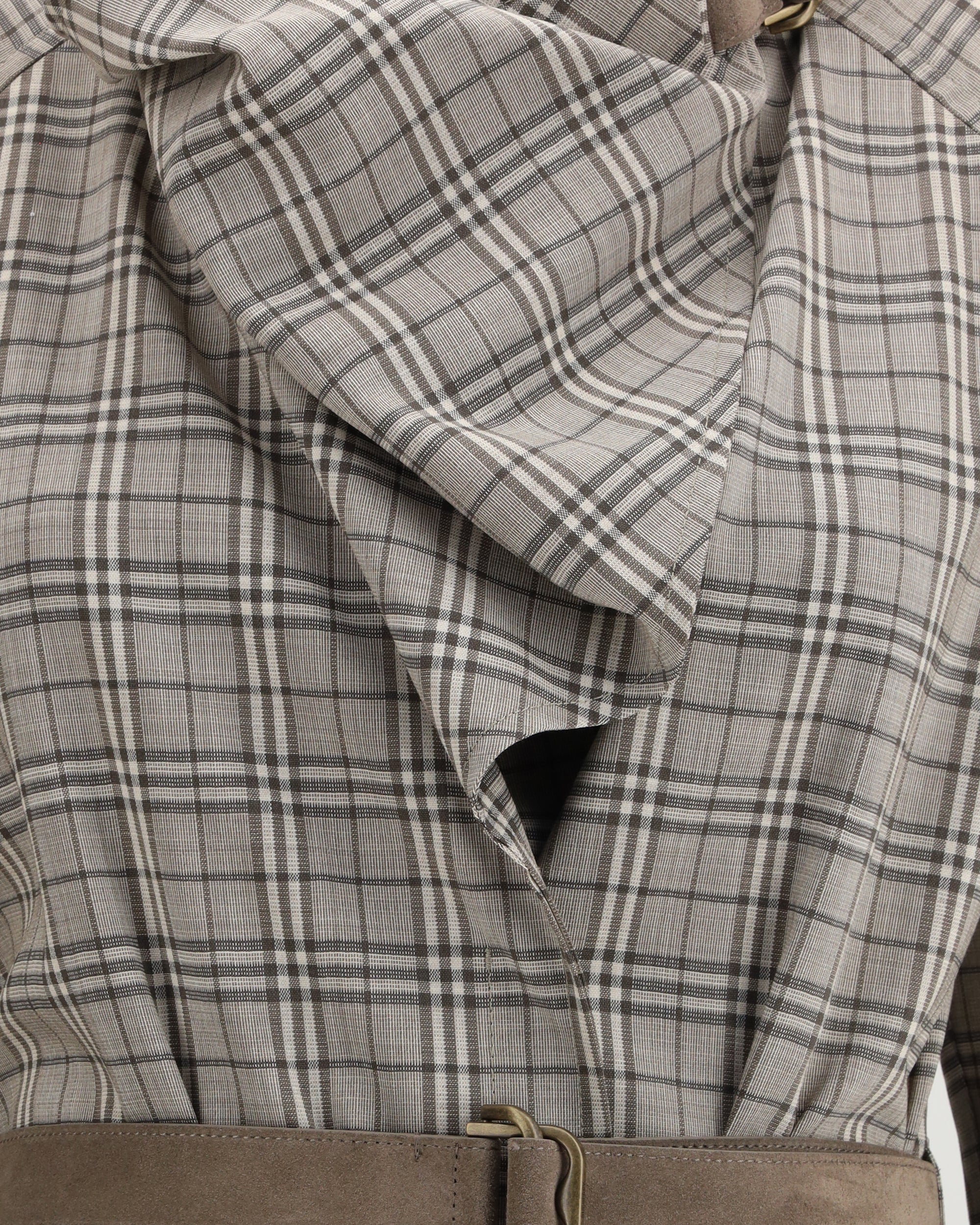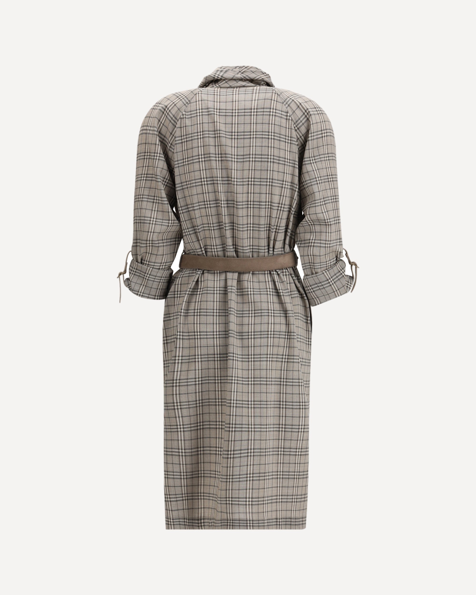 The wool Check Dress with a shawl collar by Burberry features a regular fit and runs true to size; selecting your usual size is recommended. The piece includes a wool belt with a slight stretch, woven in the iconic Burberry Check pattern. The shawl collar can be worn open or closed like a scarf thanks to the detachable suede throat latch, while the matching B-shaped buckle straps allow the sleeve length to be adjusted. The front button fastening completes the design, offering both functional elegance and a distinctive aesthetic.