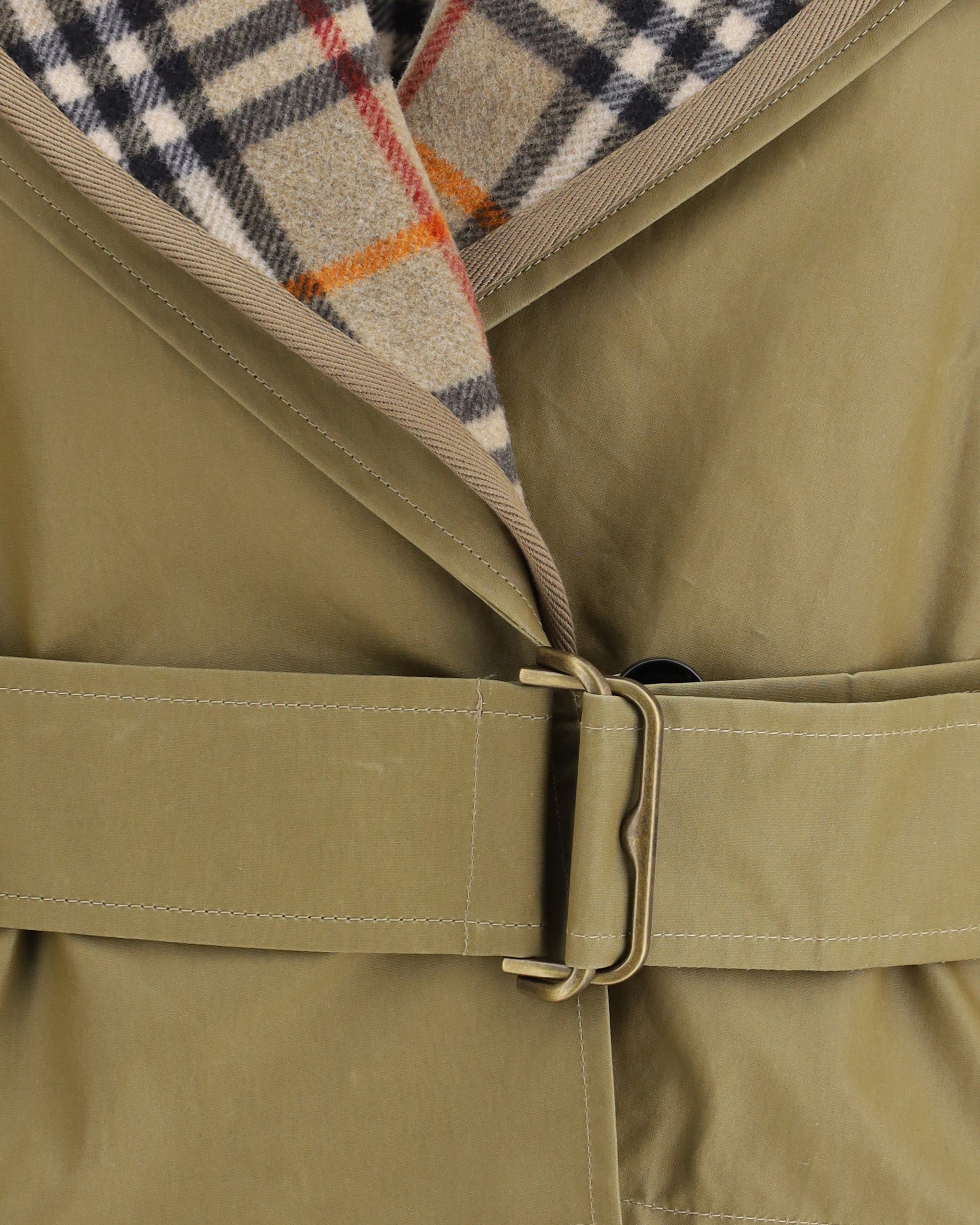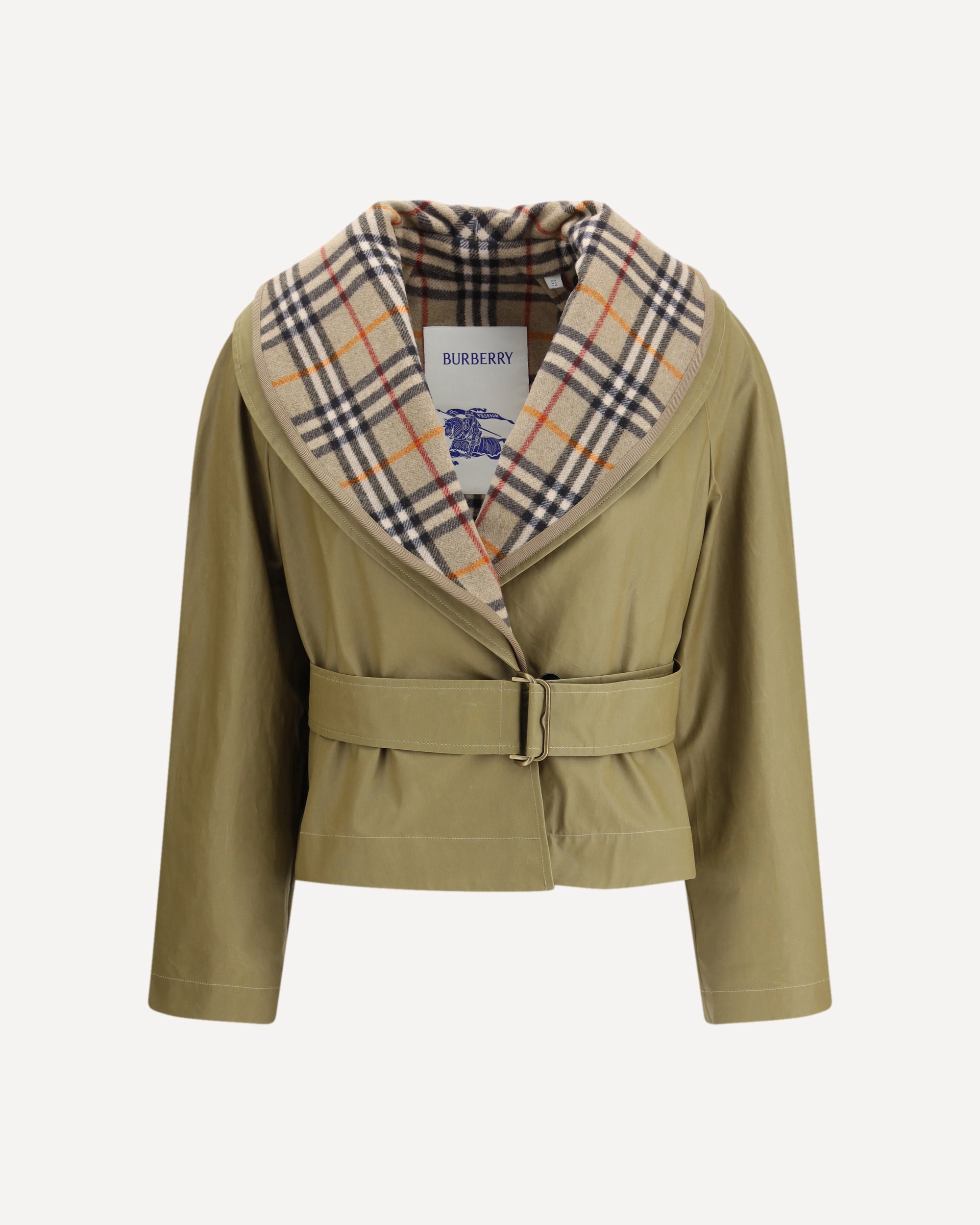 The Cropped cotton Jacket with check quilting by Burberry features a waxed cotton construction with a comfortable, relaxed fit and a shortened silhouette. The piece is enhanced by an antiqued-finish B-shaped buckle belt that defines the waist, and by a detachable wool quilting in tonal Burberry Check that forms a refined, contrasting shawl effect at the front. Button fastening, buttoned cuff tabs, and an included protective garment bag complete the jacket with the Maison’s signature detailing.