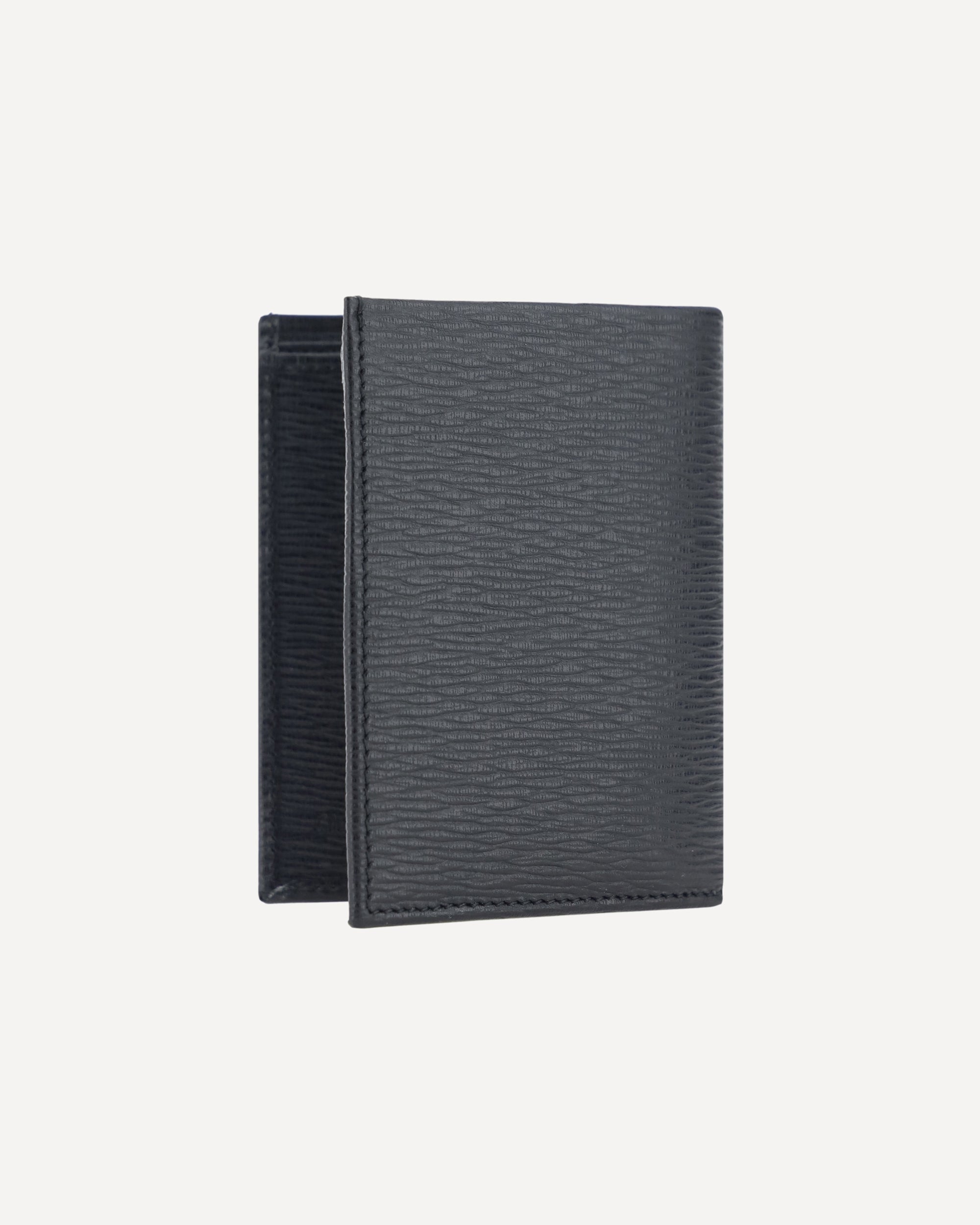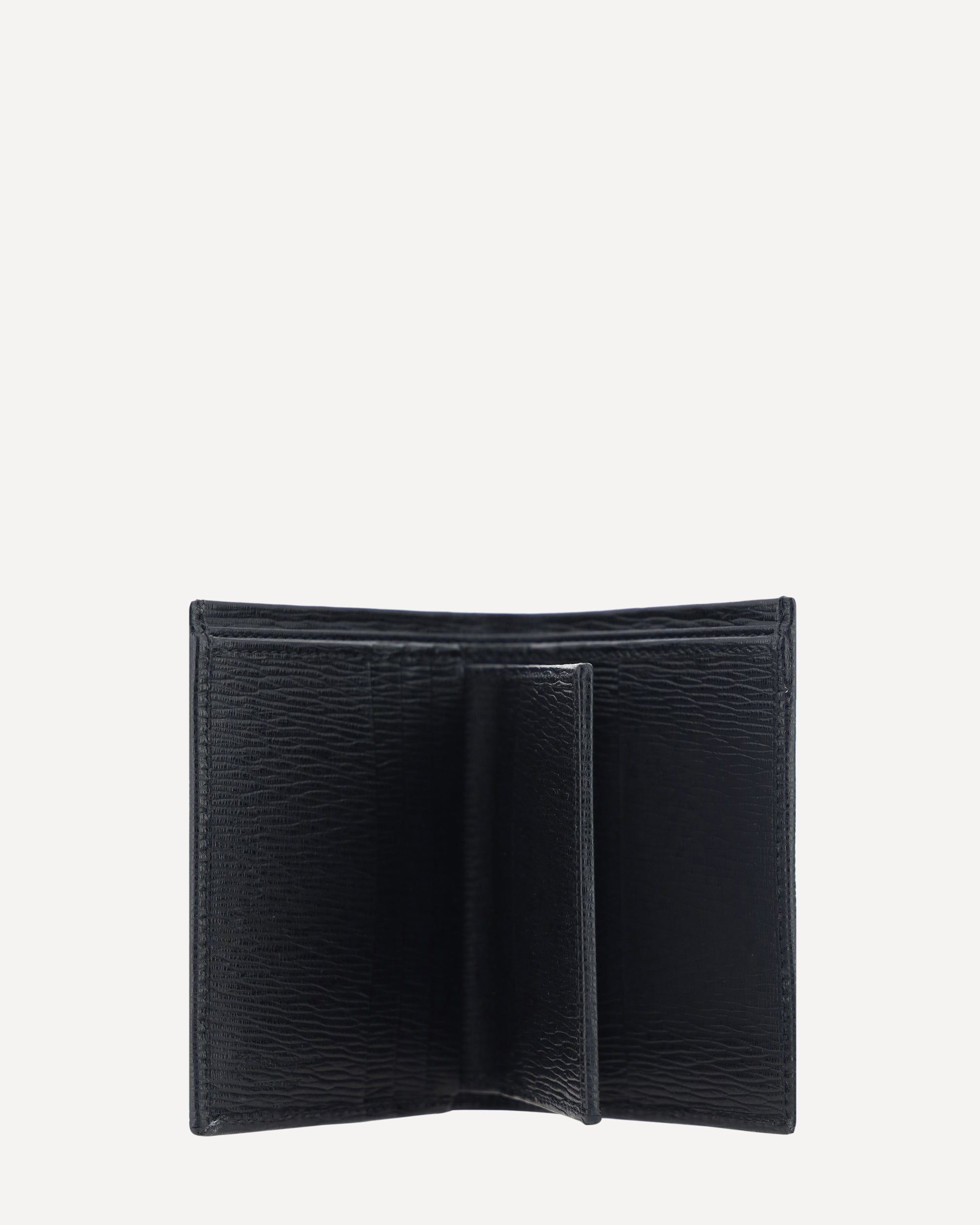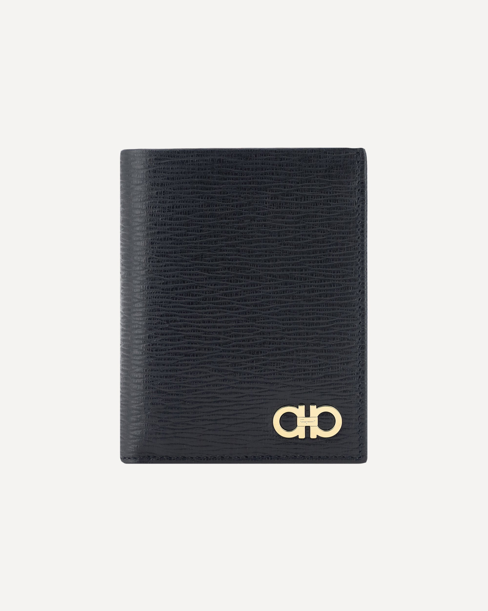 Calfskin Wallet by Ferragamo, billfold design, iconic Gancini logo plaque applied to front, interior card slot, bill compartment, coin pocket with flap for closure.