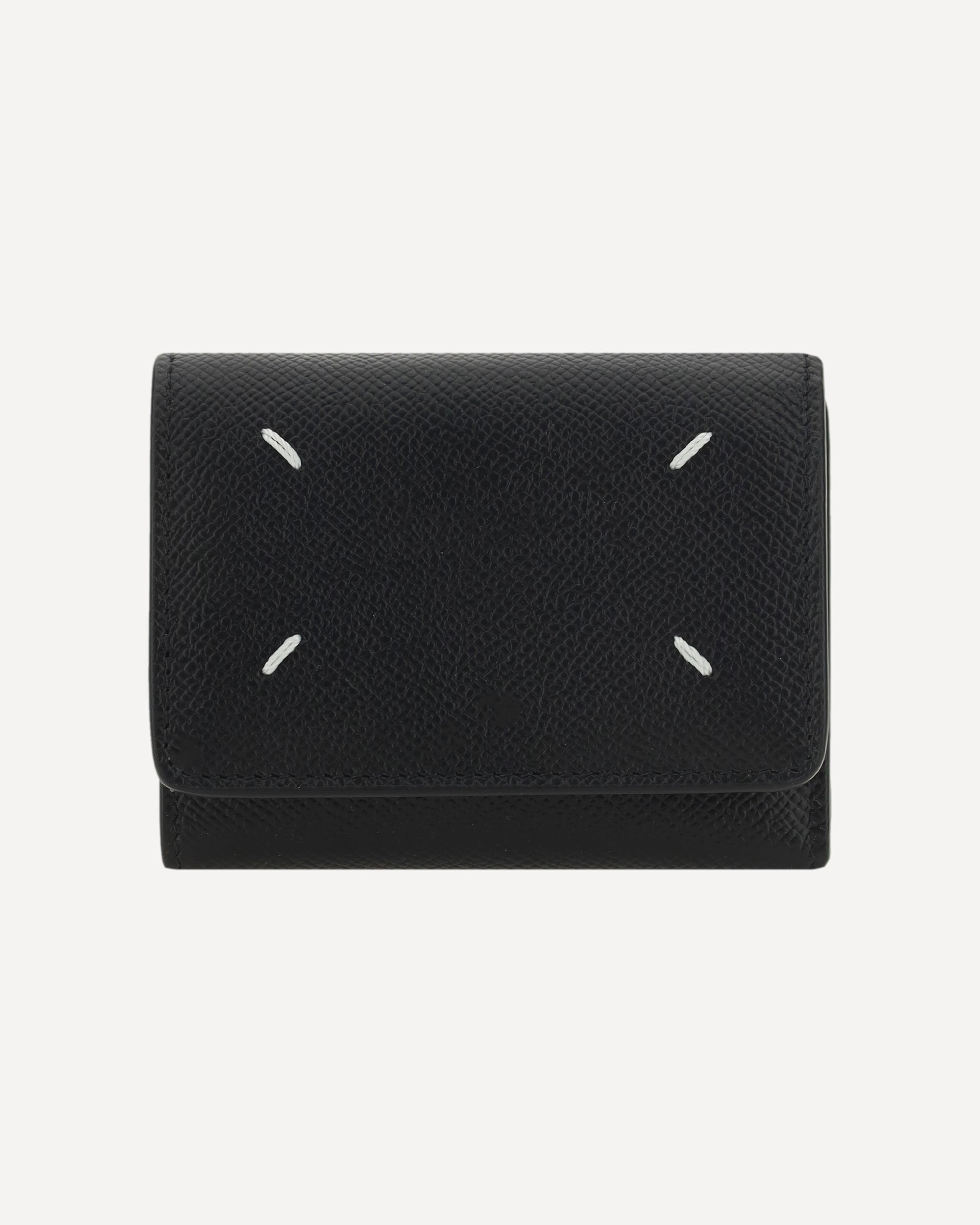 The leather Wallet by Margiela combines functionality with contemporary style. Made of grained leather, it closes at the front with a practical snap button. Inside it offers card slots, a zippered coin compartment and a bill compartment. The back features the brand's iconic contrasting embroidered stitching, a distinctive detail that underscores its minimalist elegance.