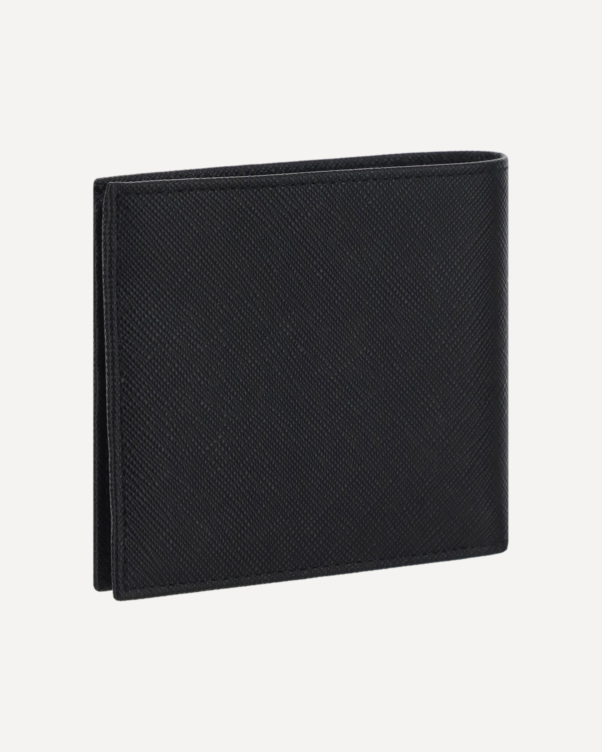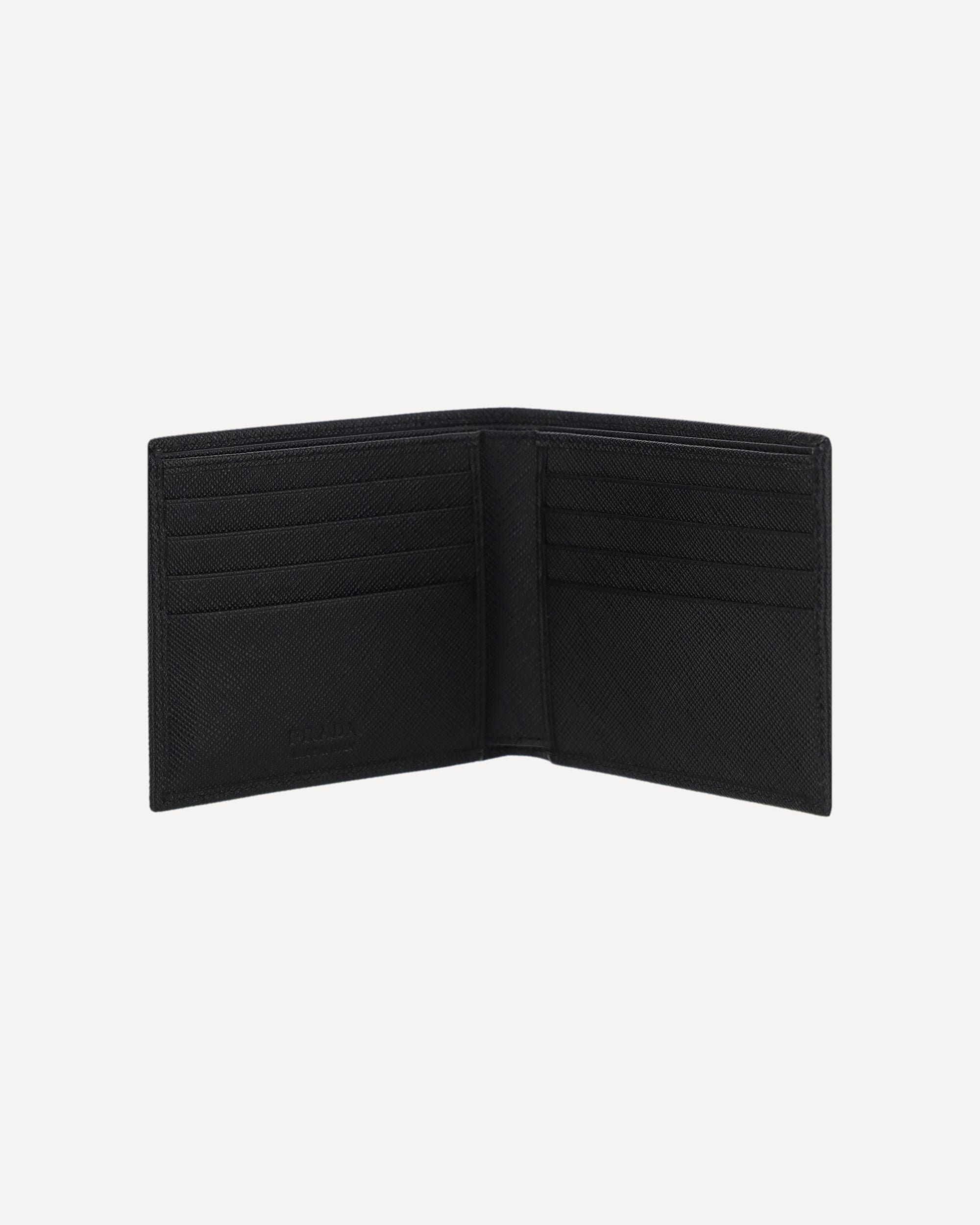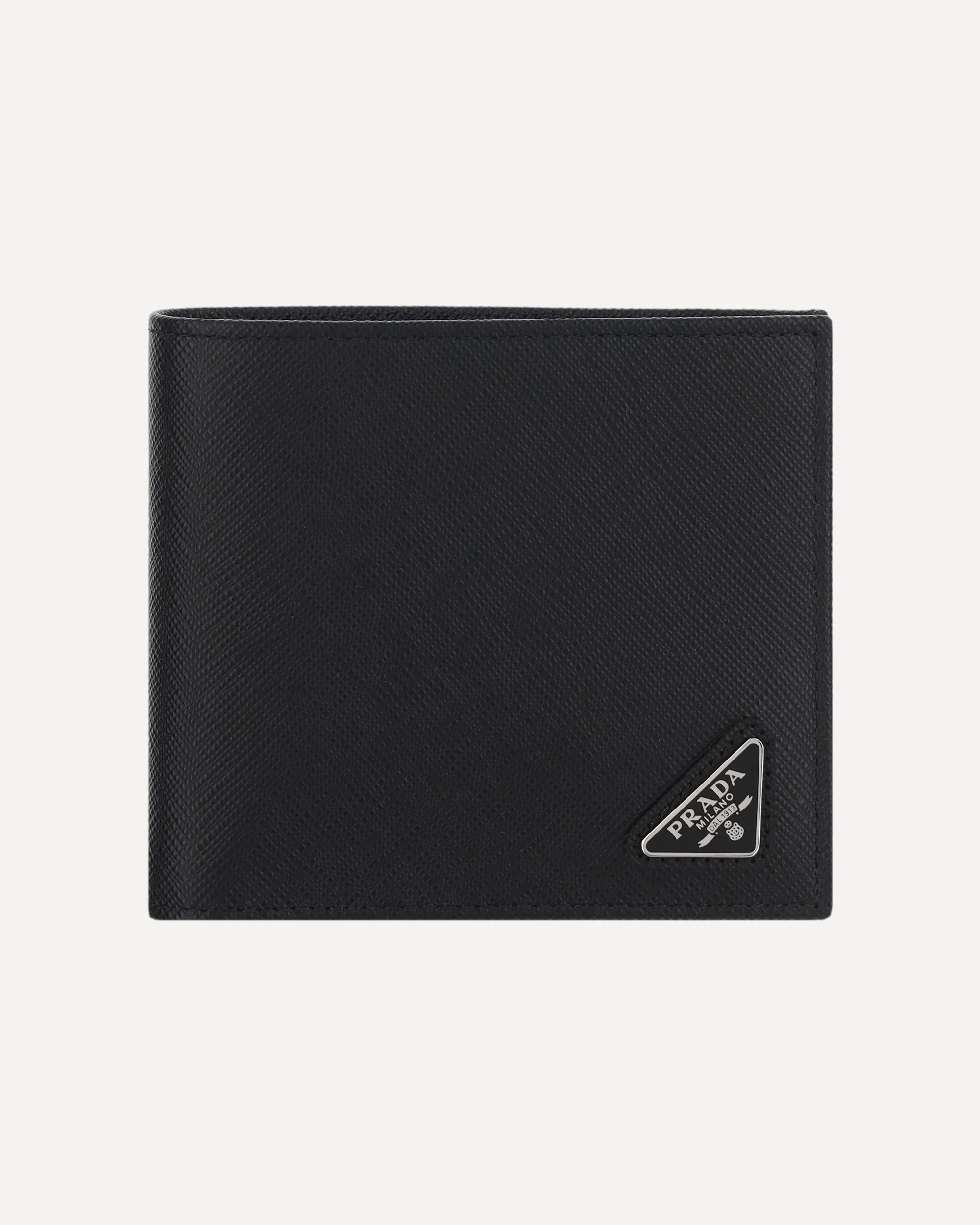 The leather Wallet by Prada features an elegant and functional billfold design. The front features the iconic triangular enameled plaque with the brand's logo, while the interior offers card slots, a billfold compartment, and the brand's monogram stamped in a press-stamped design, a refined detail that underscores the brand's quality and style.