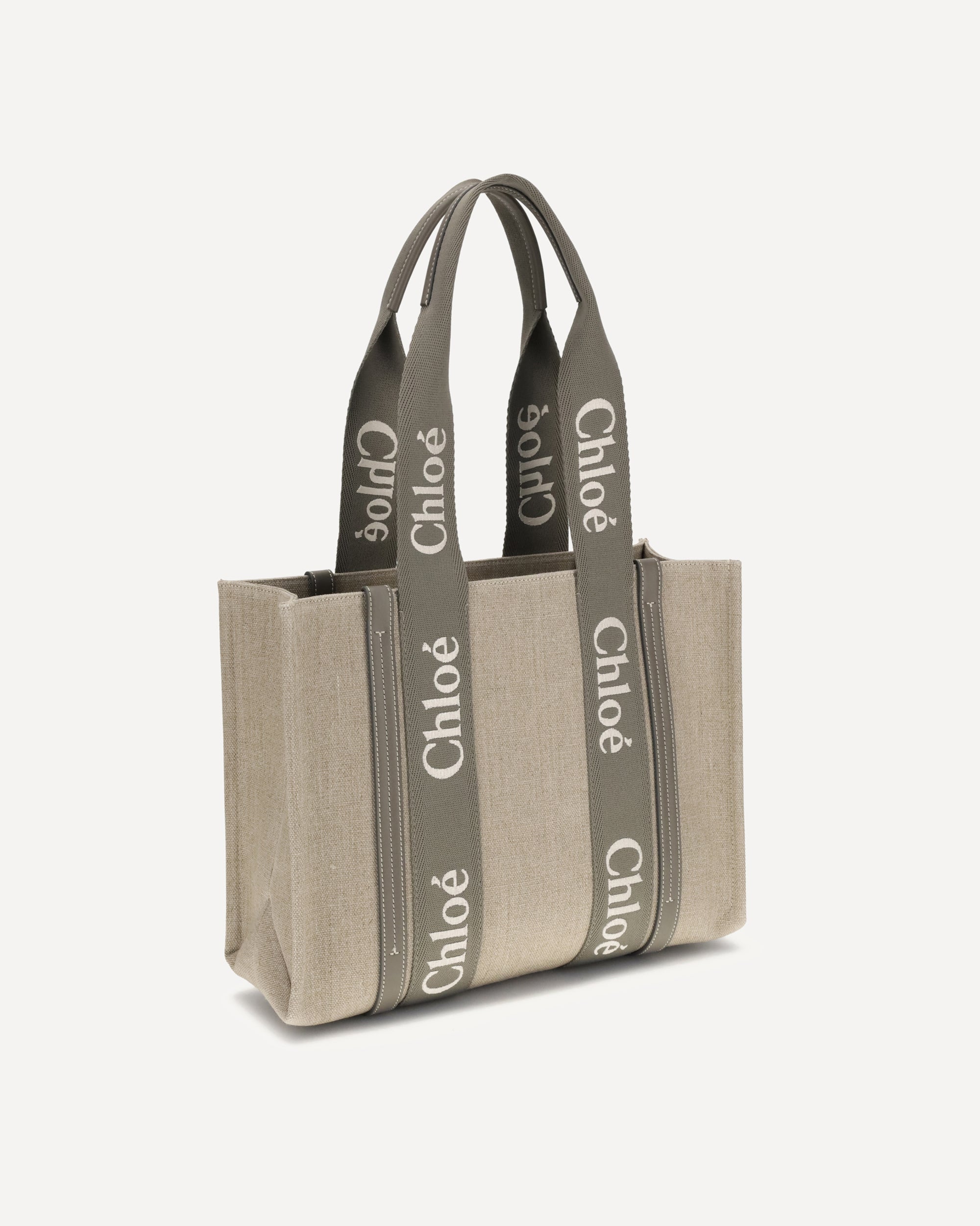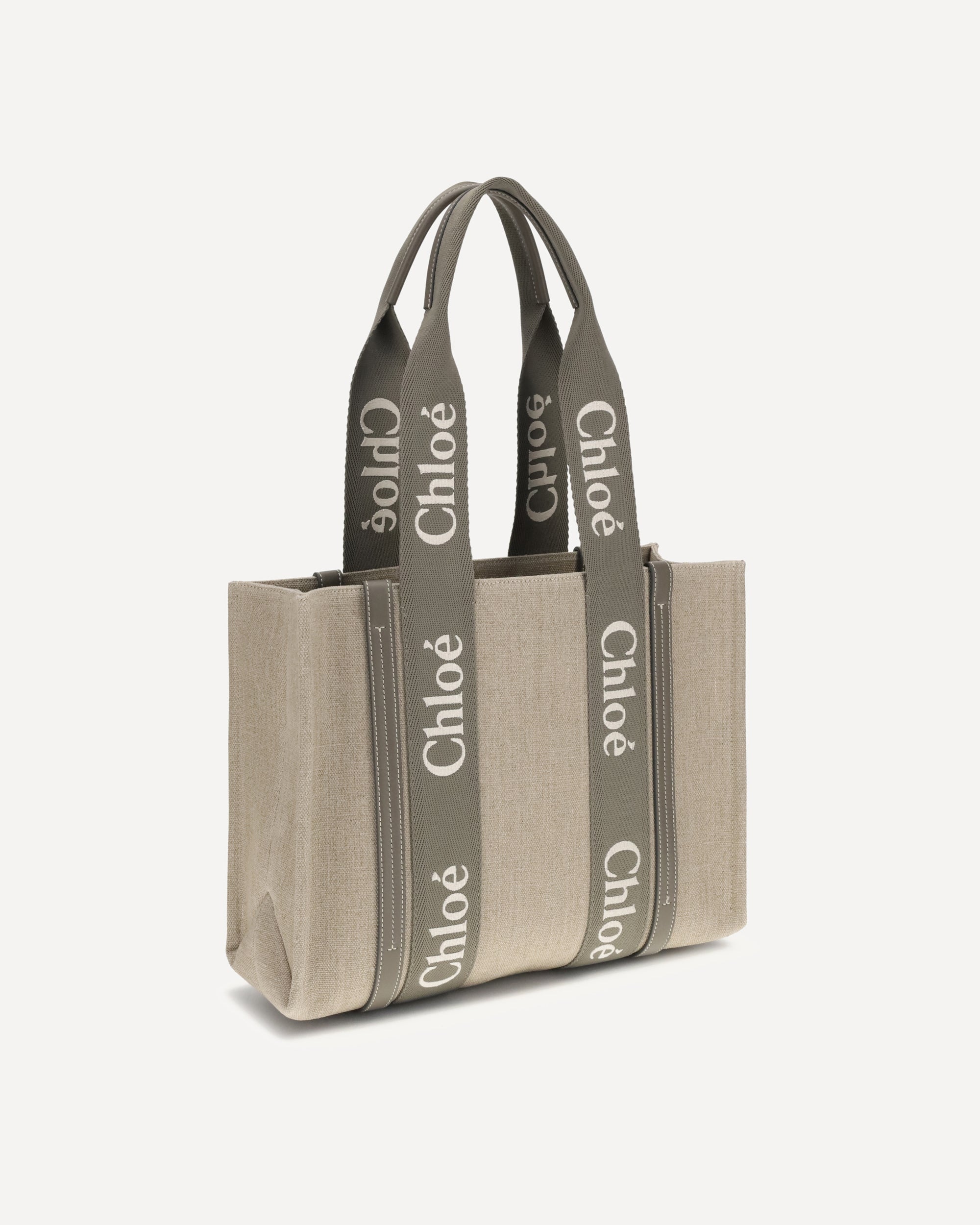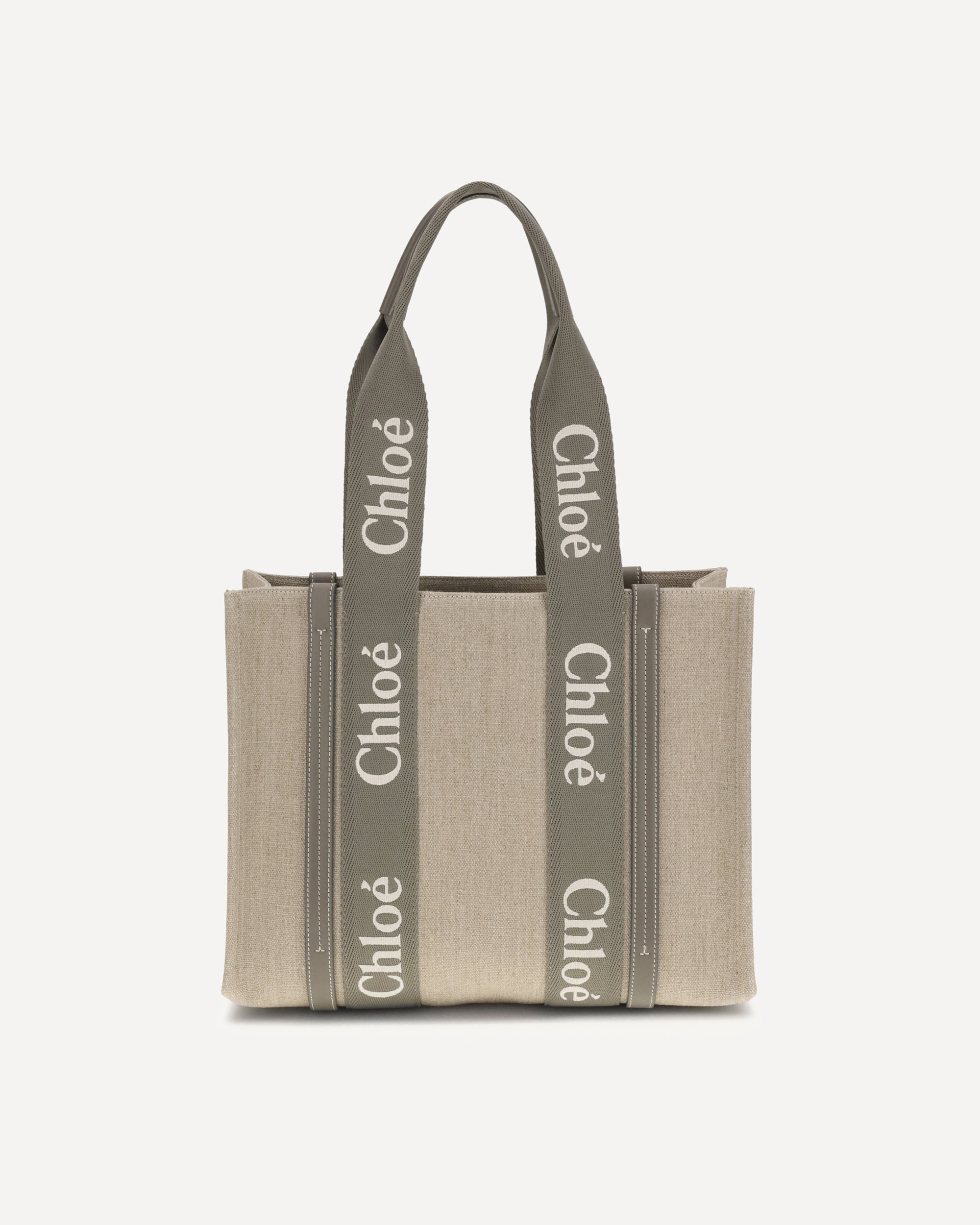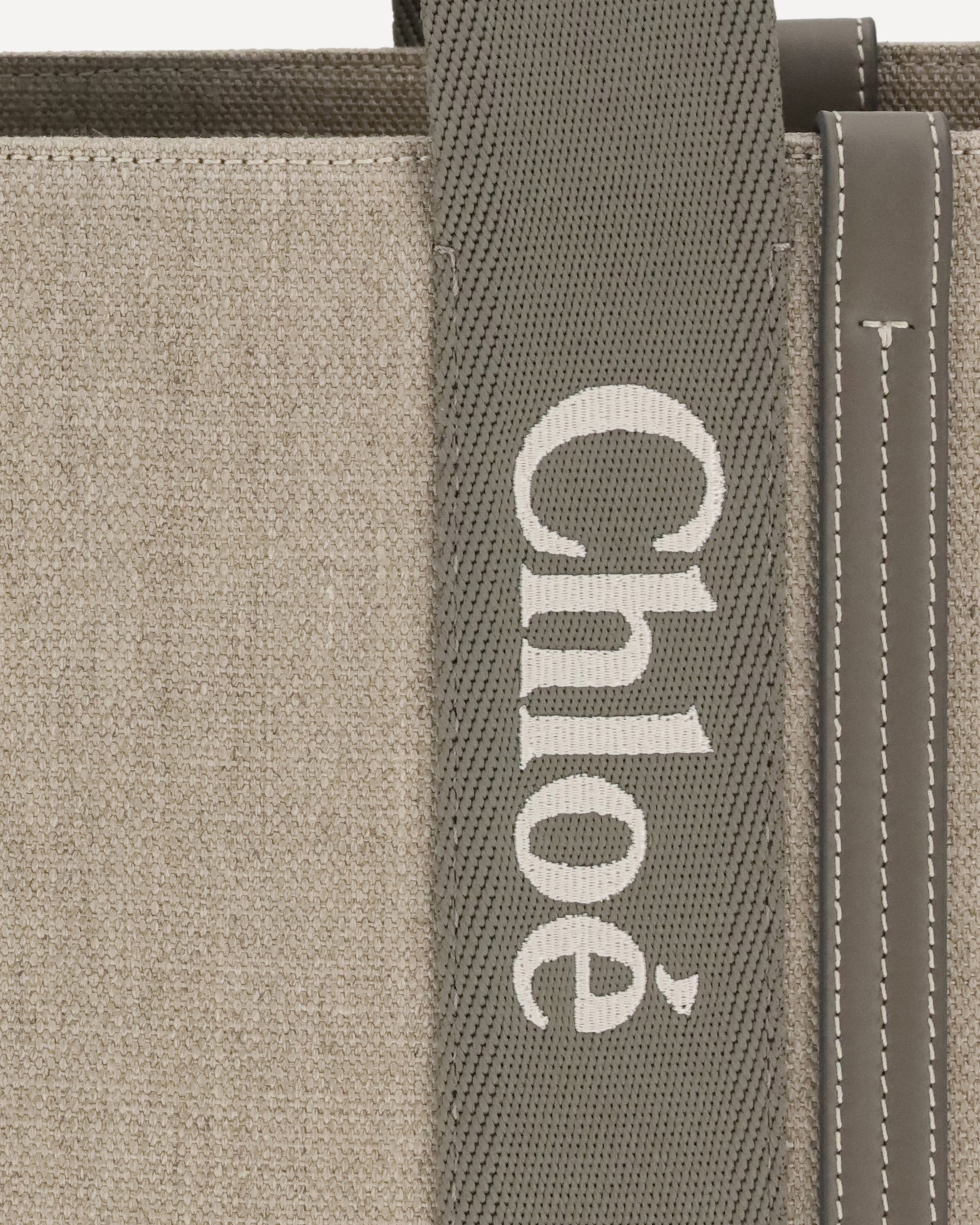 The Woody Shoulder Bag by Chloé is crafted from elegant linen with a refined design and distinctive details. Double flat handles are enhanced by contrasting leather extensions on the side panels, while the brand's iconic monogram adds a touch of class. Inside, a welt pocket offers practicality, while the interior hidden magnetic button closure provides security without compromising style.