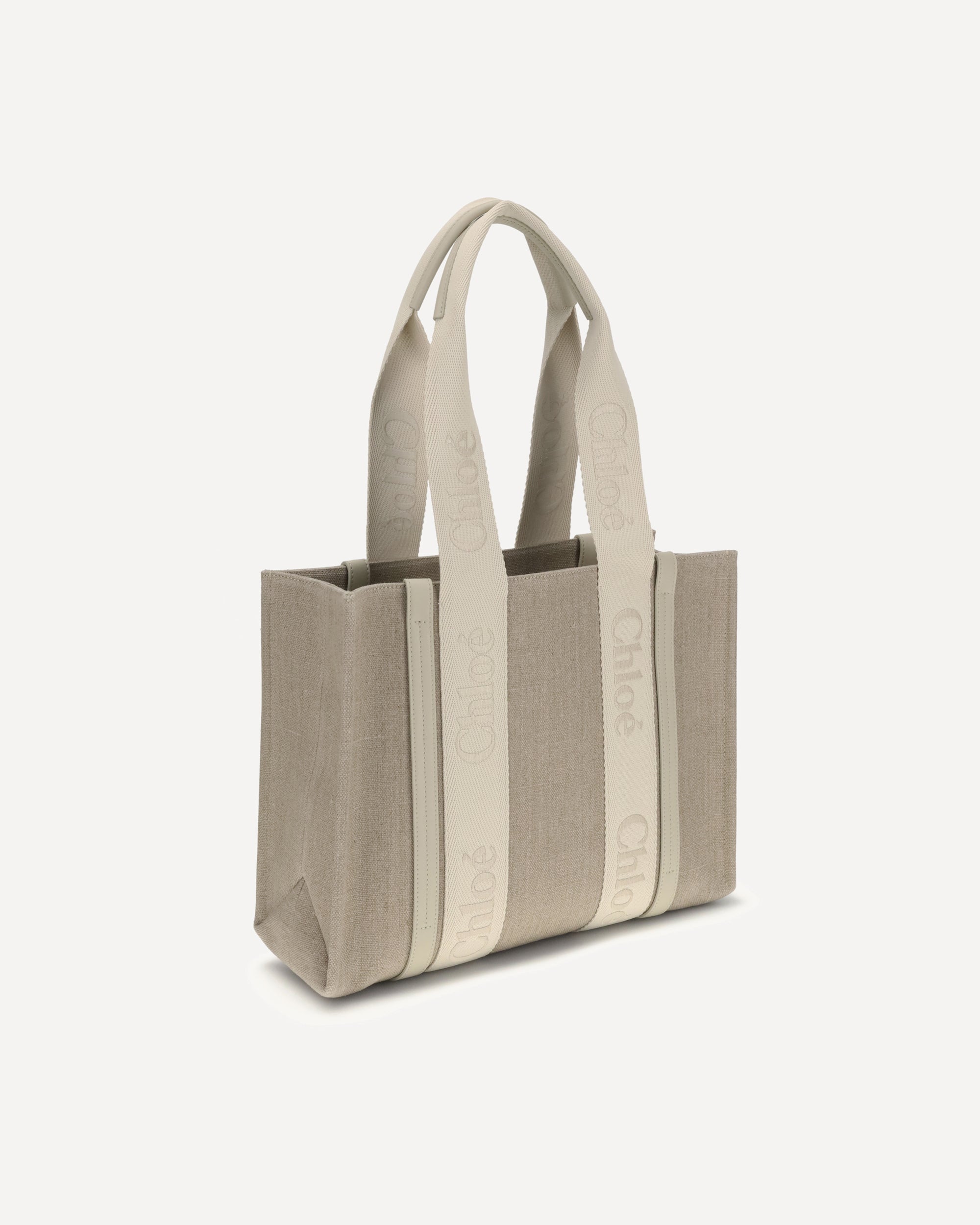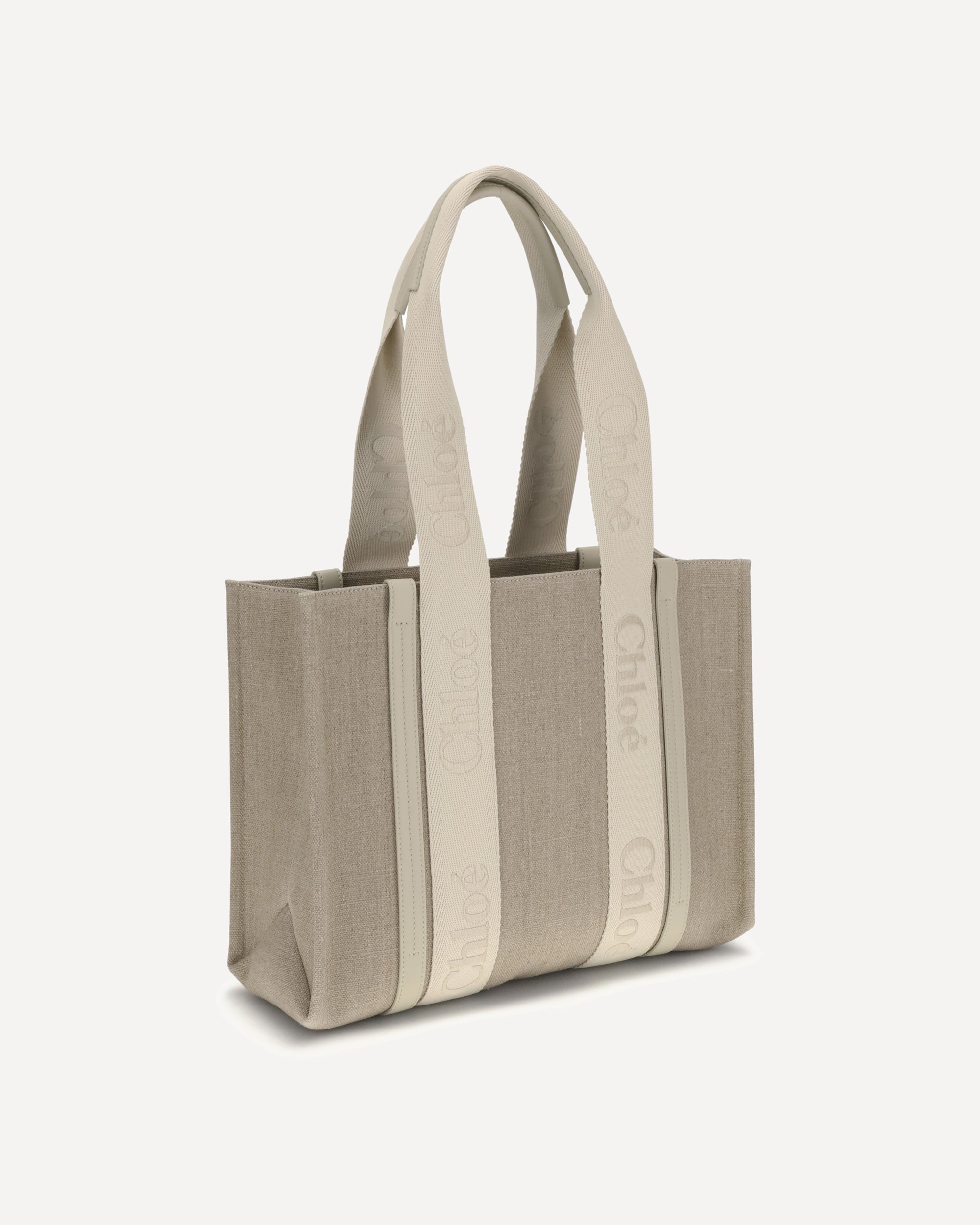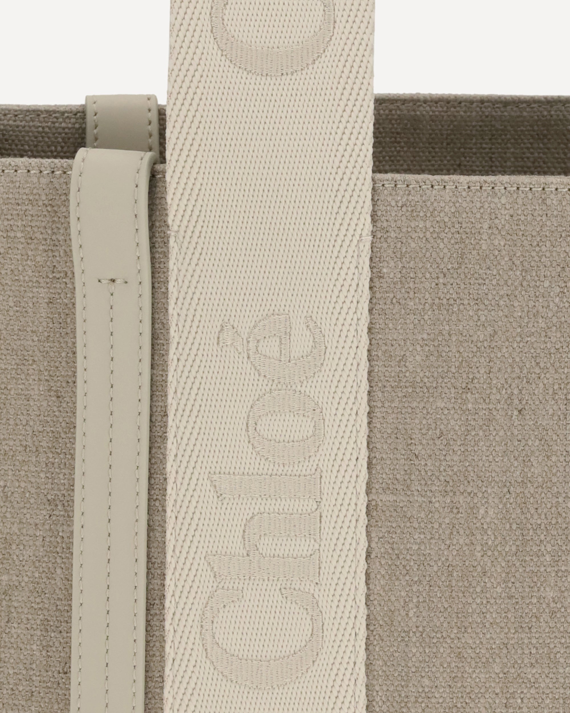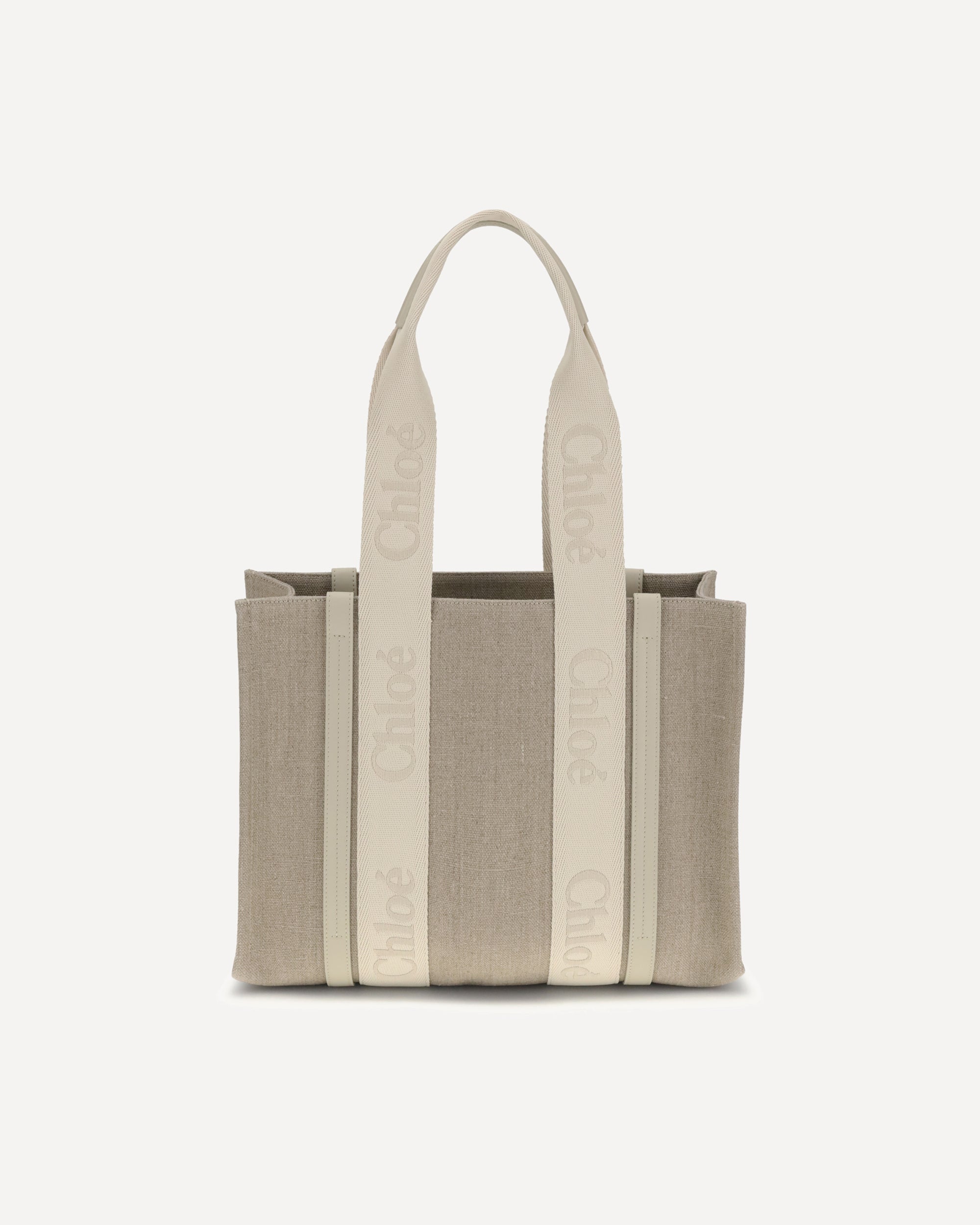 The Woody Shoulder Bag by Chloé is crafted from elegant linen with a refined design and distinctive details. Double flat handles are enhanced by contrasting leather extensions on the side panels, while the brand's iconic monogram adds a touch of class. Inside, a welt pocket offers practicality, while the interior hidden magnetic button closure provides security without compromising style.