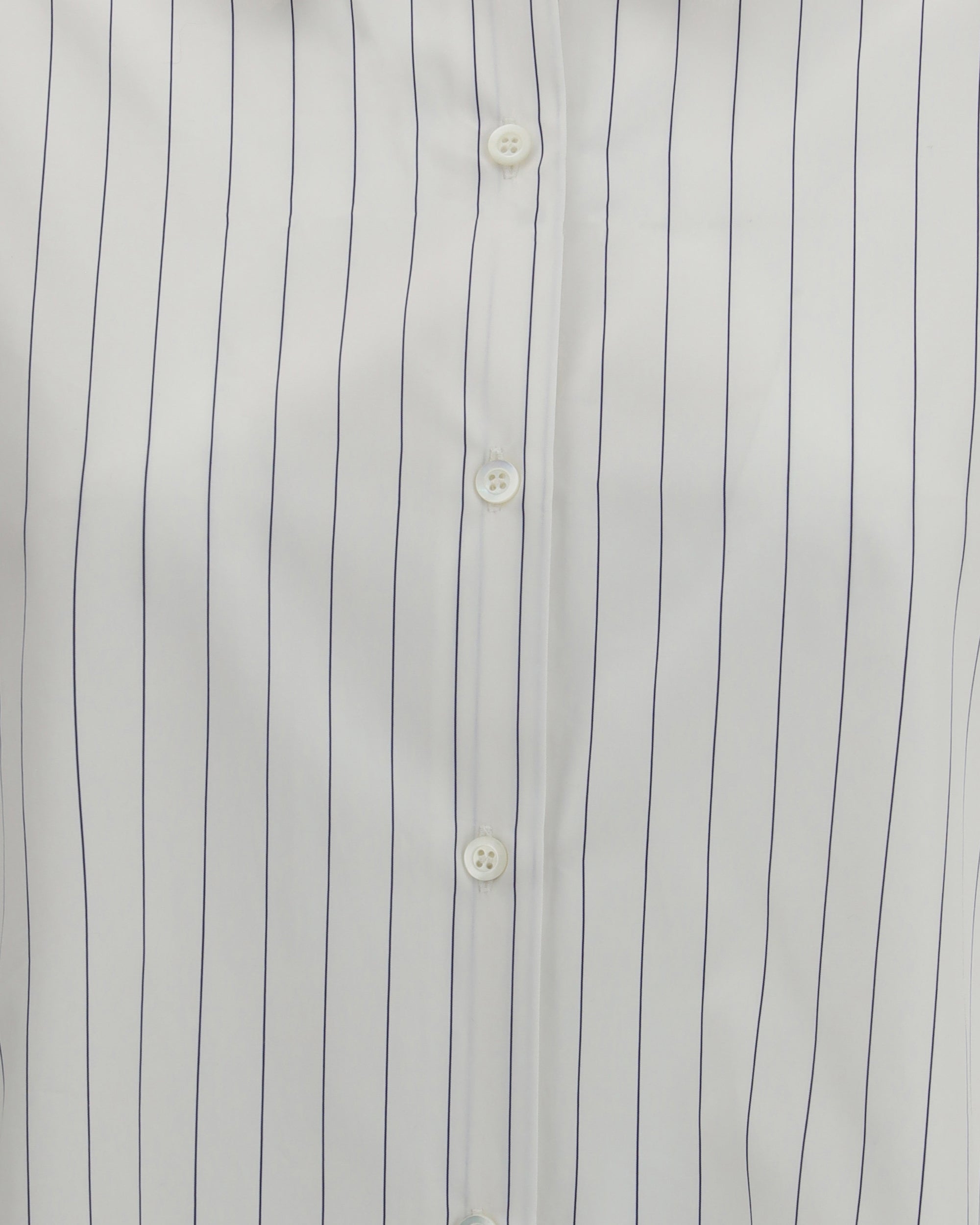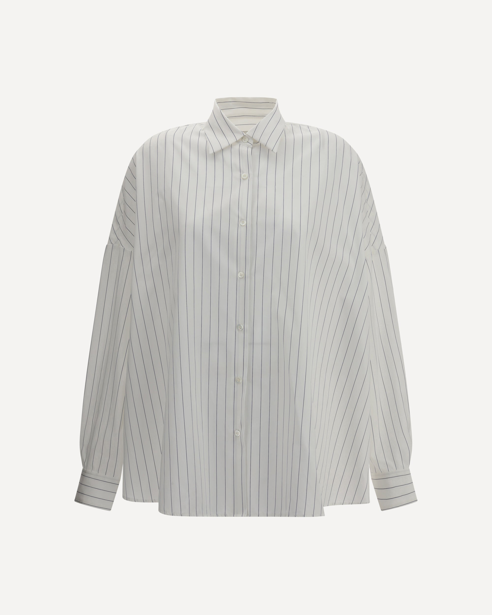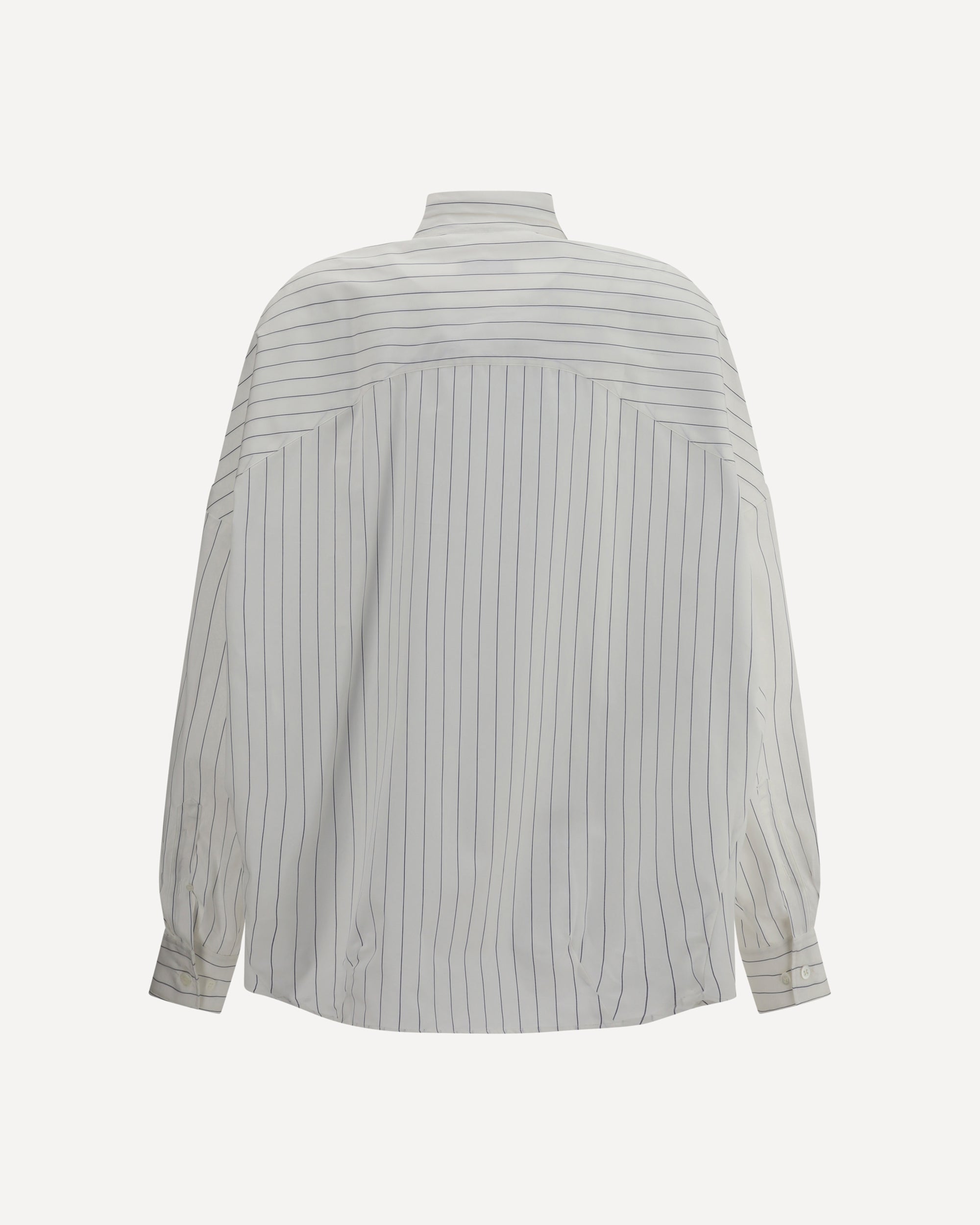 The Oversized striped Shirt by Dries Van Noten combines classic lines with modern volumes. Featuring a traditional collar, front button closure, and an asymmetrical hemline, it offers a contemporary, casual look perfect for adding personality to even the most basic outfits.