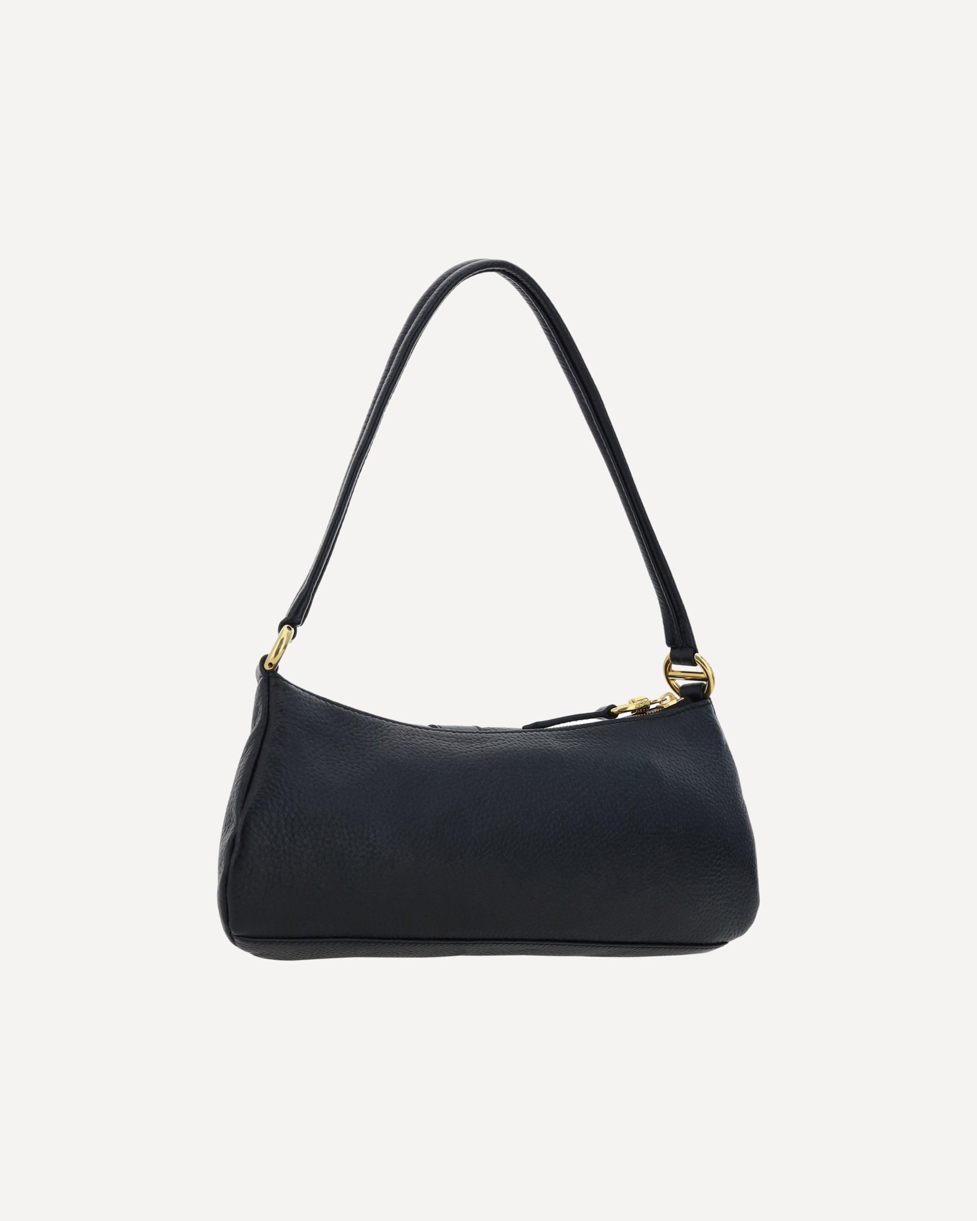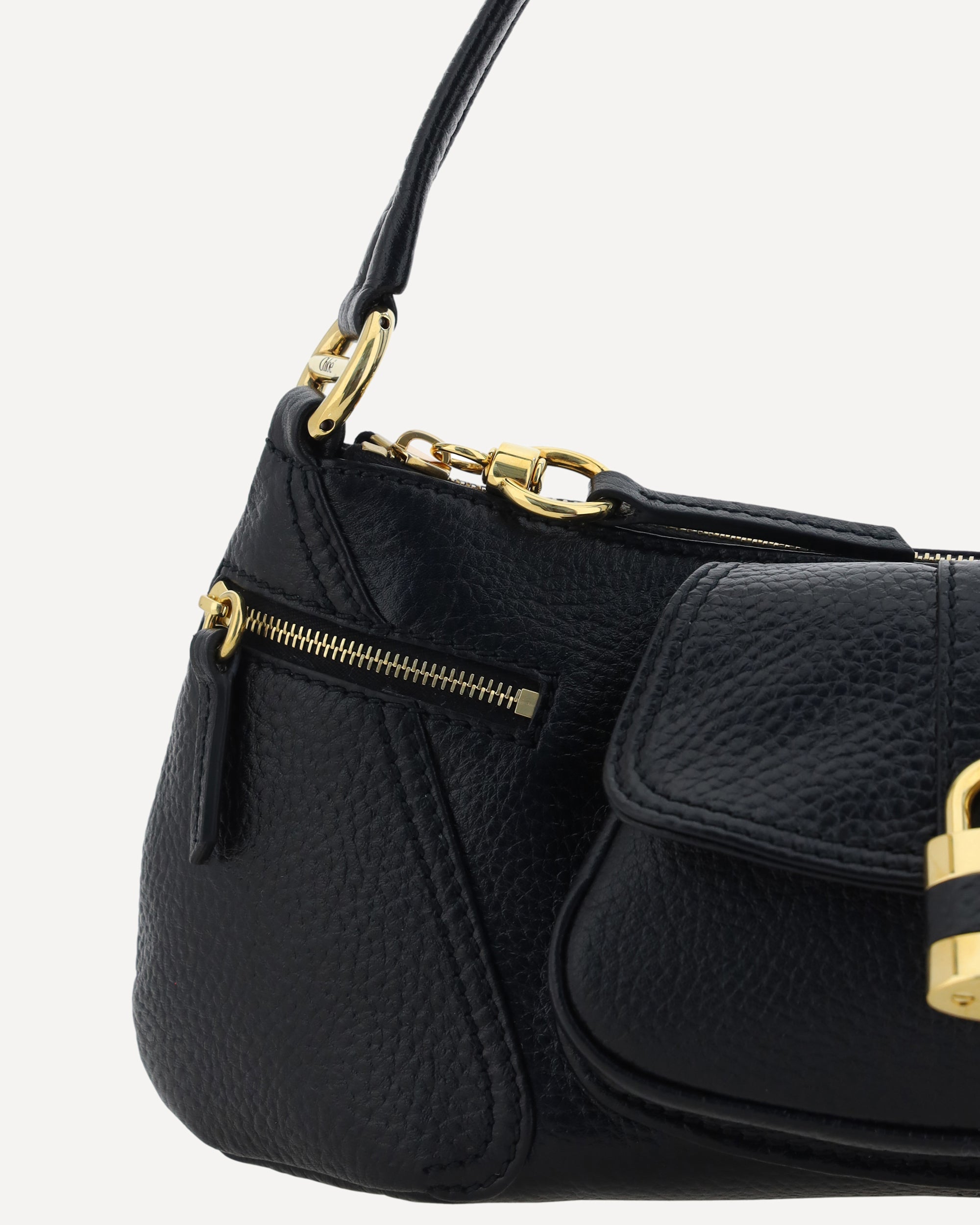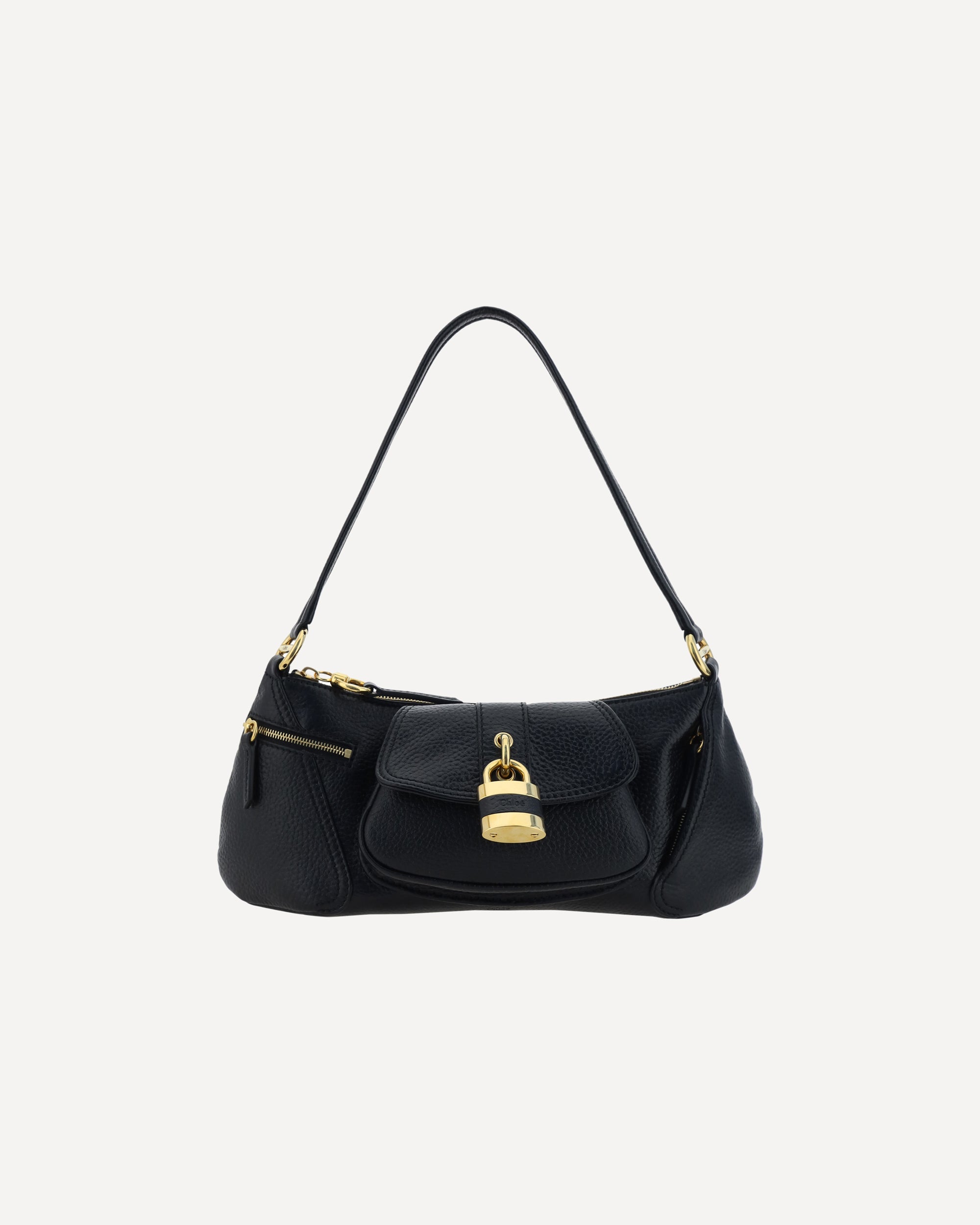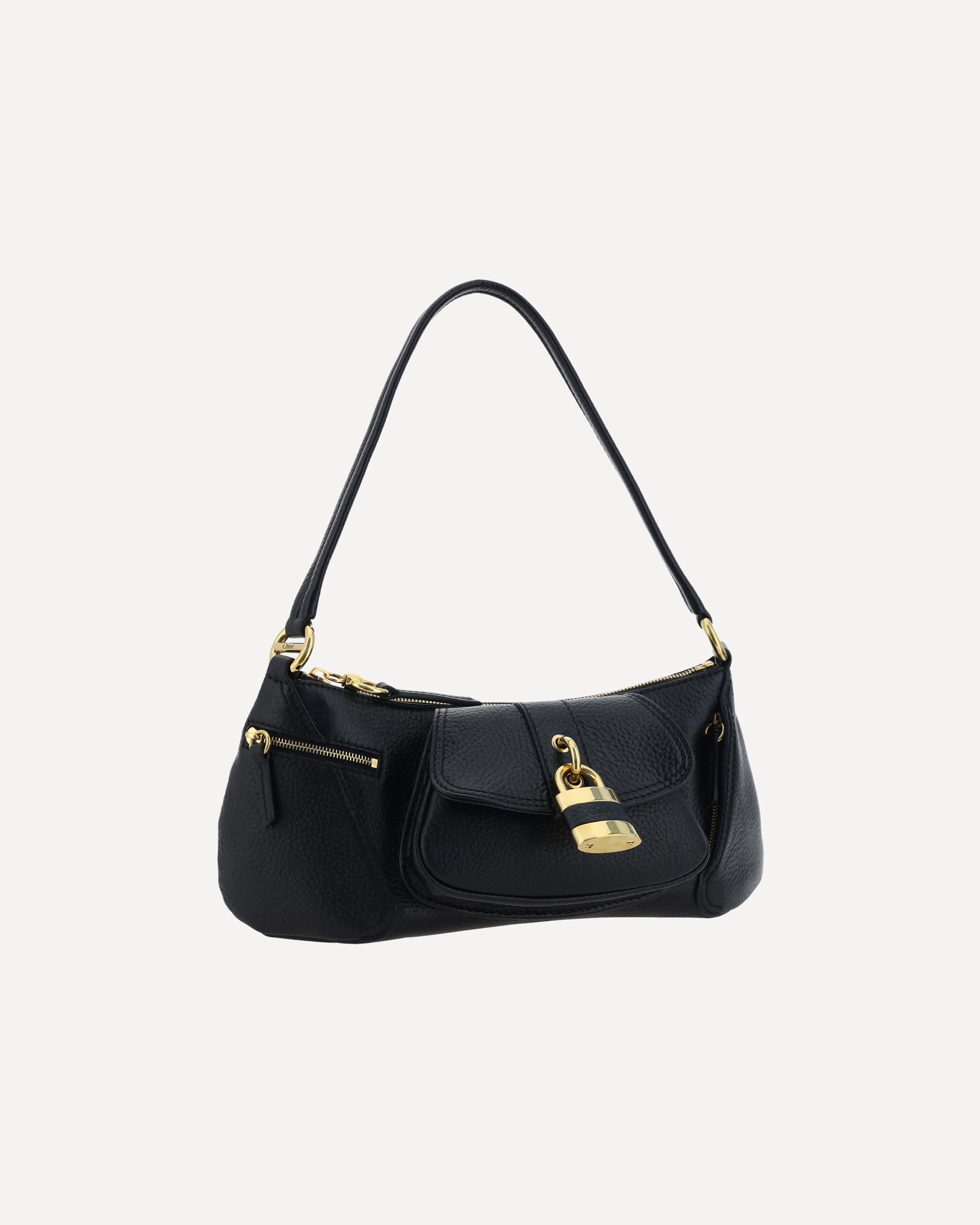 Leather 99 Shoulder Bag by Chloé, one flat handle at top, top zipper closure, two zippered pockets at sides, one patch pocket at top closable by padlock flap engraved with brand monogram, single compartment.