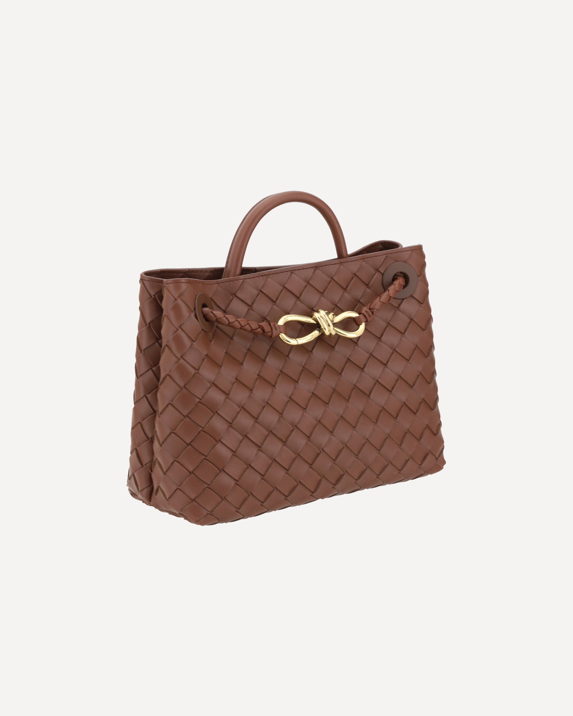 The Andiamo lambskin Shoulder Bag by Bottega Veneta features the brand's iconic intrecciato design covering the entire surface. It has a single rigid handle and a matching sliding shoulder strap, embellished with the iconic knotted brass Muse detail. The bag closes via a top magnetic flap. Inside, it features dual interior compartments and an interior welt pocket for optimal organization. A stylish and practical accessory for any occasion.