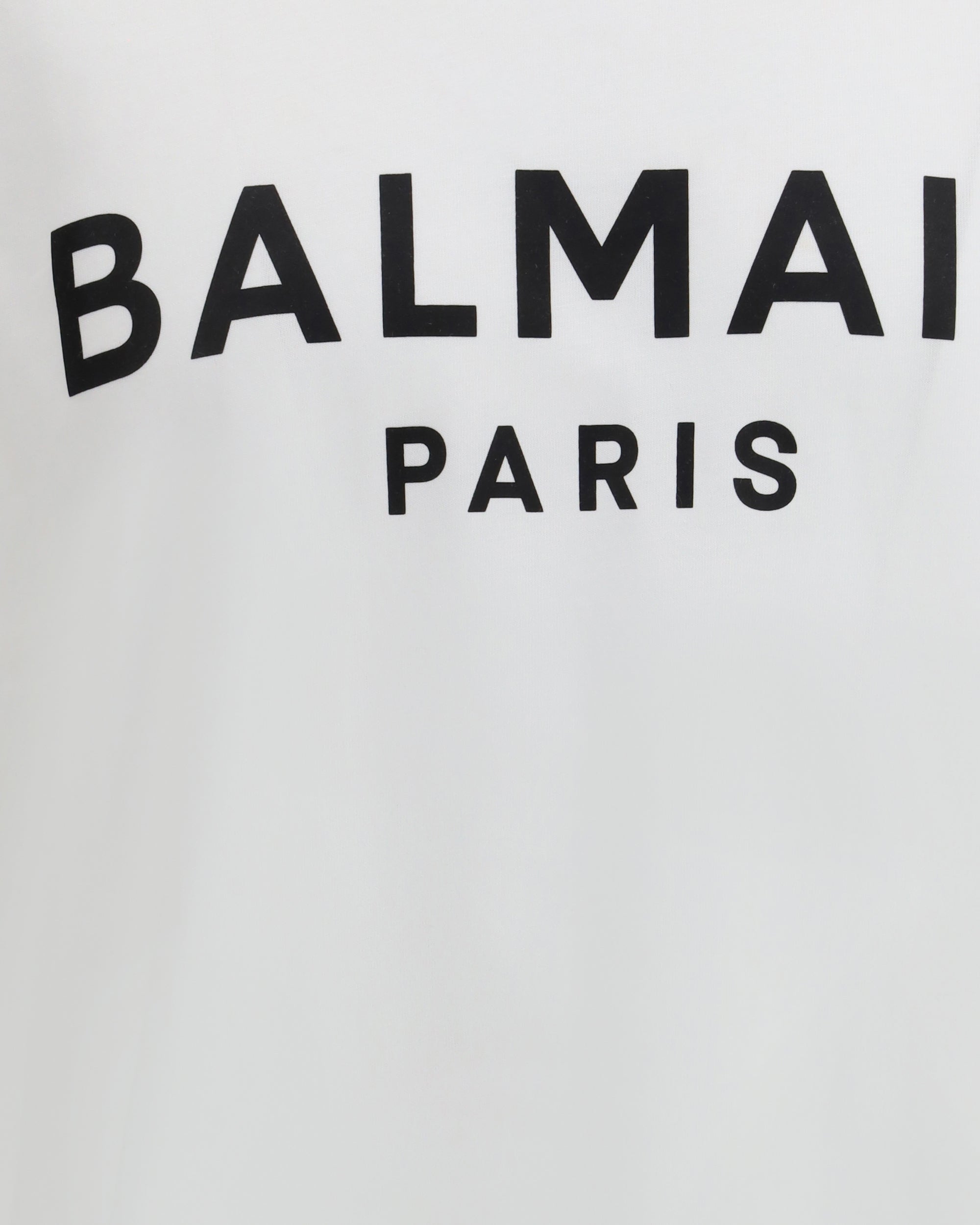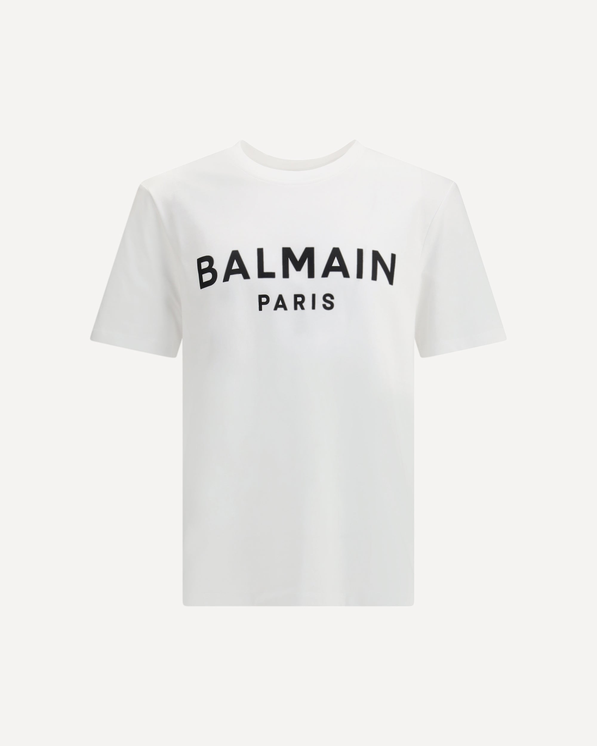 The cotton T-shirt with Balmain print is crafted from soft jersey and features a classic crew neckline and short sleeves. The Balmain Paris print on the front adds a distinctive and instantly recognizable touch, while the regular fit ensures a clean and timeless silhouette.