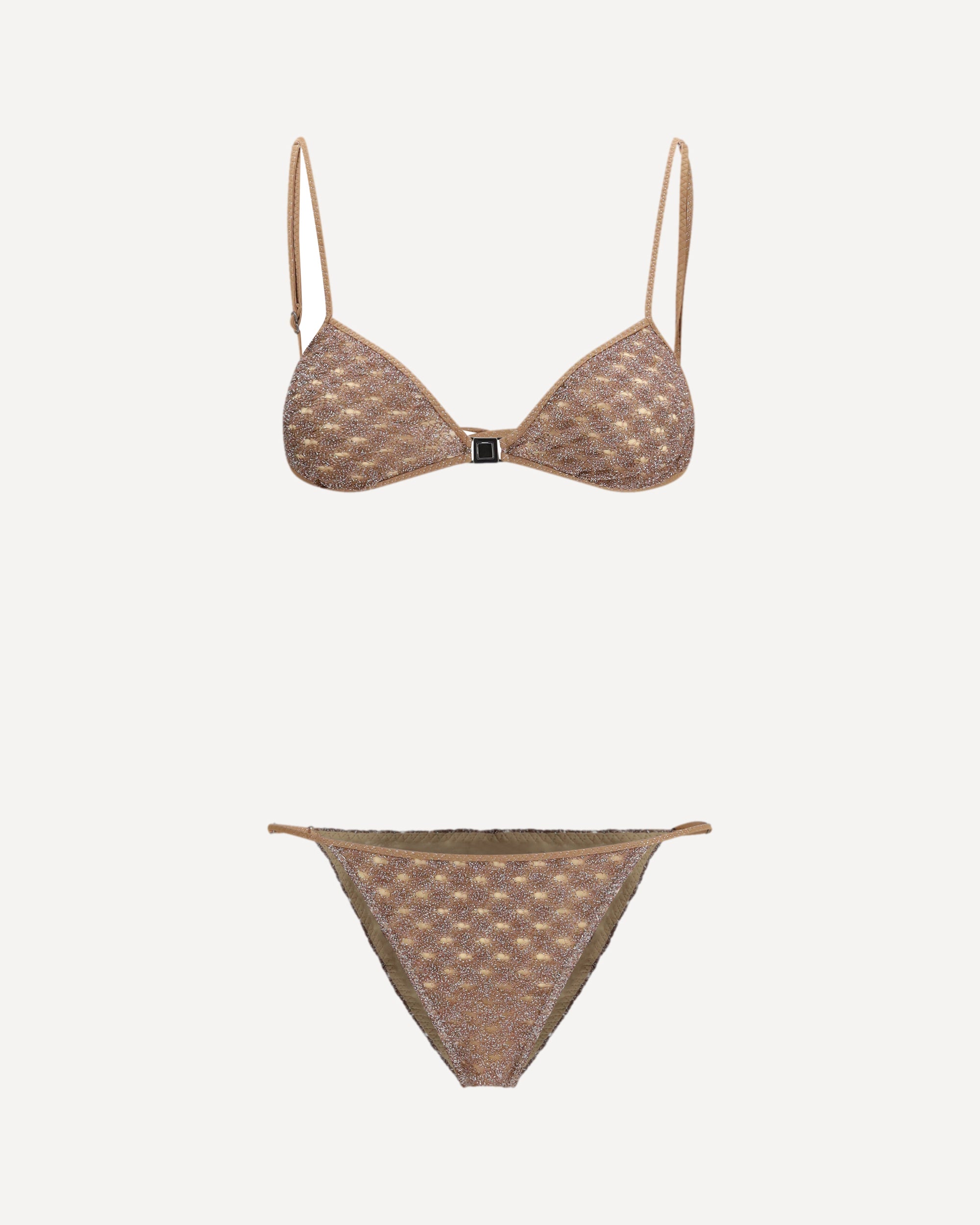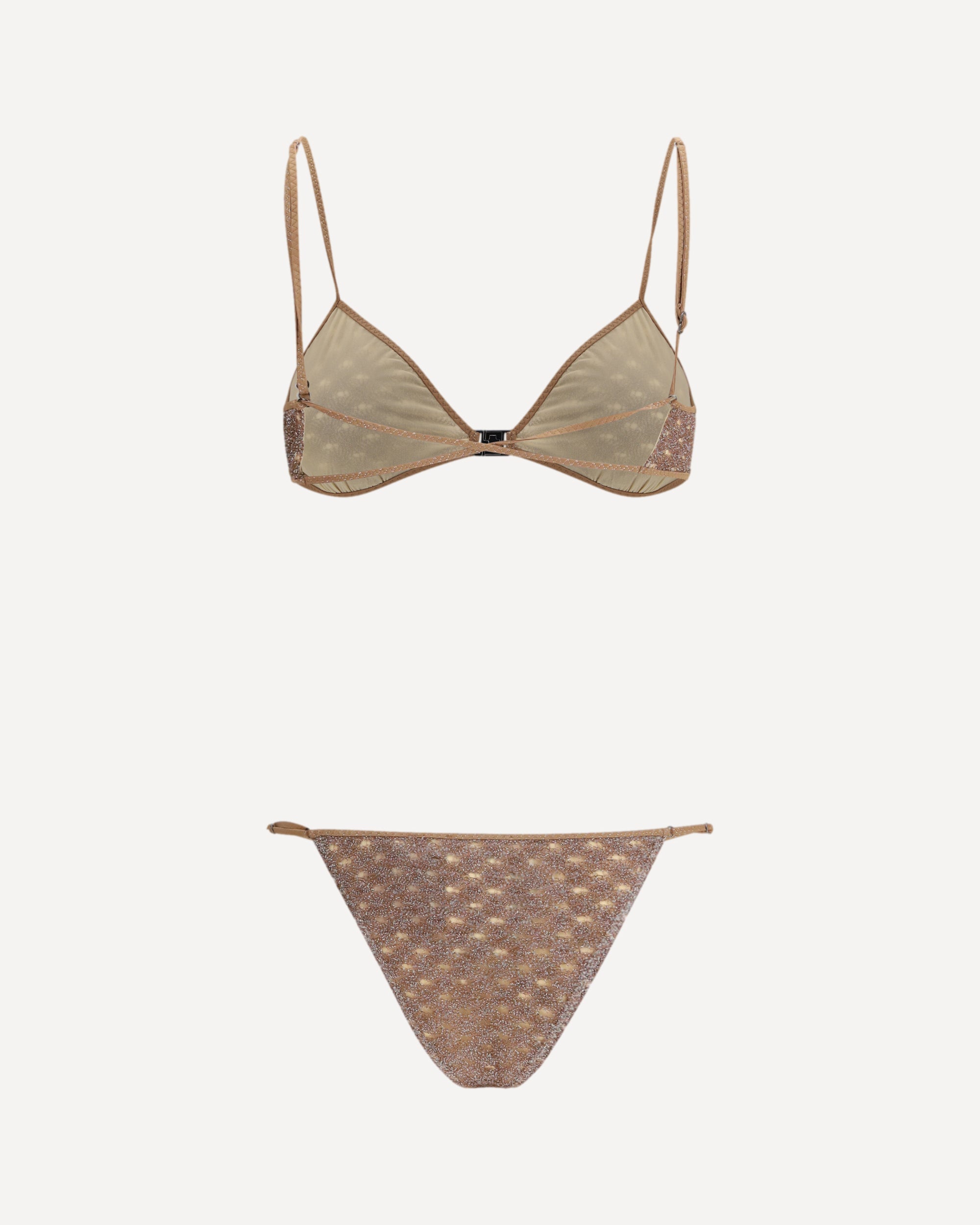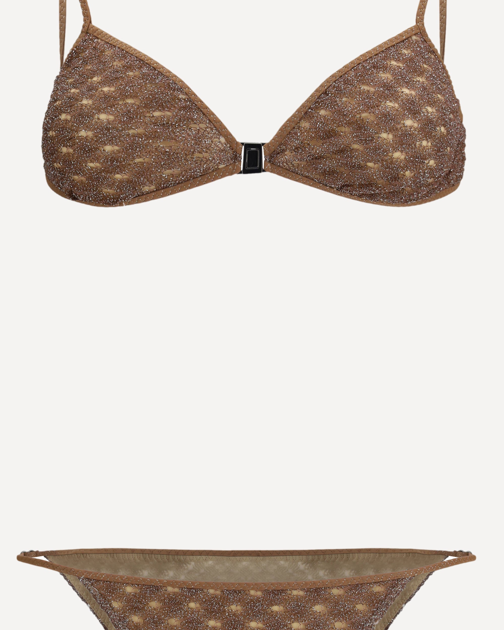The viscose lamé Bikini by Missoni is an adjustable bikini that combines elegance and comfort. Made with raschel weaving, it features a spiderweb lace pattern that creates a refined and luminous effect. The viscose lamé adds a touch of sparkle, making it perfect for sophisticated and fashionable beach looks.