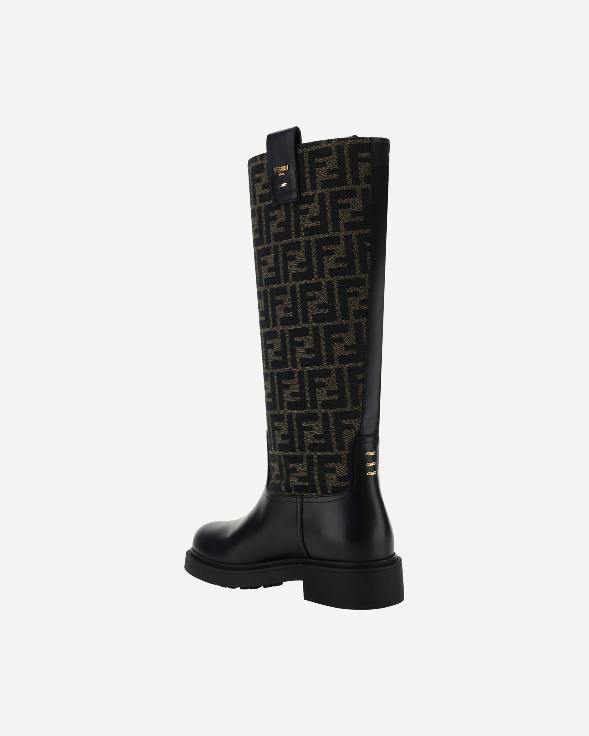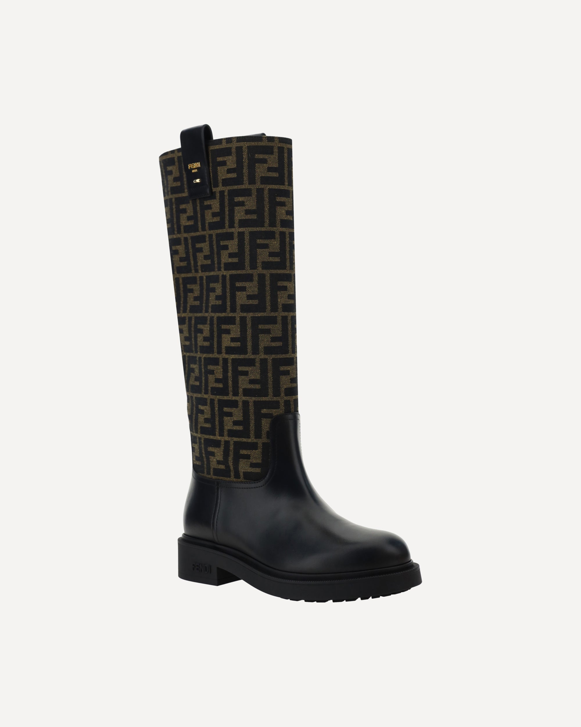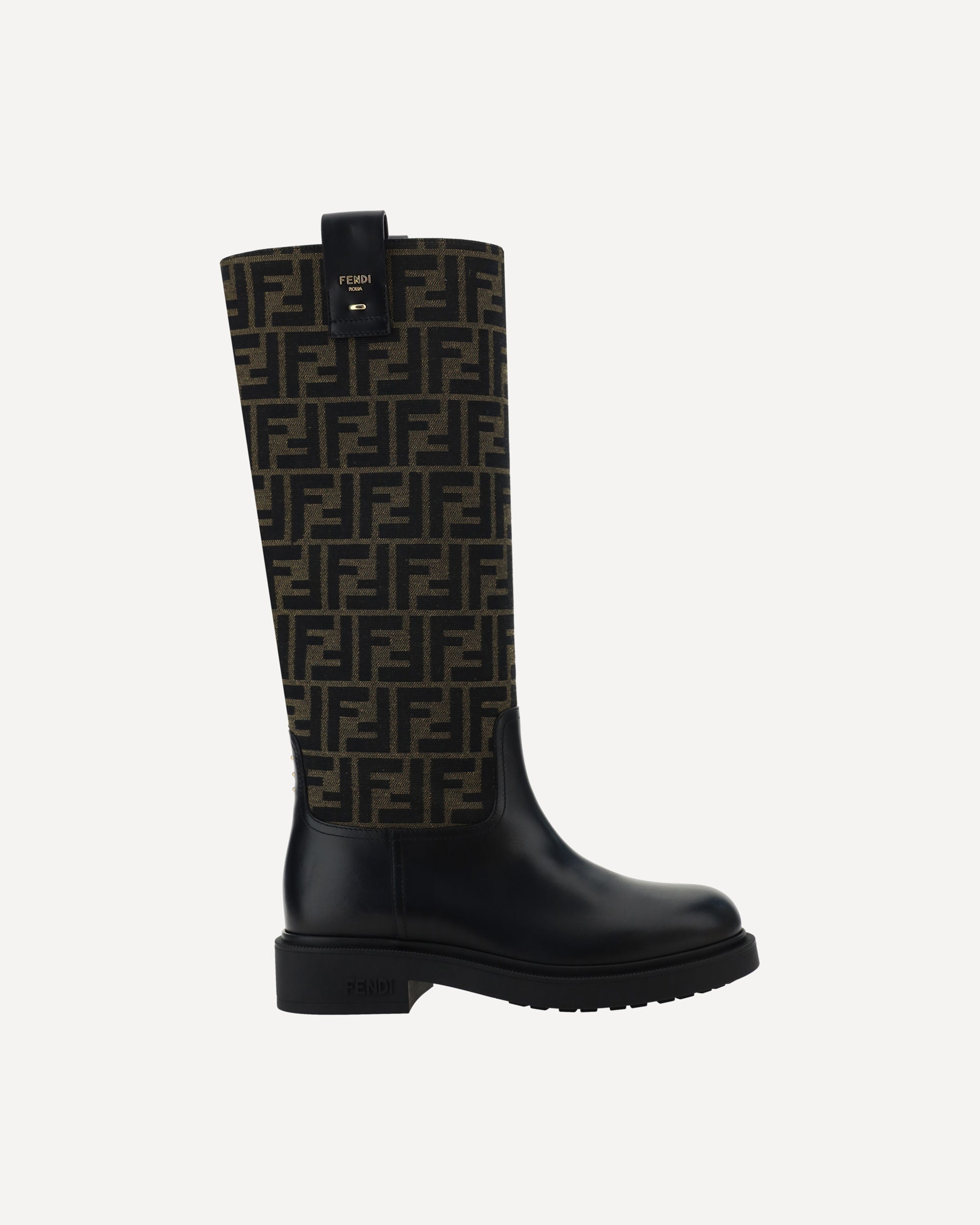 Fendi's Boots are distinguished by a round toe and leather details that add a touch of sophistication. The shaft is made of jacquard fabric with the iconic FF motif repeated all-over, a recognizable symbol of the maison. The rubber block heel ensures comfort and stability, while the three-dimensional brand monogram plaque applied on the back adds a distinctive and contemporary detail.