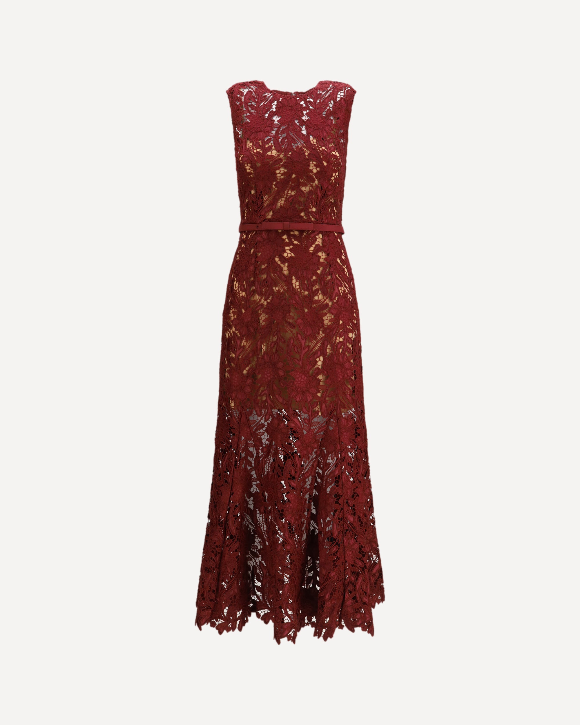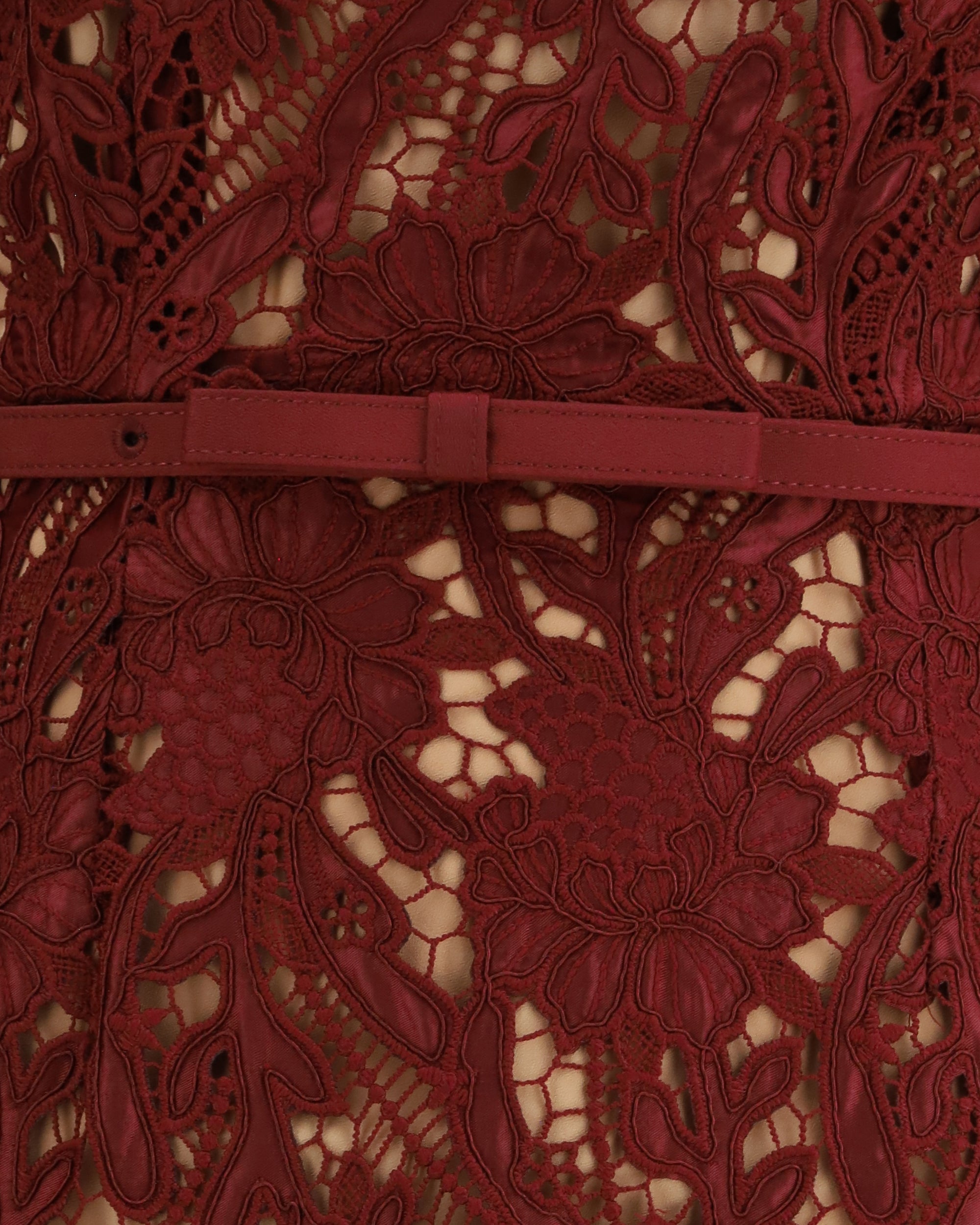The Guipure lace midi Dress by Self-Portrait is a celebration of refined femininity and timeless romance. Perfectly fitted, it combines a rich burgundy hue with the brand’s signature guipure lace, creating a sophisticated fit-and-flare silhouette. The removable belt defines the waist with elegance, while the dynamic midi hem adds fluid movement, designed to be showcased with heels on the dancefloor. Finished with a concealed back zip and a removable cami lining, this dress balances structure and delicacy with effortless allure.