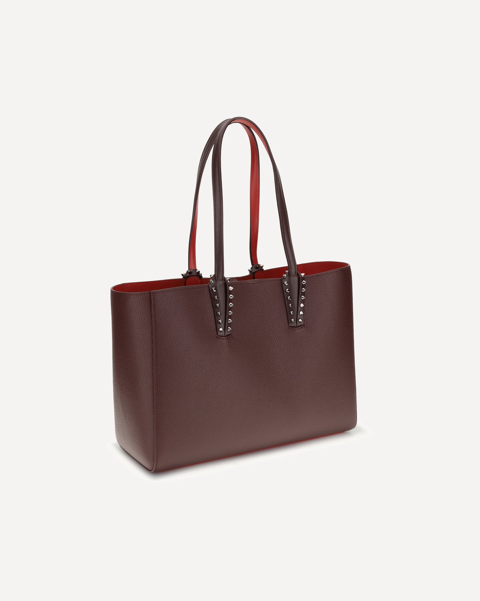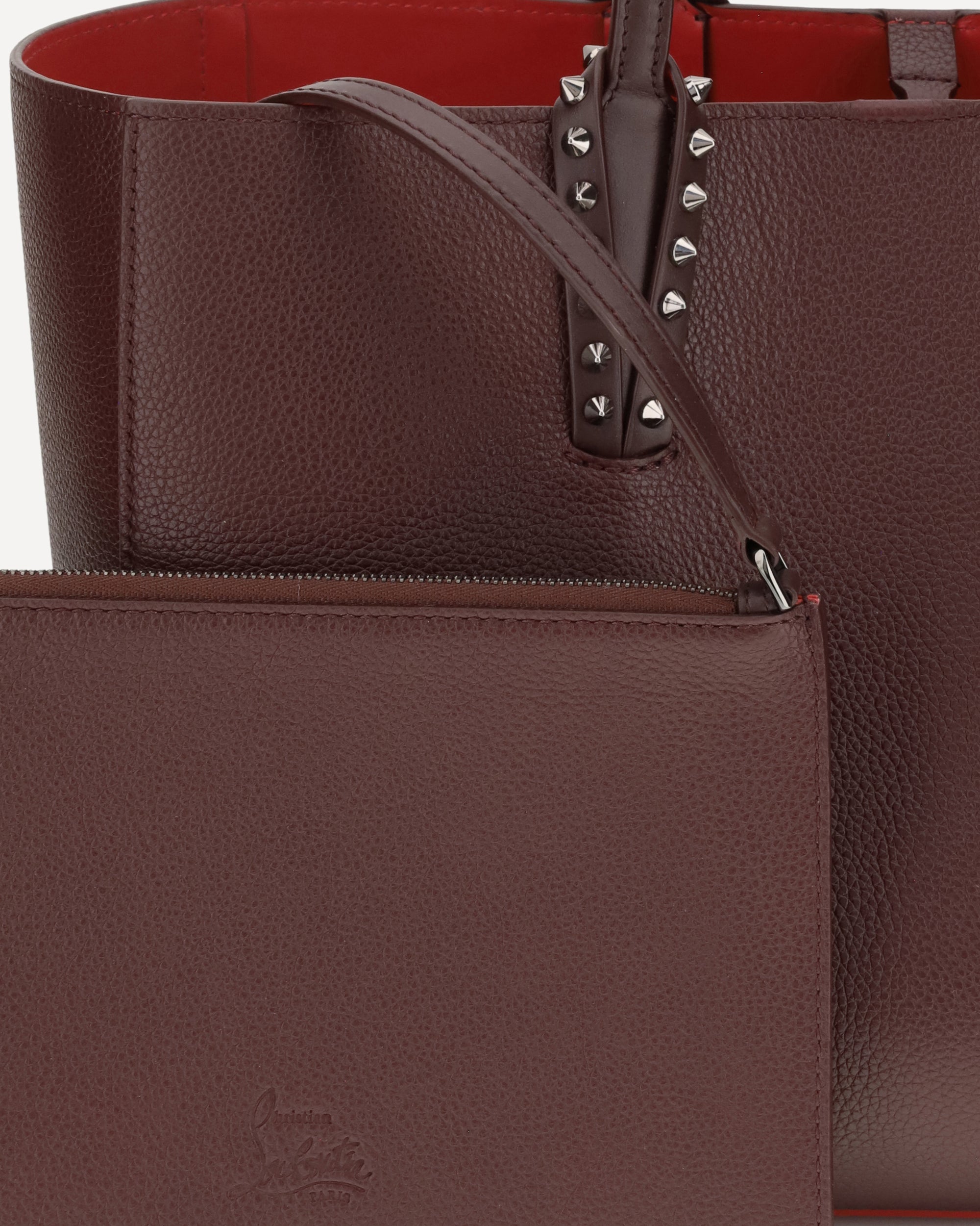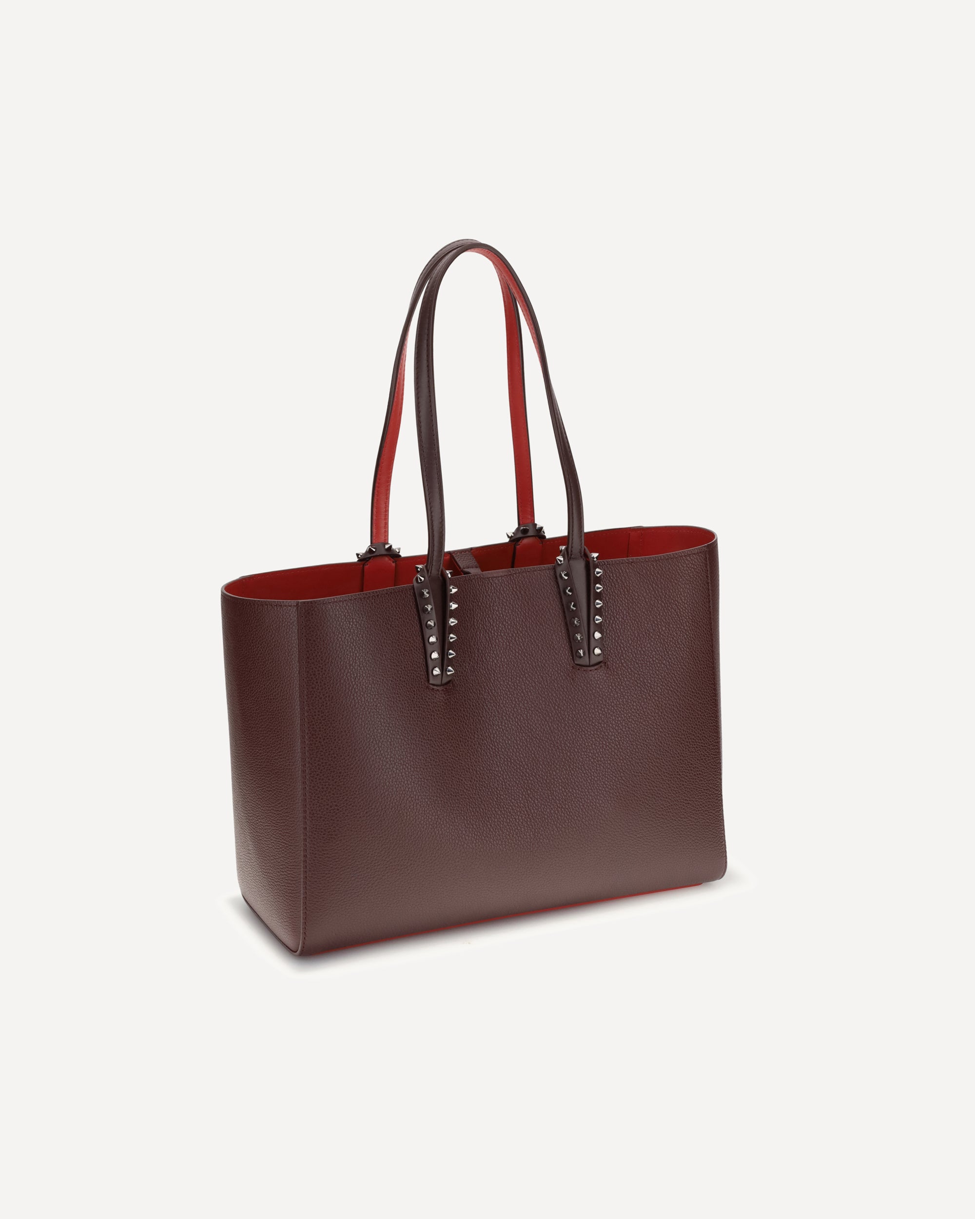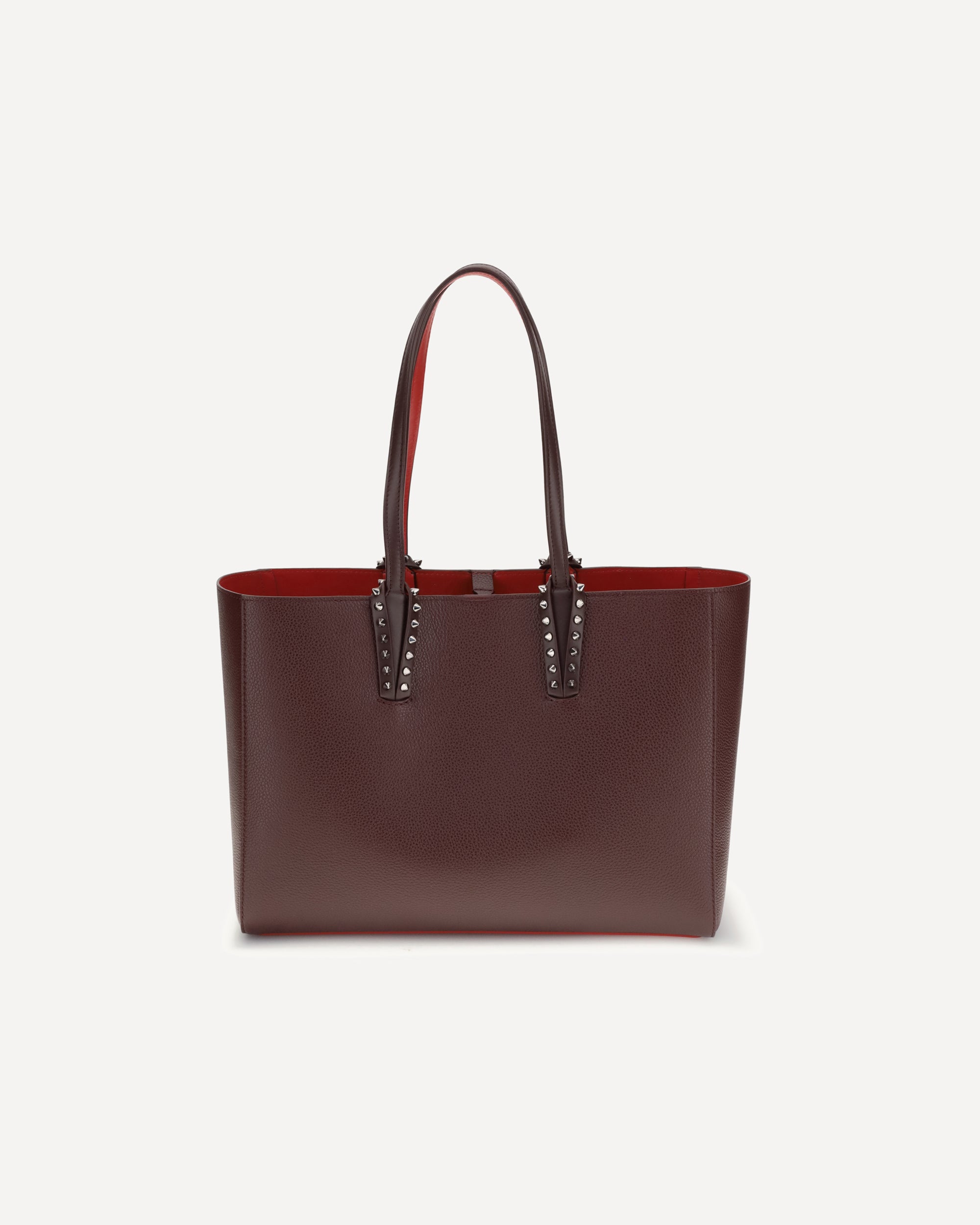 The garnet leather Cabata Tote Bag by Christian Louboutin is a luxurious and distinctive accessory that perfectly embodies the brand's bold and sophisticated style. Featuring two flat top handles, the bag is embellished with silver appliqué studs that add a touch of character. Inside, a single compartment, lined in red, the brand's iconic color, offers ample space for essentials. In addition, an interior zippered pouch provides an extra layer of organization and security.
