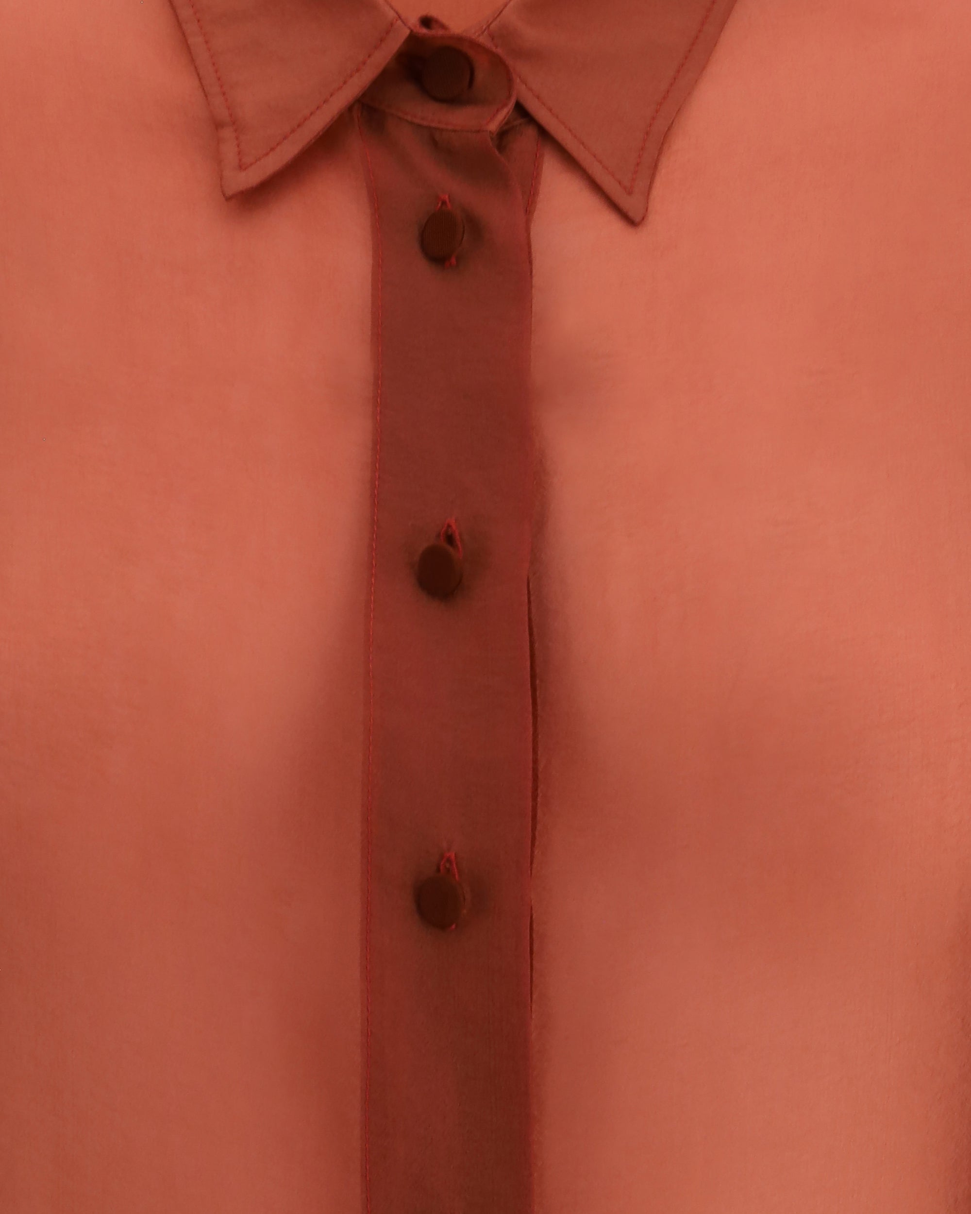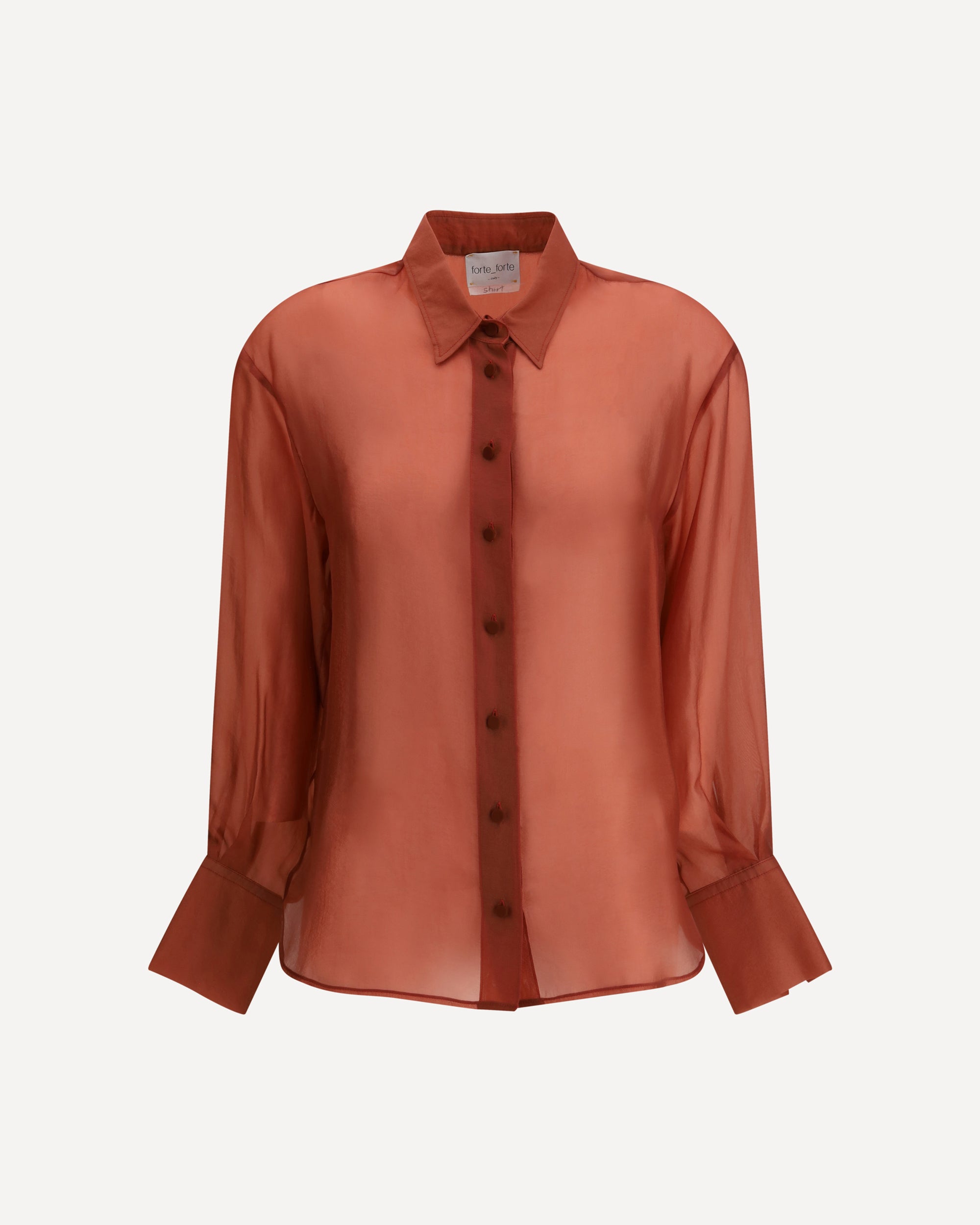 Forte_Forte's Organza Shirt is an ethereal and sophisticated garment that plays with the lightness and transparency of materials. Made of semi-transparent organza, it features a classic collar and a lined button front closure that enhances its minimal elegance. The delicate and feminine design makes it perfect for light overlays or bolder combinations, in a refined balance between sensuality and discretion.