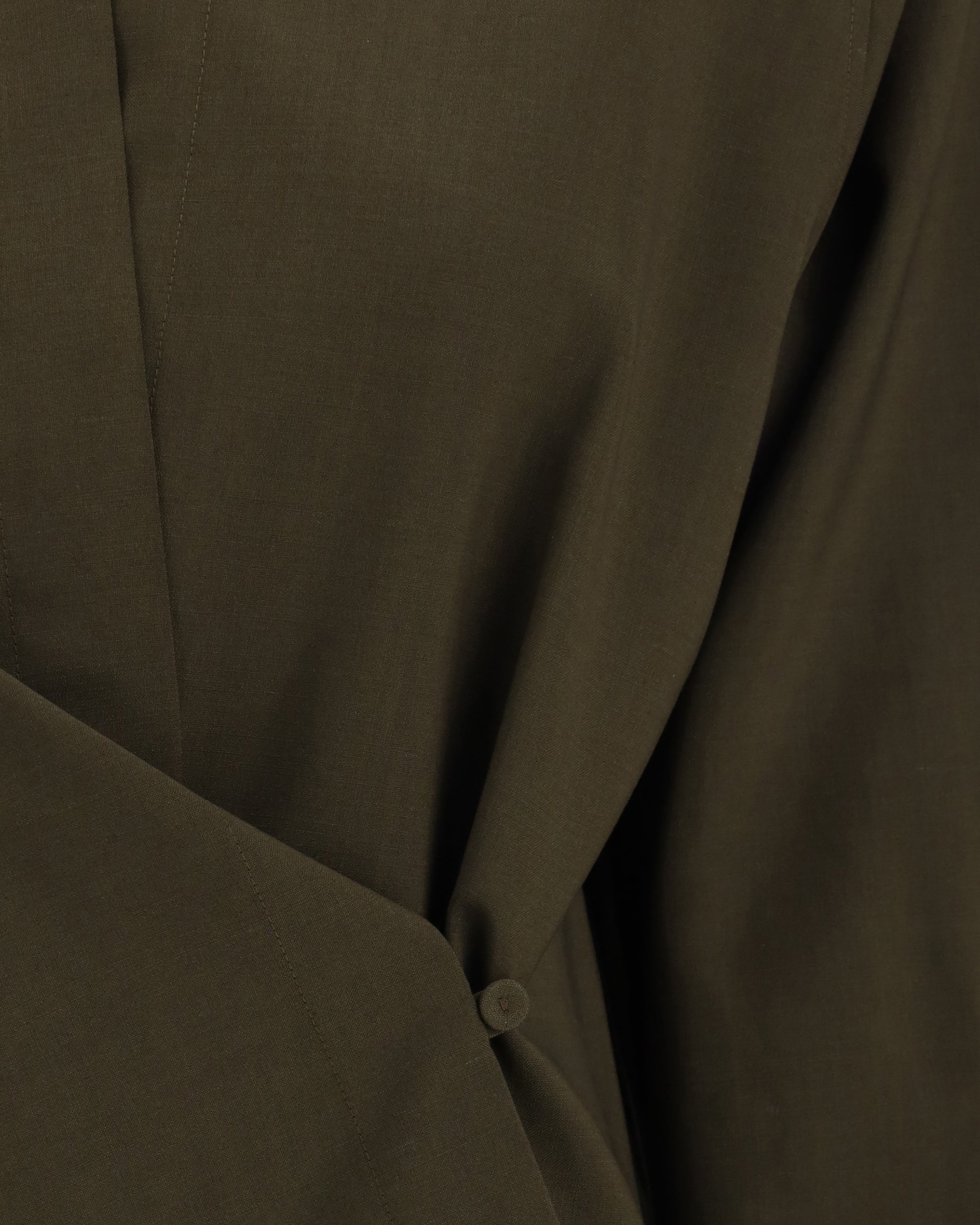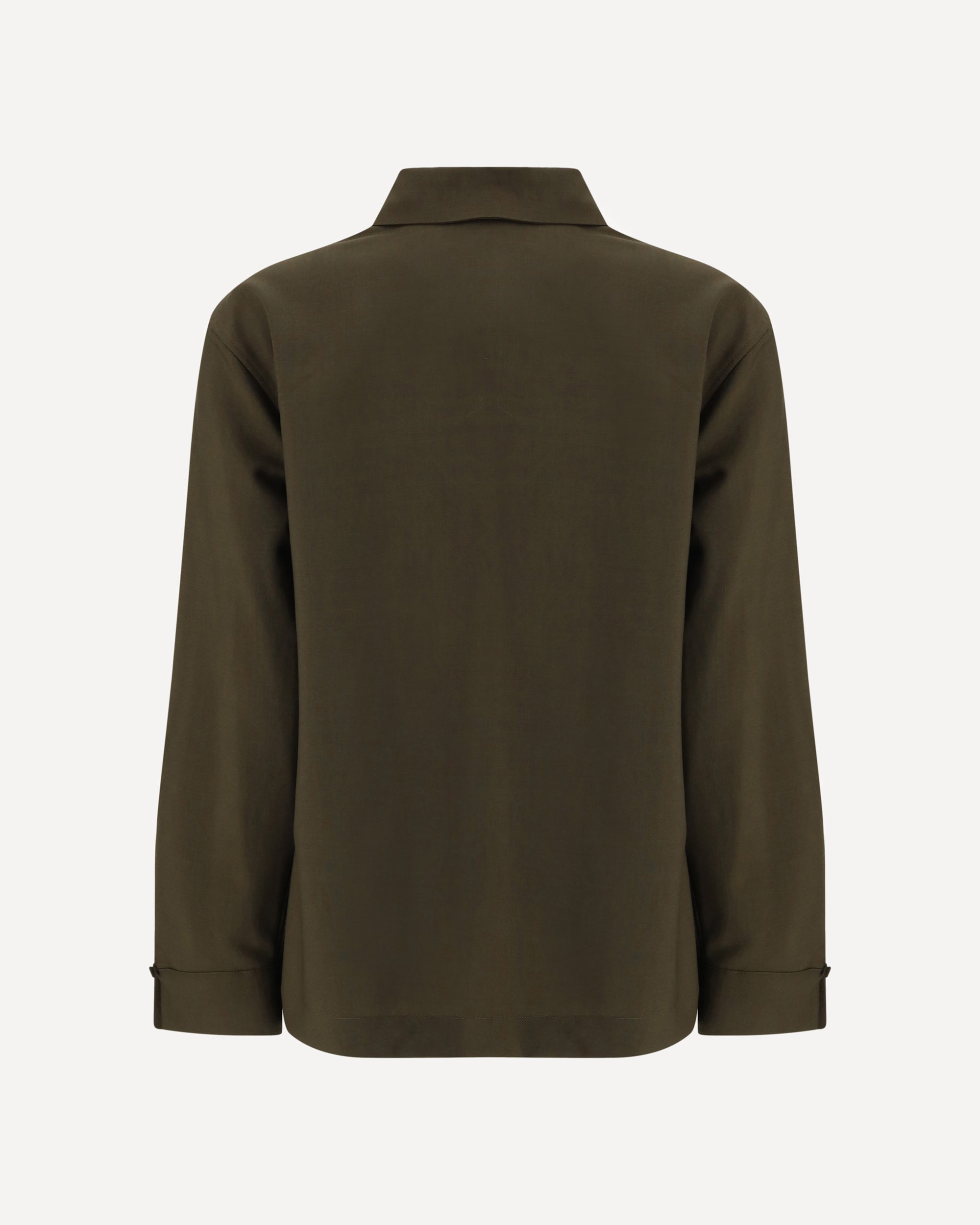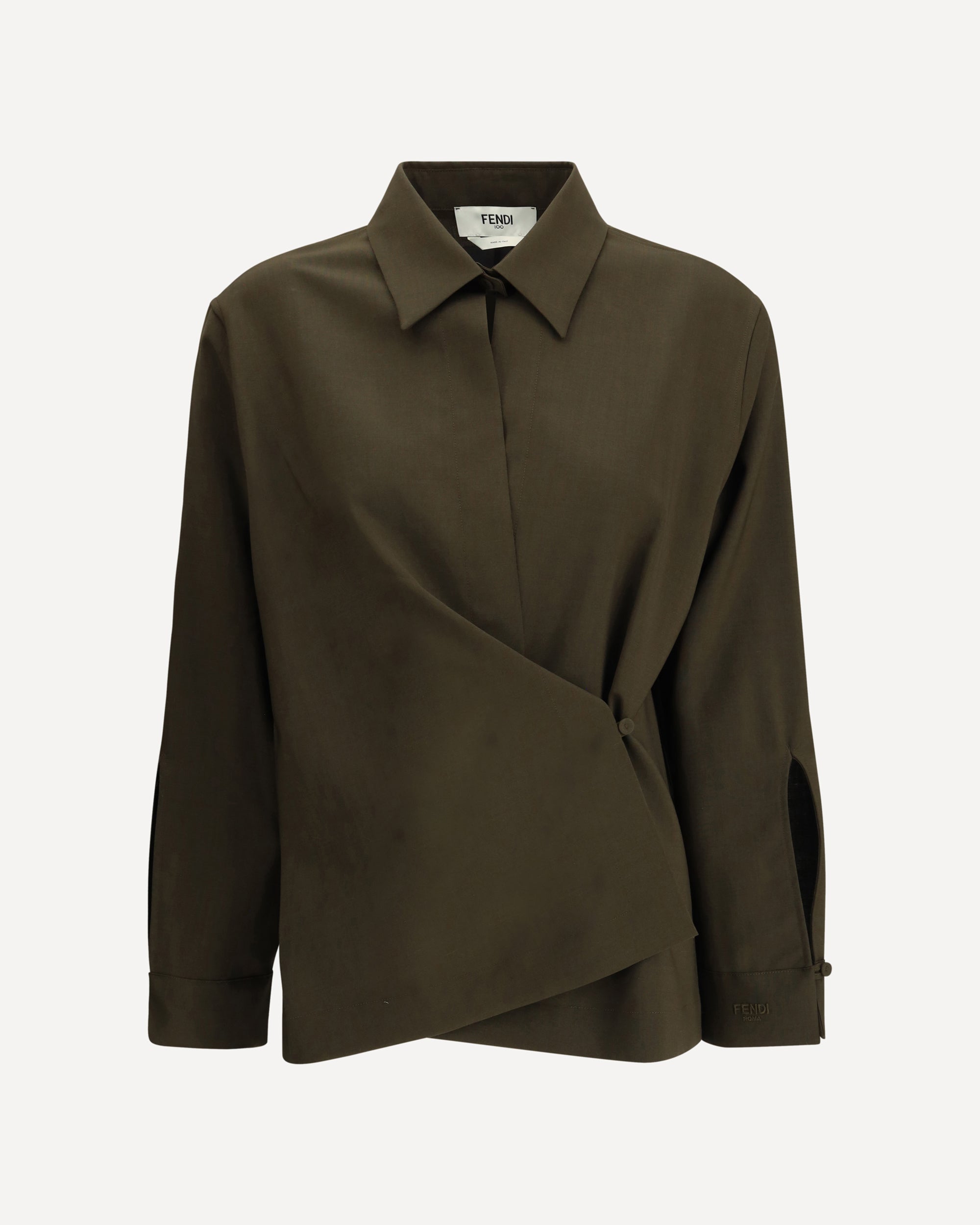 The Fendi Shirt in Wool and Mohair reinterprets classic tailoring with a bold, contemporary twist. The wrap-around silhouette is enhanced by an asymmetric closure with a small side button, creating an elegant draped effect at the waist and a refined cut-out detail at the décolleté. A pointed collar and tall buttoned cuffs emphasize its sartorial construction, while the tone-on-tone Fendi Roma embroidery on the left cuff provides a discreet yet unmistakable signature. A piece that blends femininity, modernity, and the artisanal mastery of the Maison.