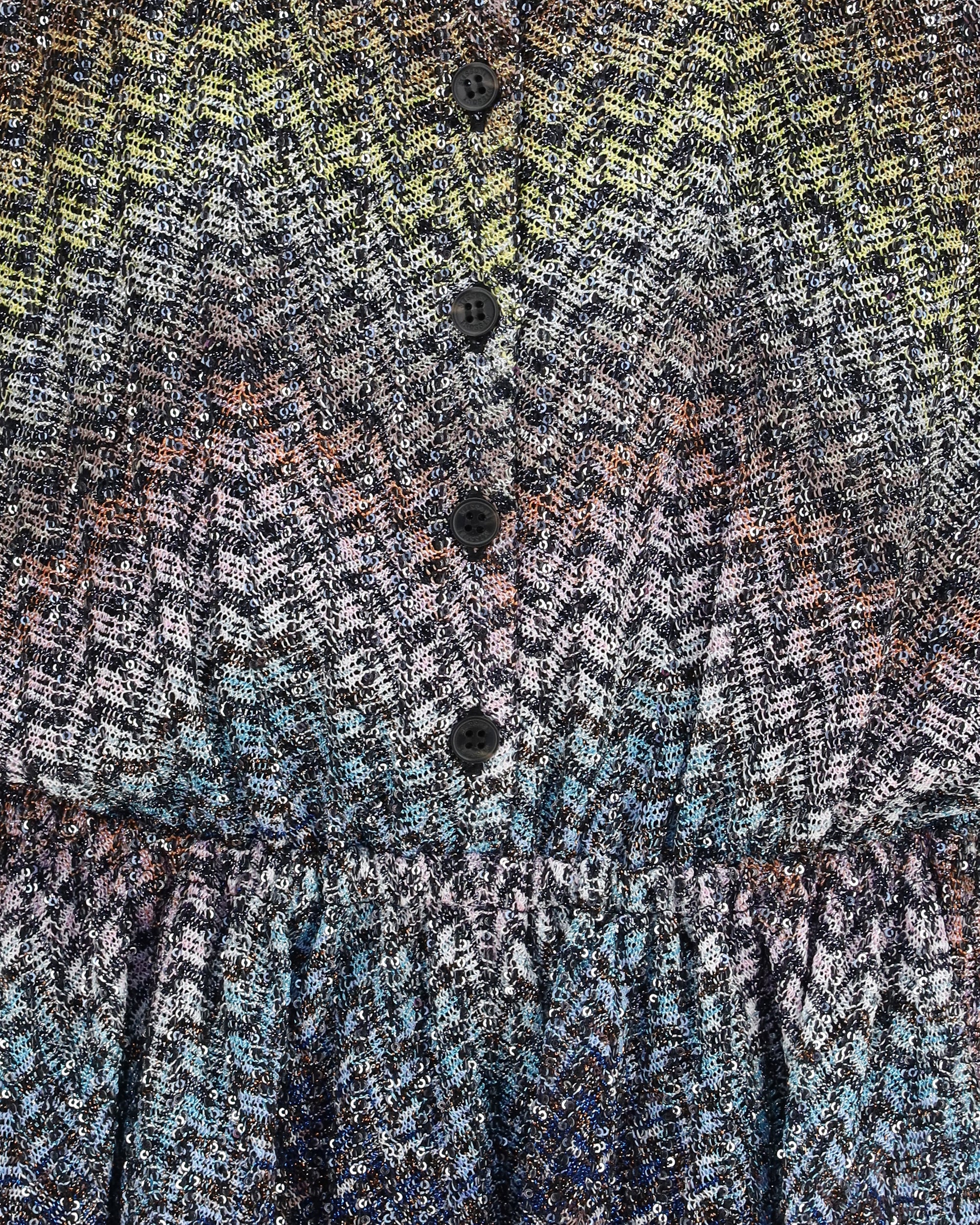 The long-sleeve Caperdoni mini Dress by Missoni is an elegant and dynamic Dress, featuring a feminine silhouette with a flared skirt. The design includes an elasticated waist to define the figure and a full front button closure up to the neck for a structured look. Long sleeves with cuffs and applied sequins add brightness and refinement. Perfect for sophisticated and statement looks.