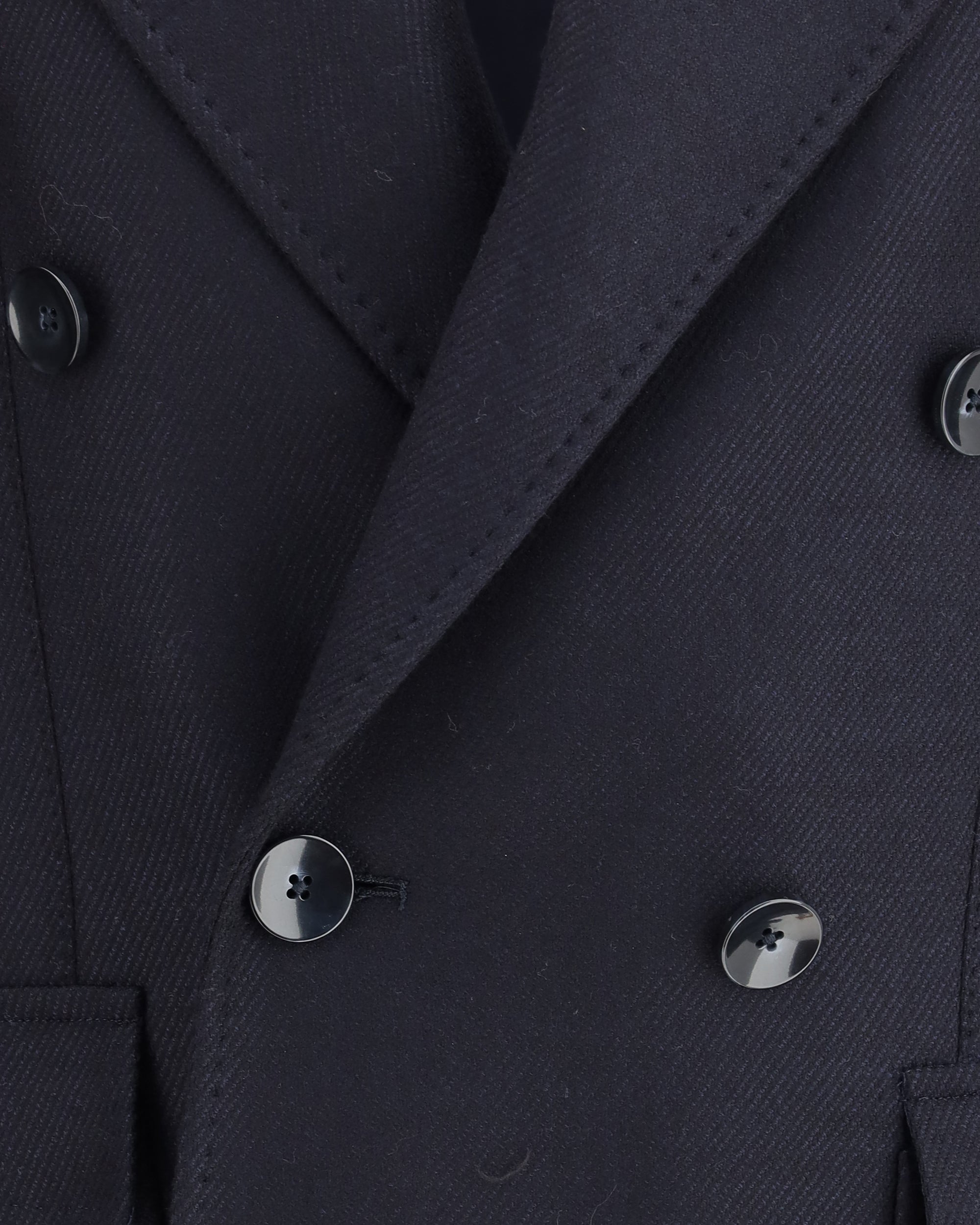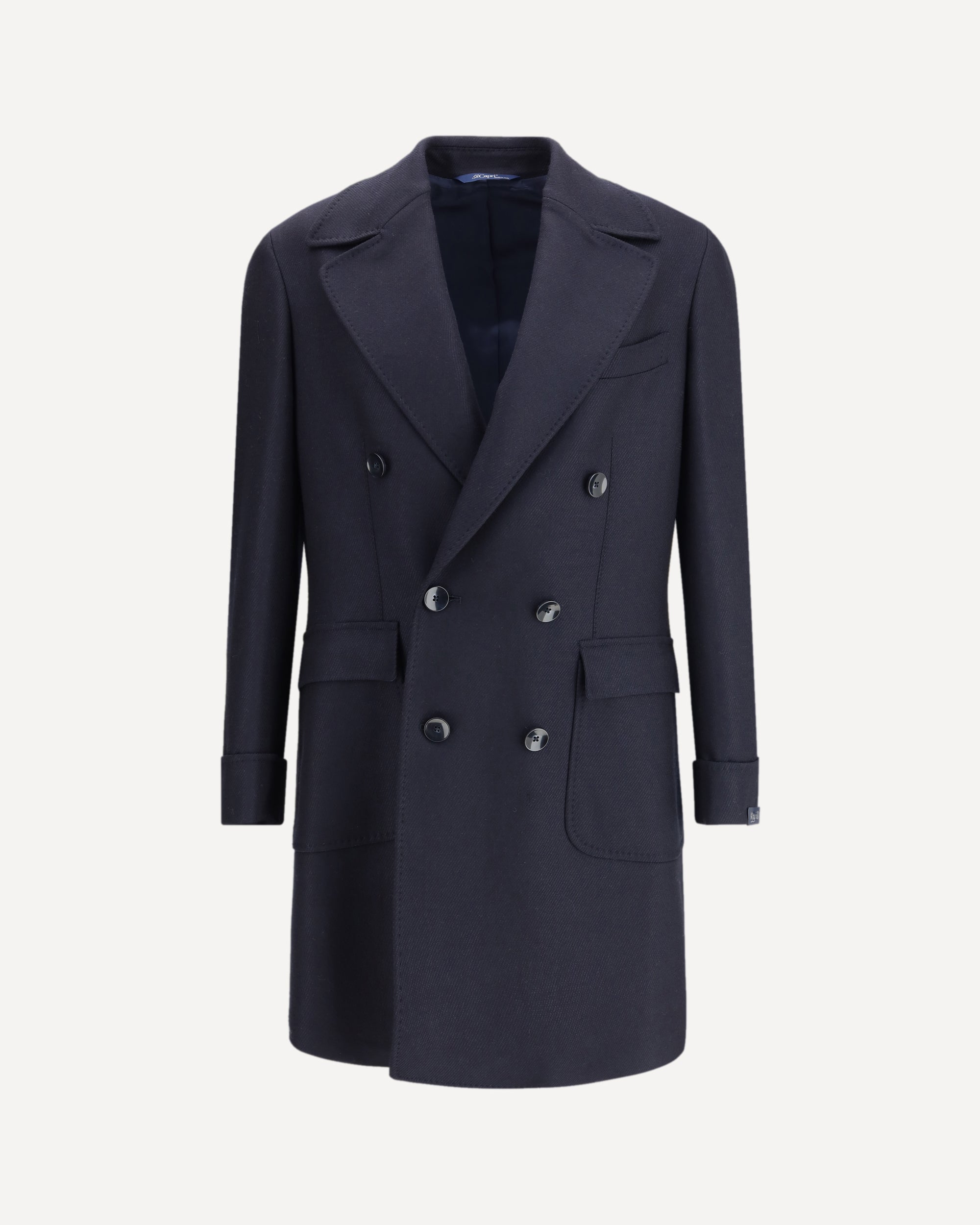 The Gi Capri Coat is a refined double-breasted design crafted from pure virgin wool, featuring classic lapels and two front flap pockets. A fabric band on the back provides a distinctive and modern touch, elevating this timeless piece with a note of understated sophistication.