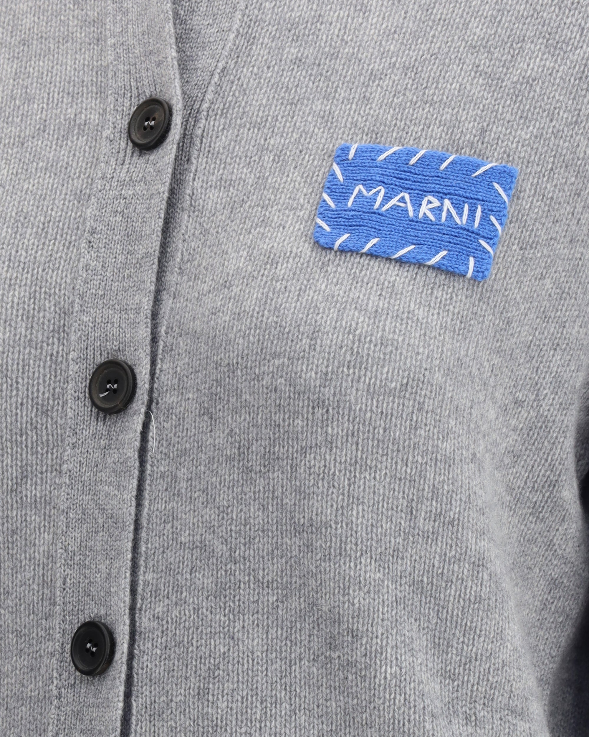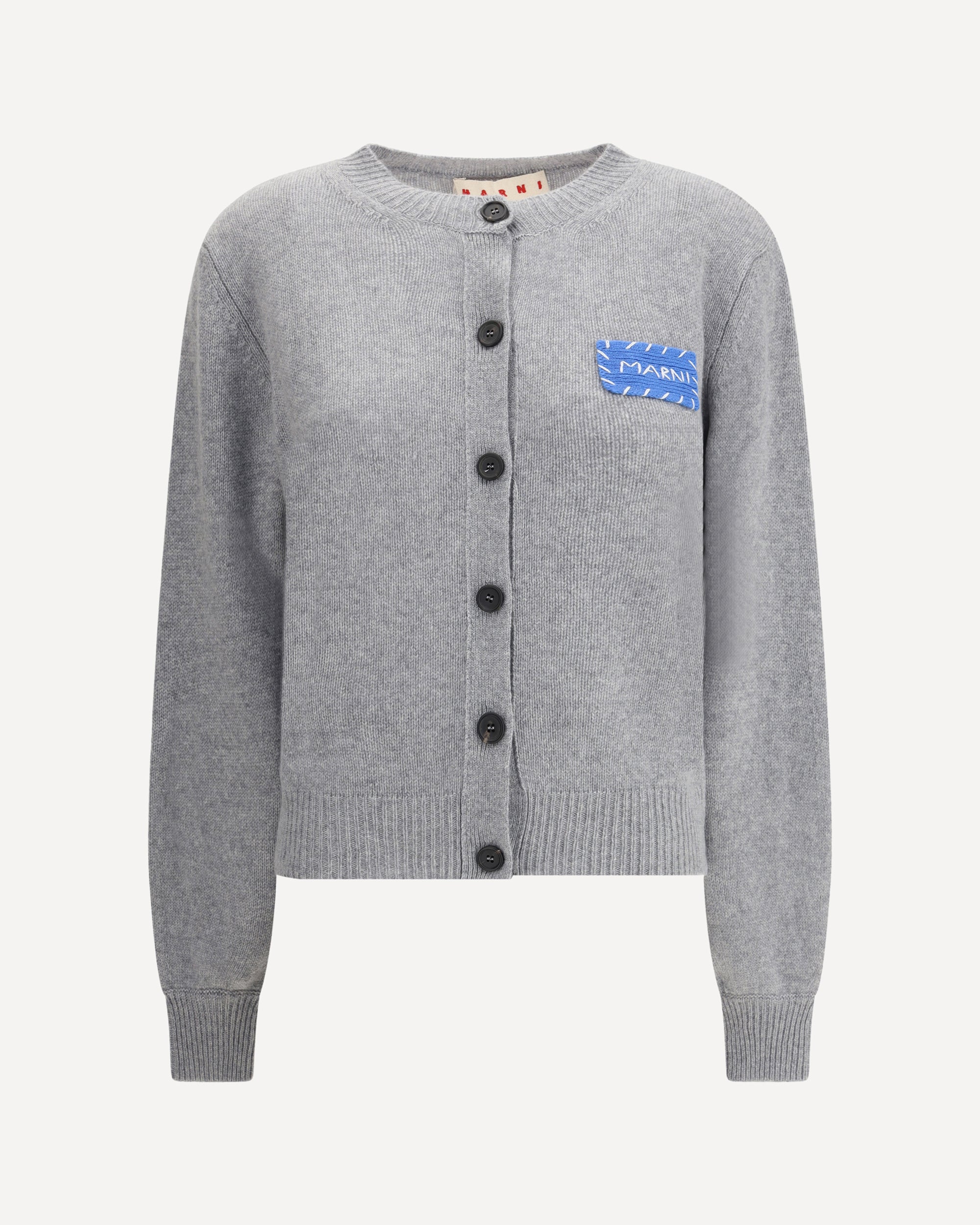 The Marni cashmere Cardigan is a sophisticated essential. Featuring a ribbed crew neck, hem and cuffs, it features a patch sewn onto the front with the brand's iconic signature, a distinctive detail that adds a graphic and recognisable touch to the clean design.