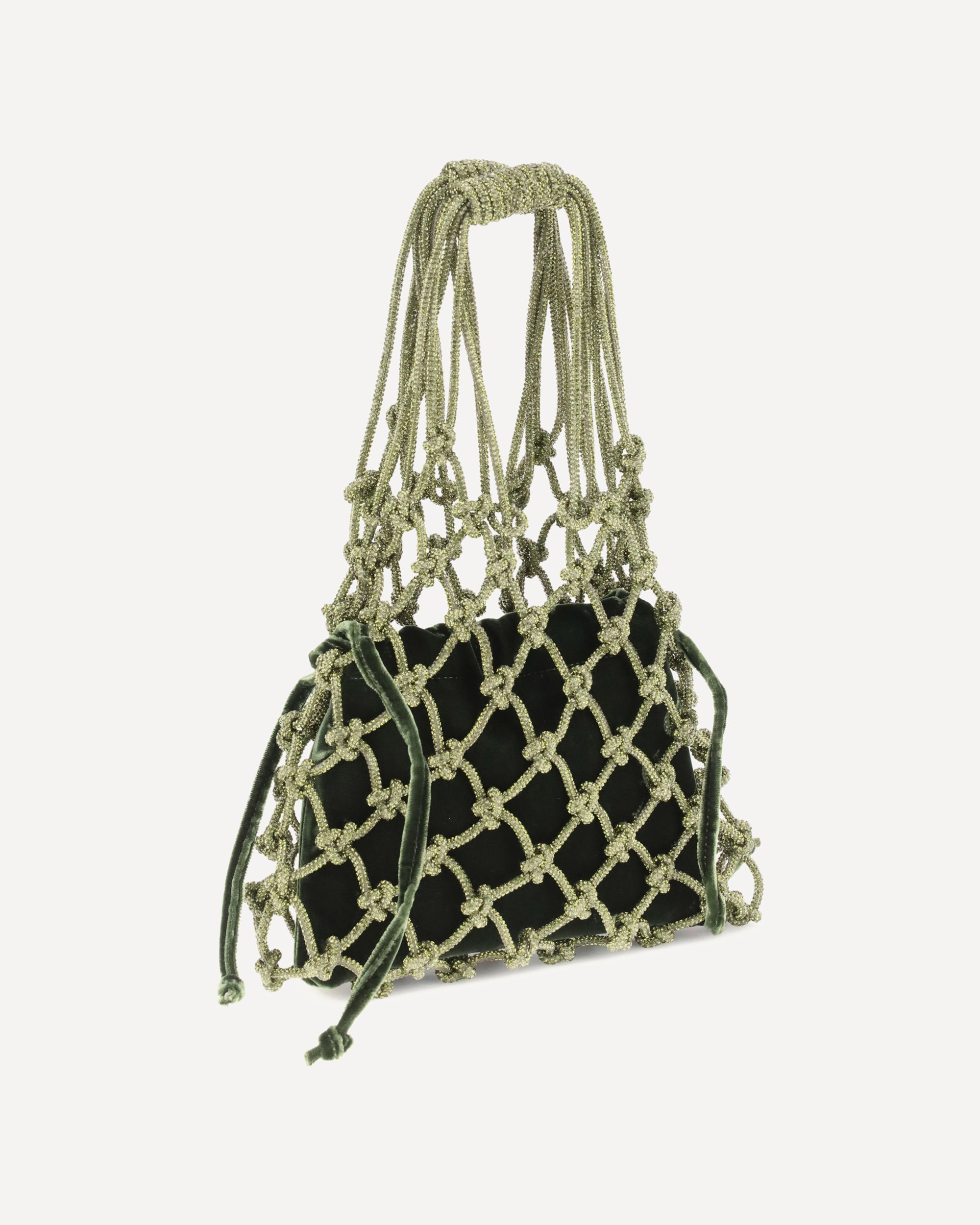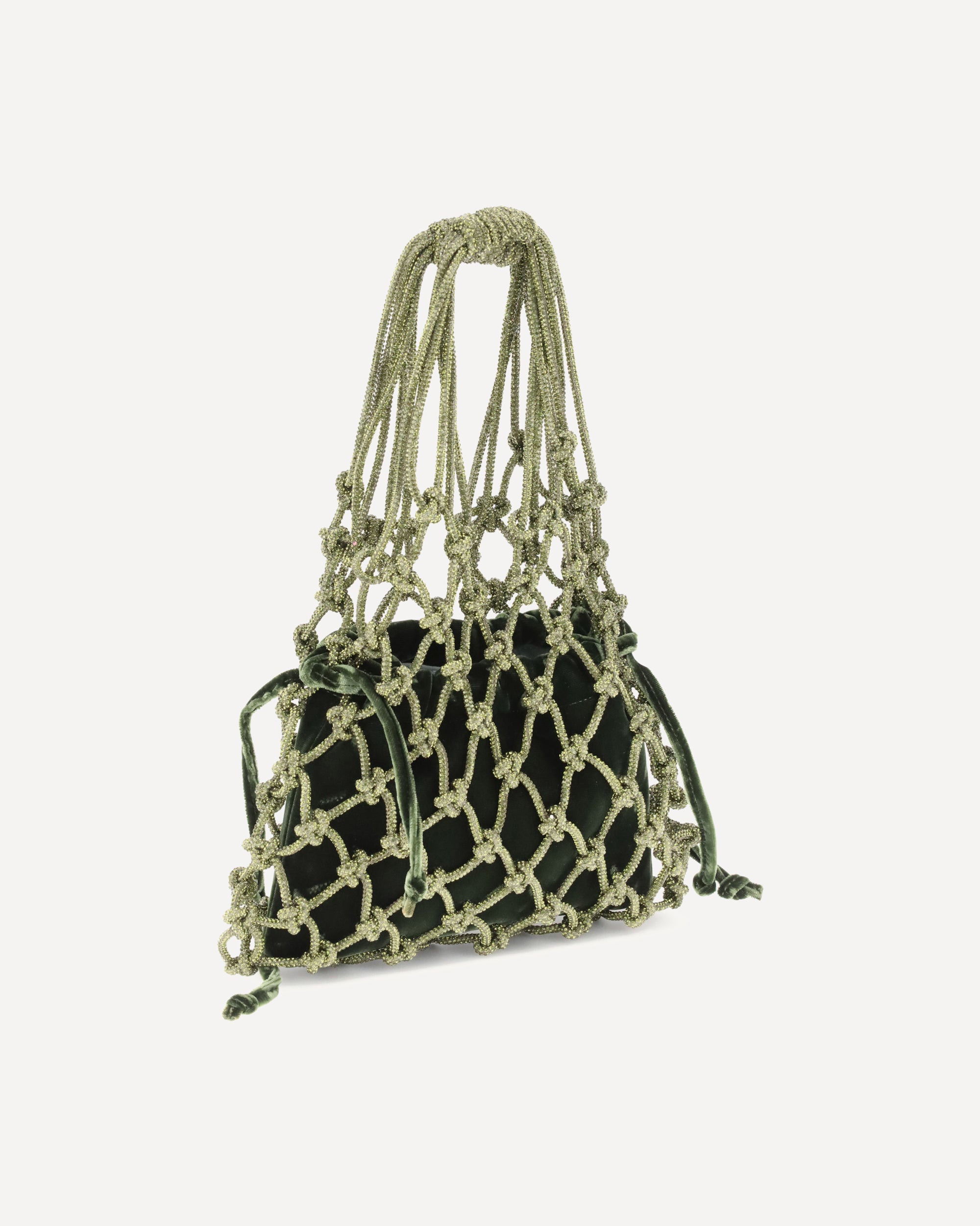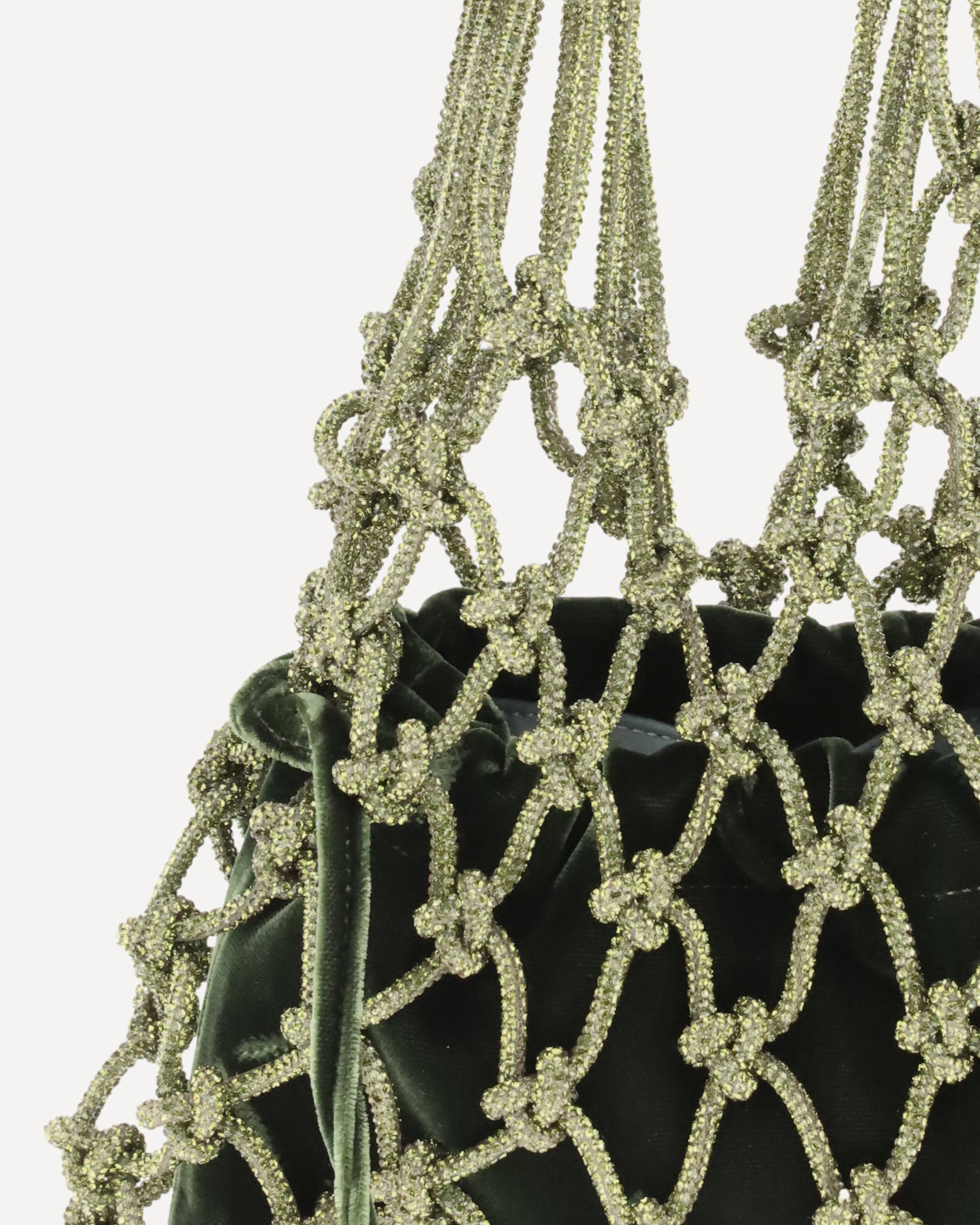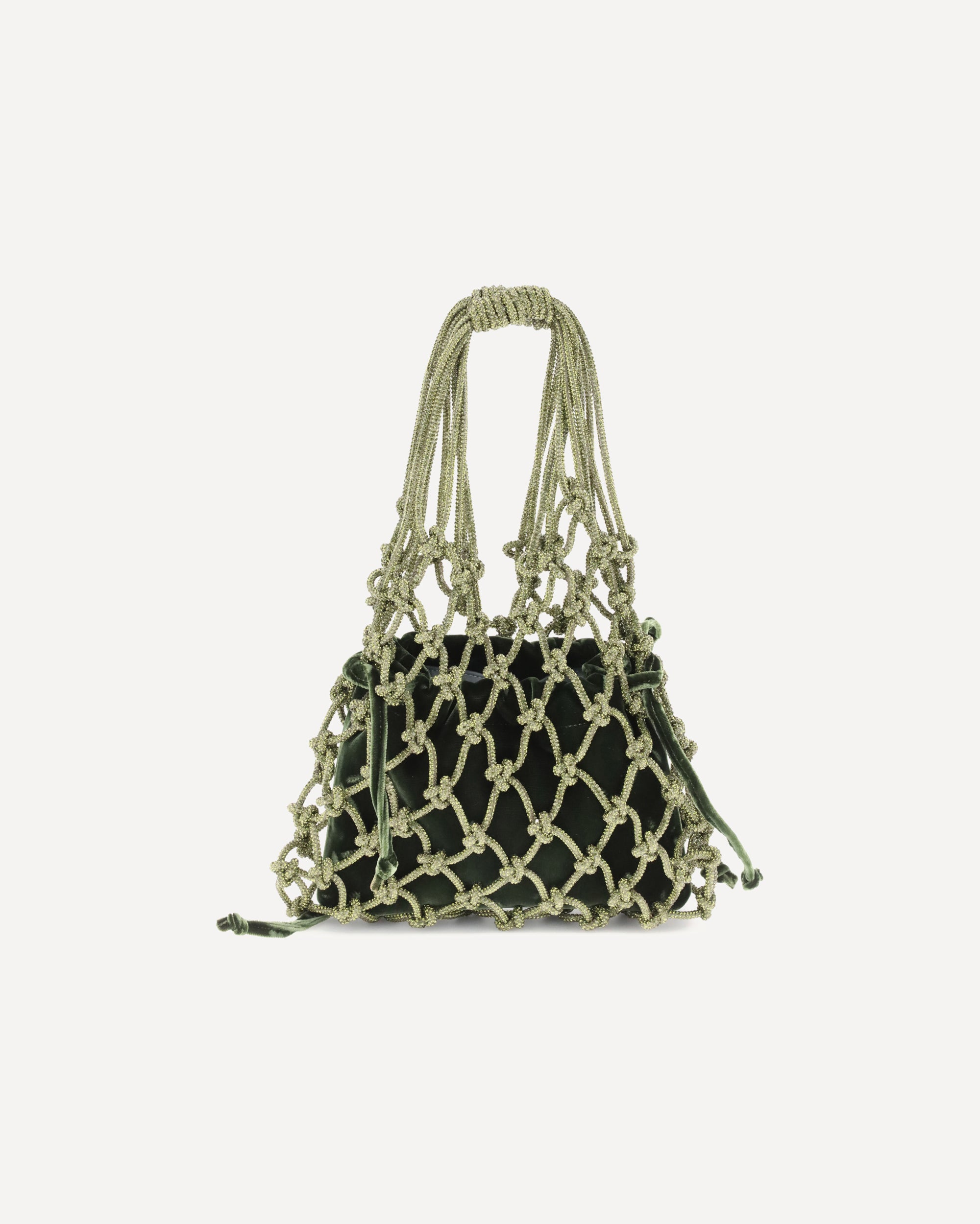 Carrie Handbag by Hibourama, Featuring a mesh woven with a precious string of crystals and an on-tone interior pouch, this mini bag with its shimmering texture is able to dance with light in a continuous dialogue with the look, framing and illuminating it with every step.