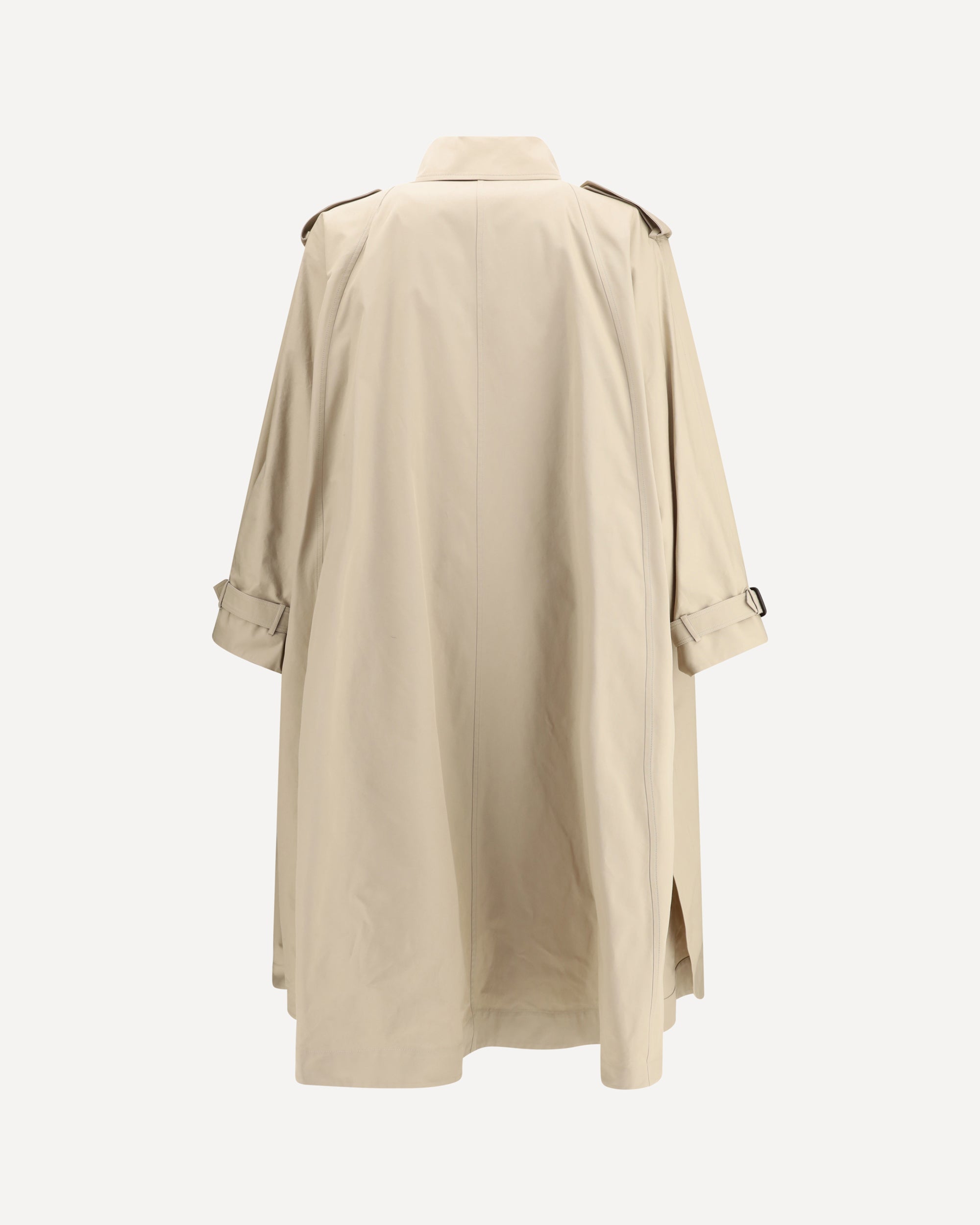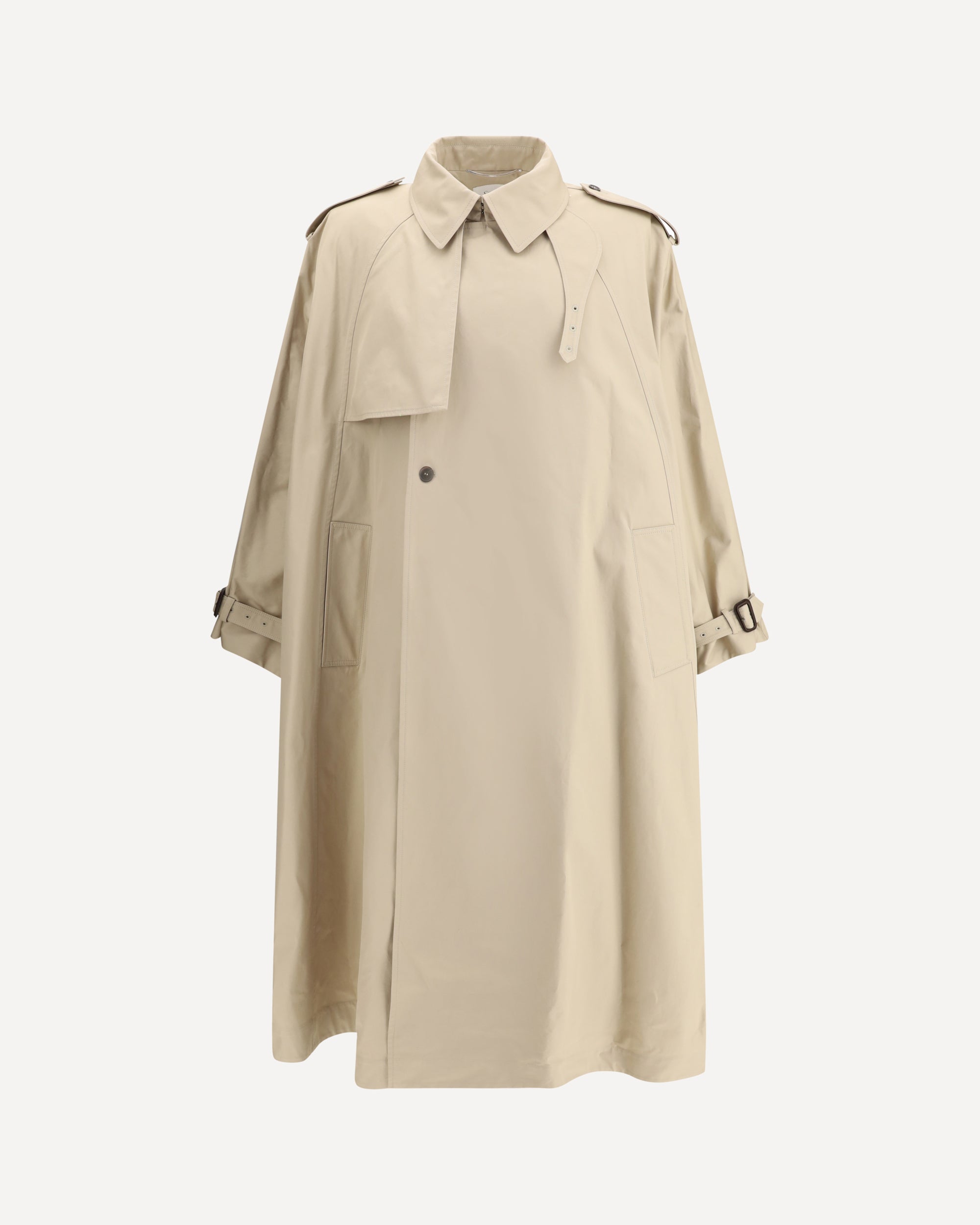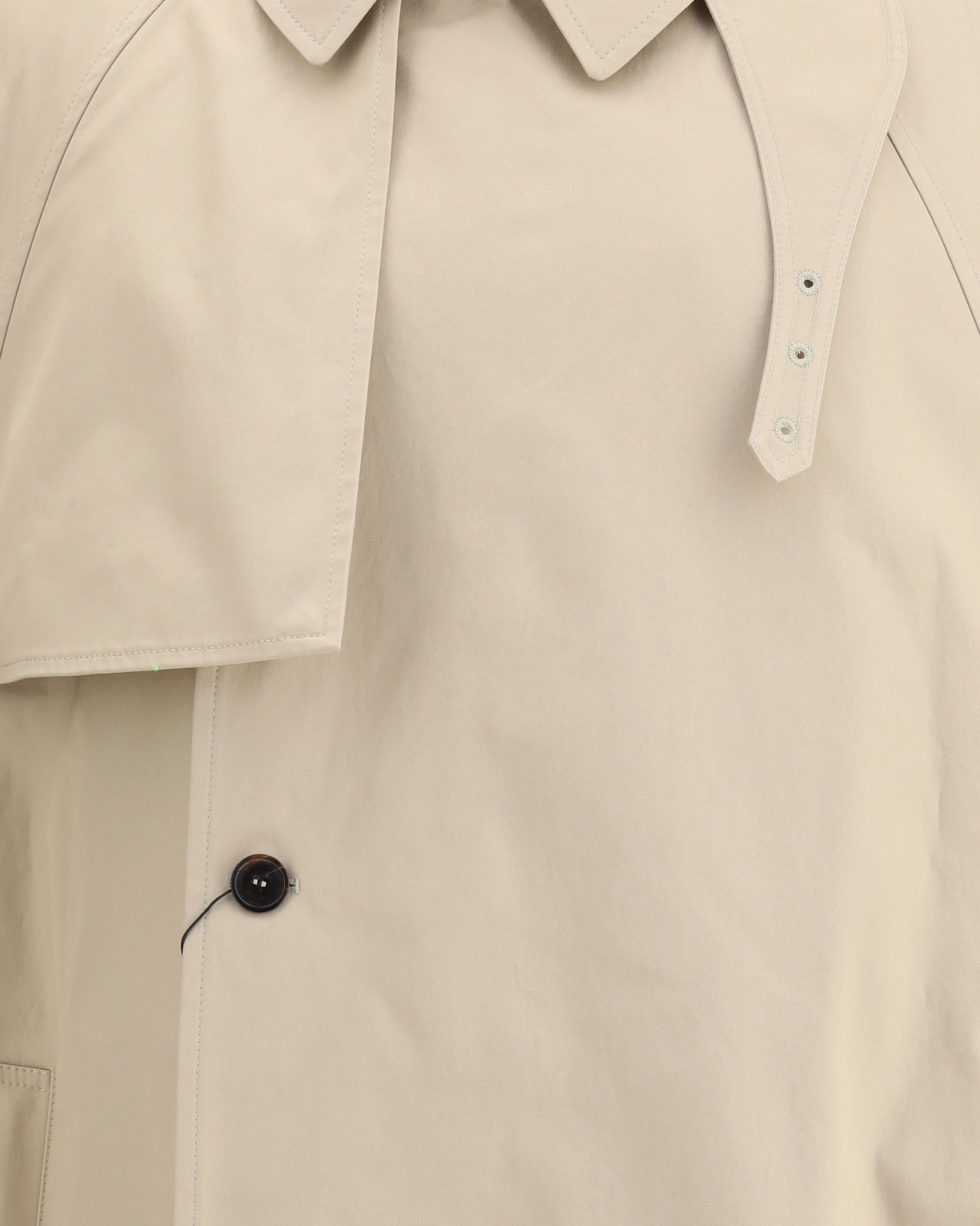 Saint Laurent's cotton twill Trench Coat reinterprets the classic silhouette with textured details and military elegance. Made of certified cotton, it features a cape design with a pointed collar and adjustable chin strap, windproof flap, padded shoulders and straps on the cuffs. The front button and hook-and-eye closure at the collar, along with the two profiled pockets, complete a refined and functional garment.