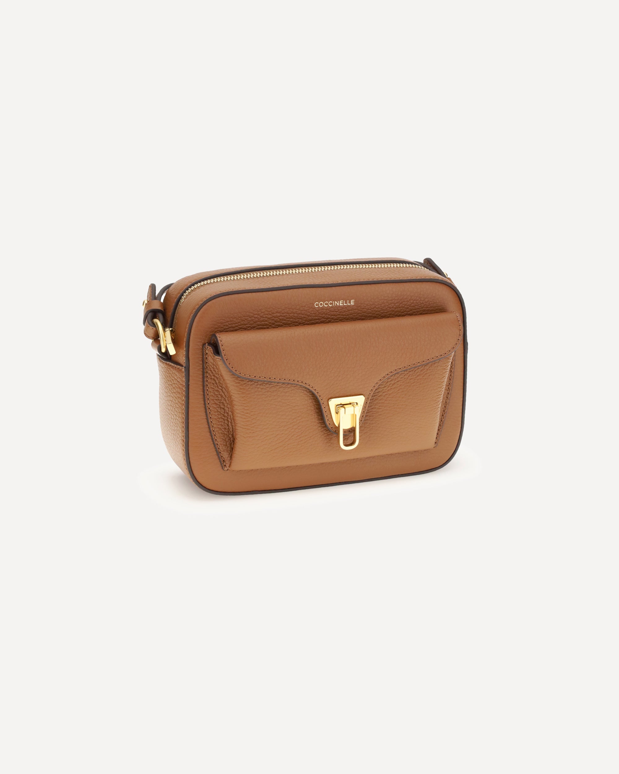 Calfskin Beat Soft Shoulder Bag by Coccinelle, top zip fastening, removable and adjustable flat leather shoulder strap, iconic brand monogram printed in contrasting pressure on the front, front patch pocket with flap fastening and gold-plated metal interlocking system, garnet leather design.