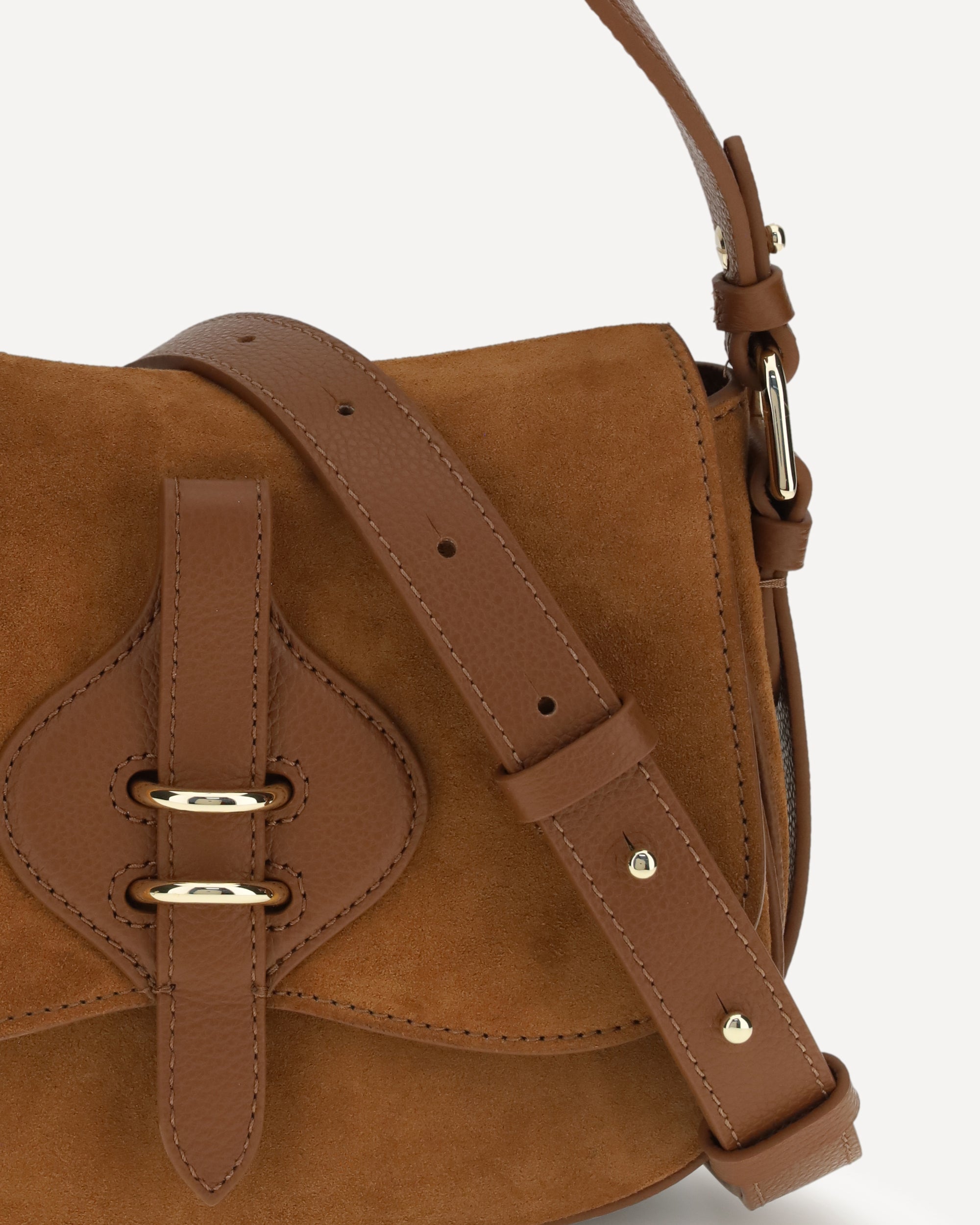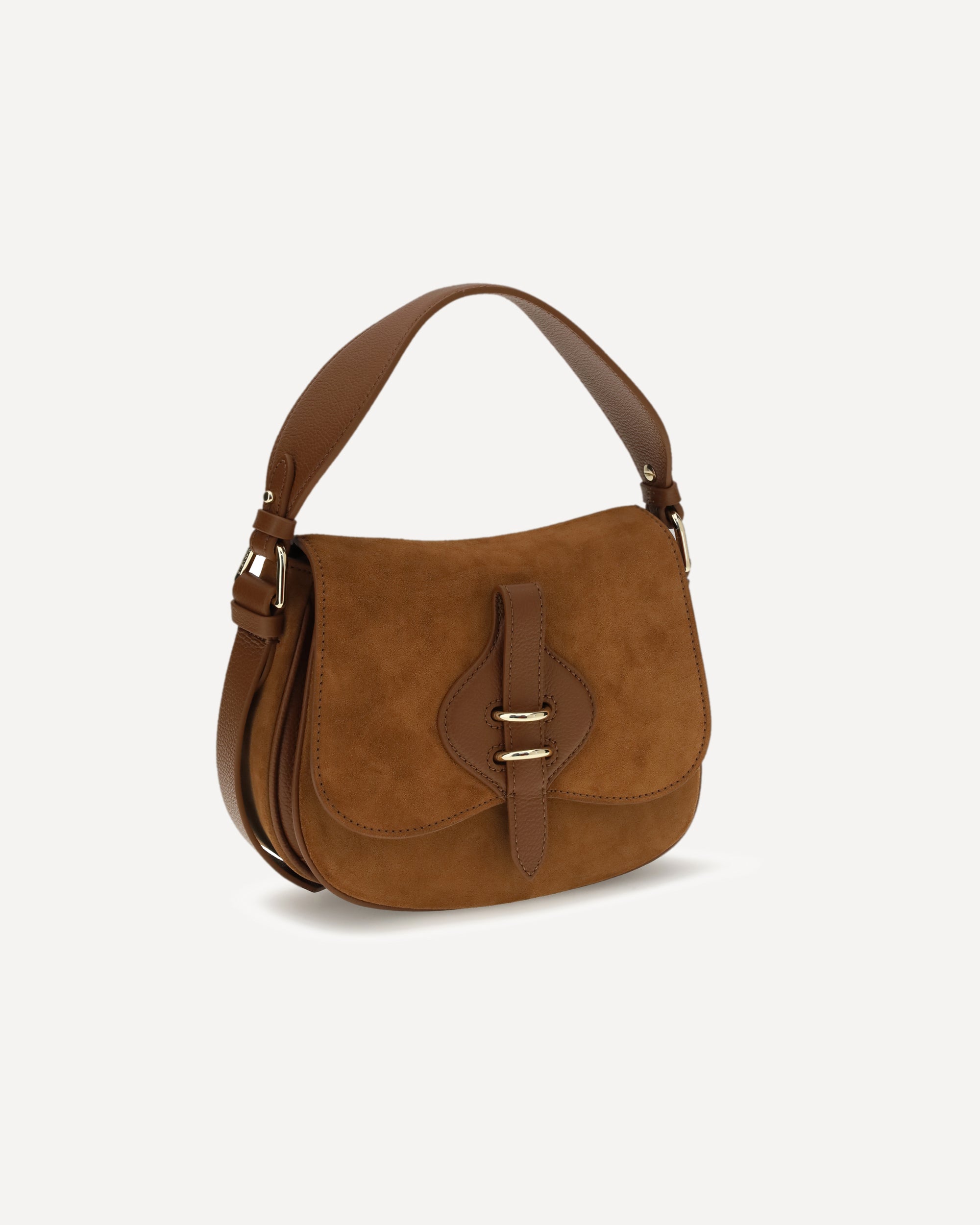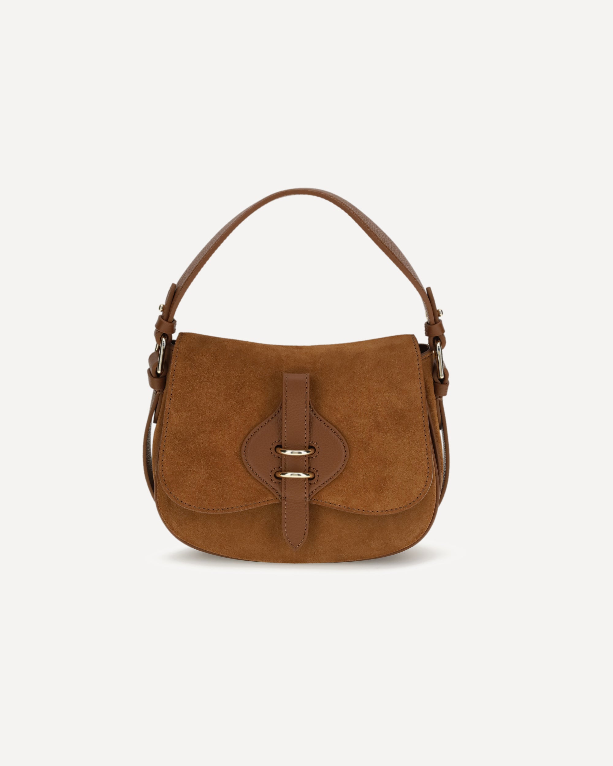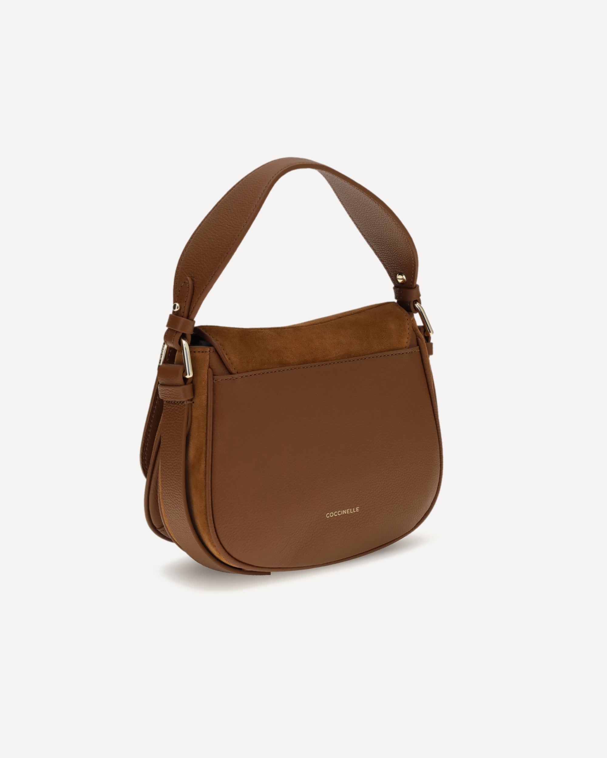 The small Mavery Shoulder Bag by Coccinelle combines suede and leather with micrograin for an elegant and tactile effect. Featuring a magnet closure, it can be carried by hand thanks to the removable handle or over the shoulder via the removable and adjustable leather shoulder strap. The interior is organized into two compartments, while the light gold electroplating and gold stamp logo add a refined and contemporary touch.