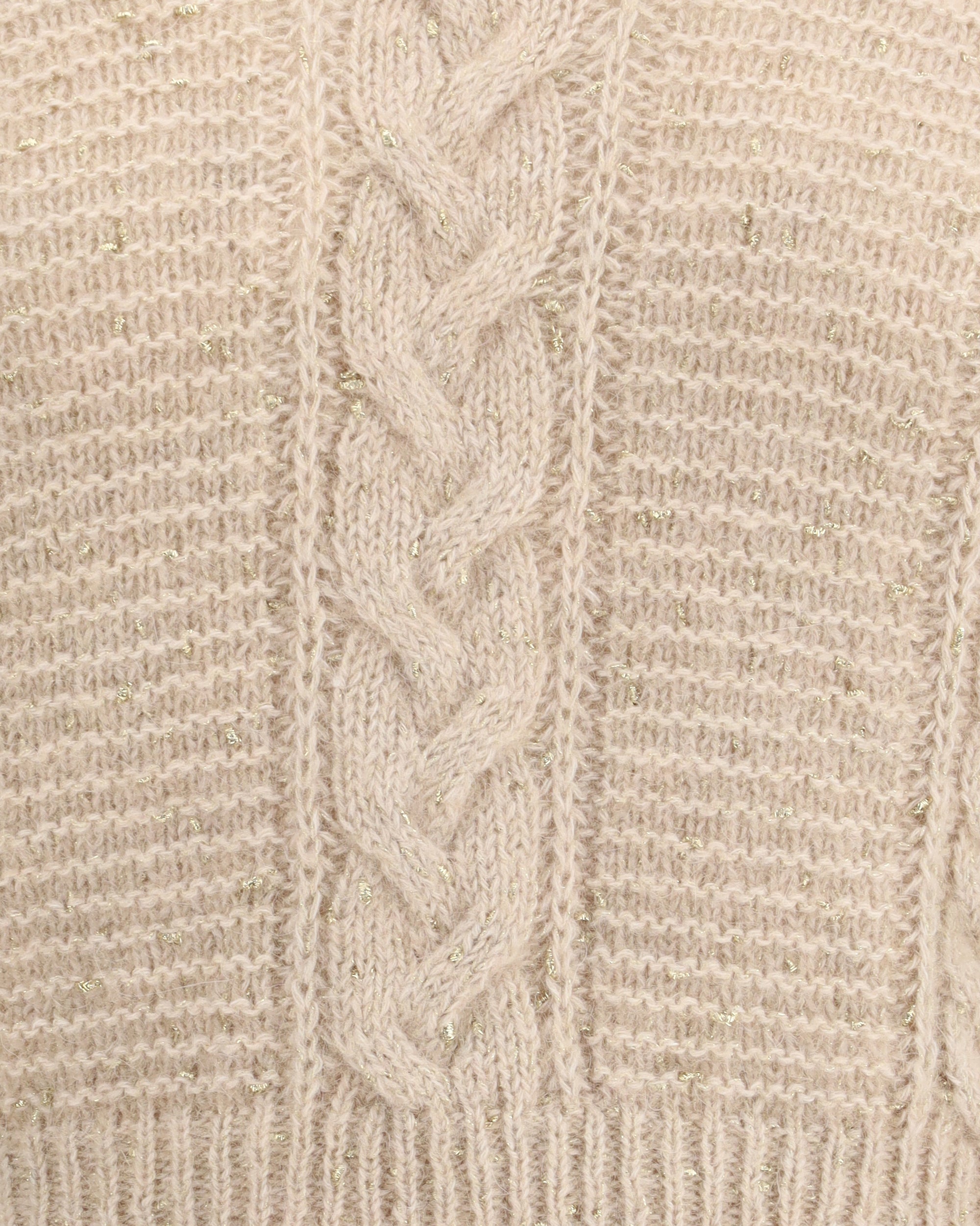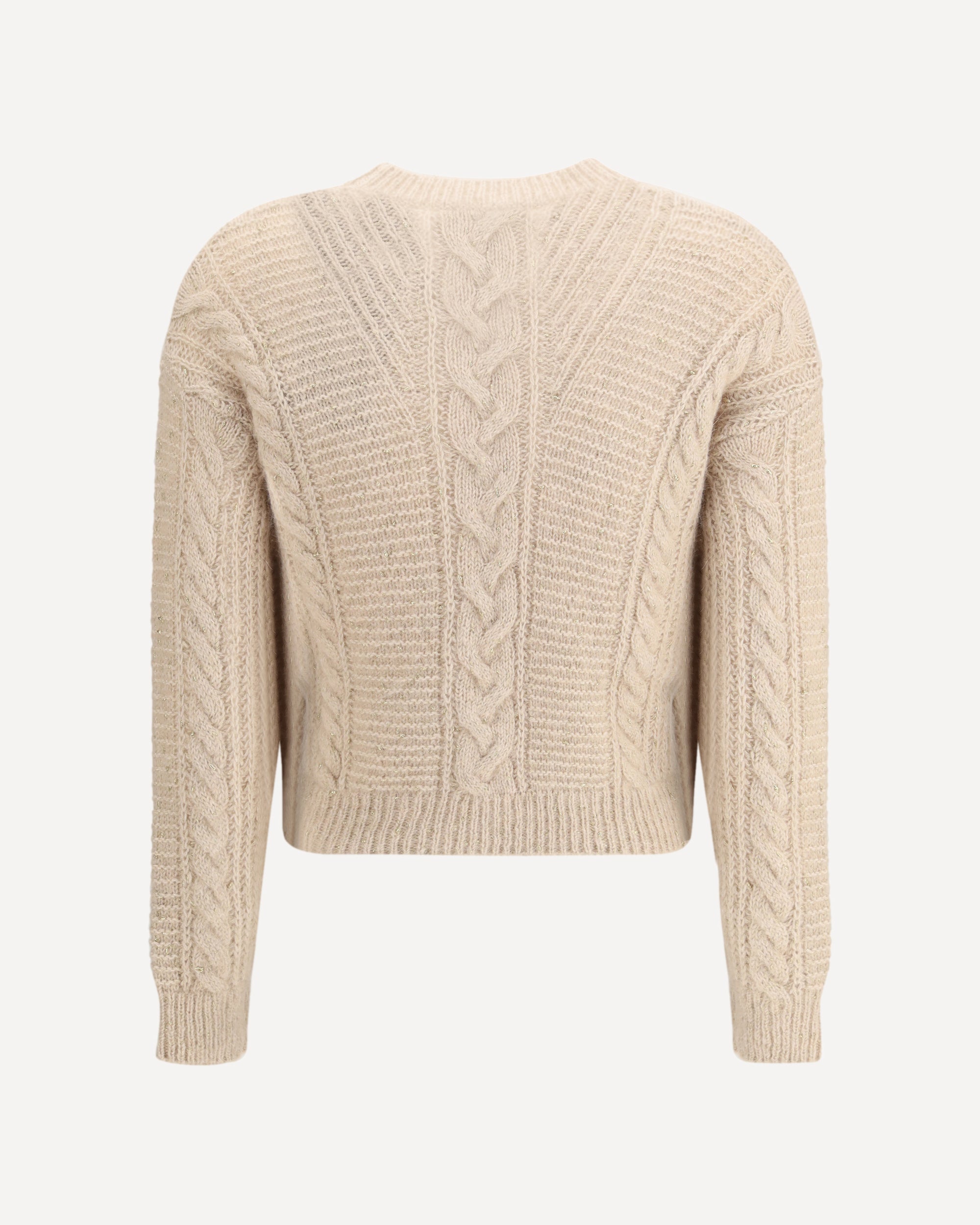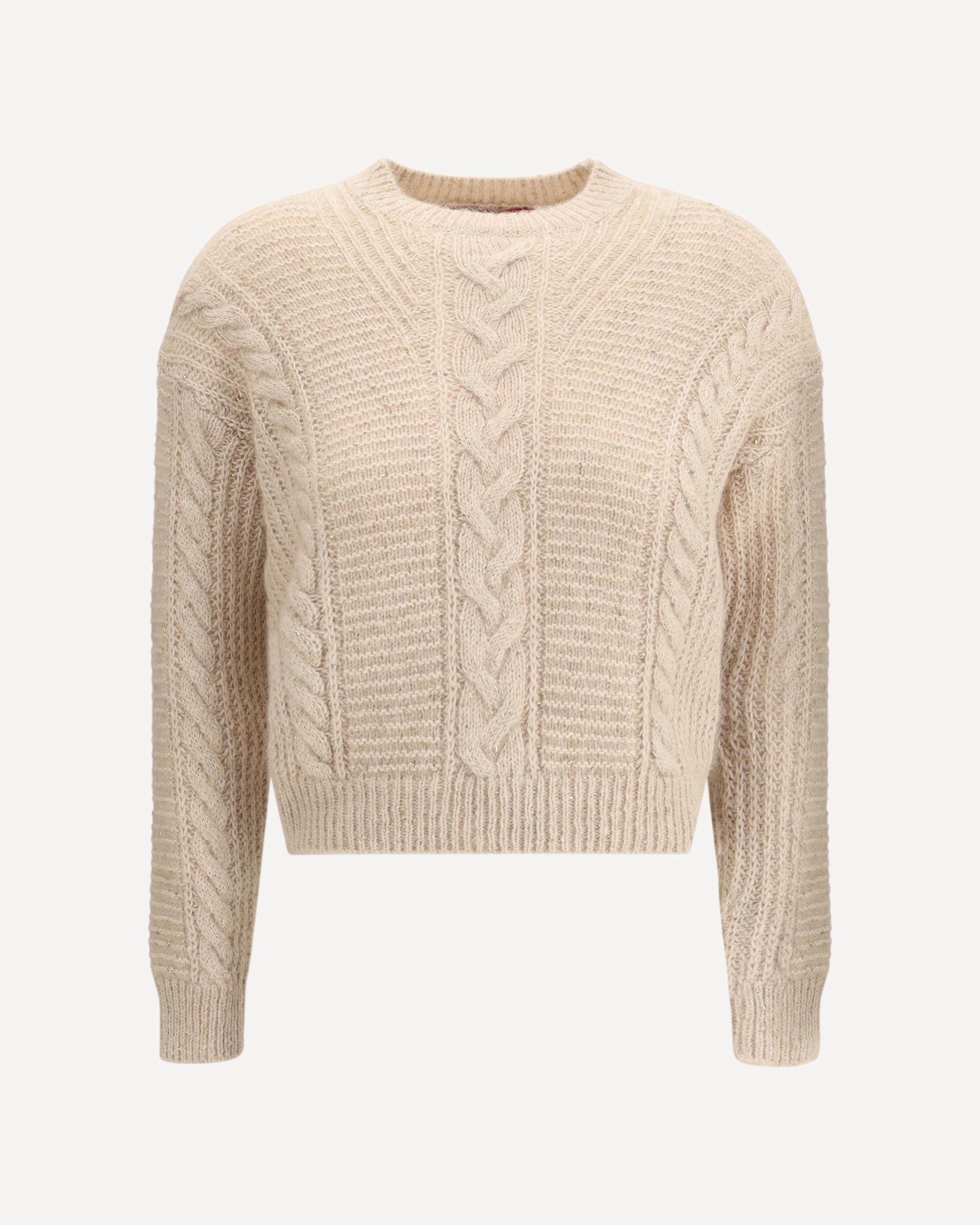 The cropped boxy Sweater by Max Mara Studio, crafted from a soft alpaca-blend yarn interwoven with metallic fibers for a touch of shine and character. The all-over cable and textured knit enrich the design, while the crew neck and dropped shoulders evoke a modern, effortless sophistication.