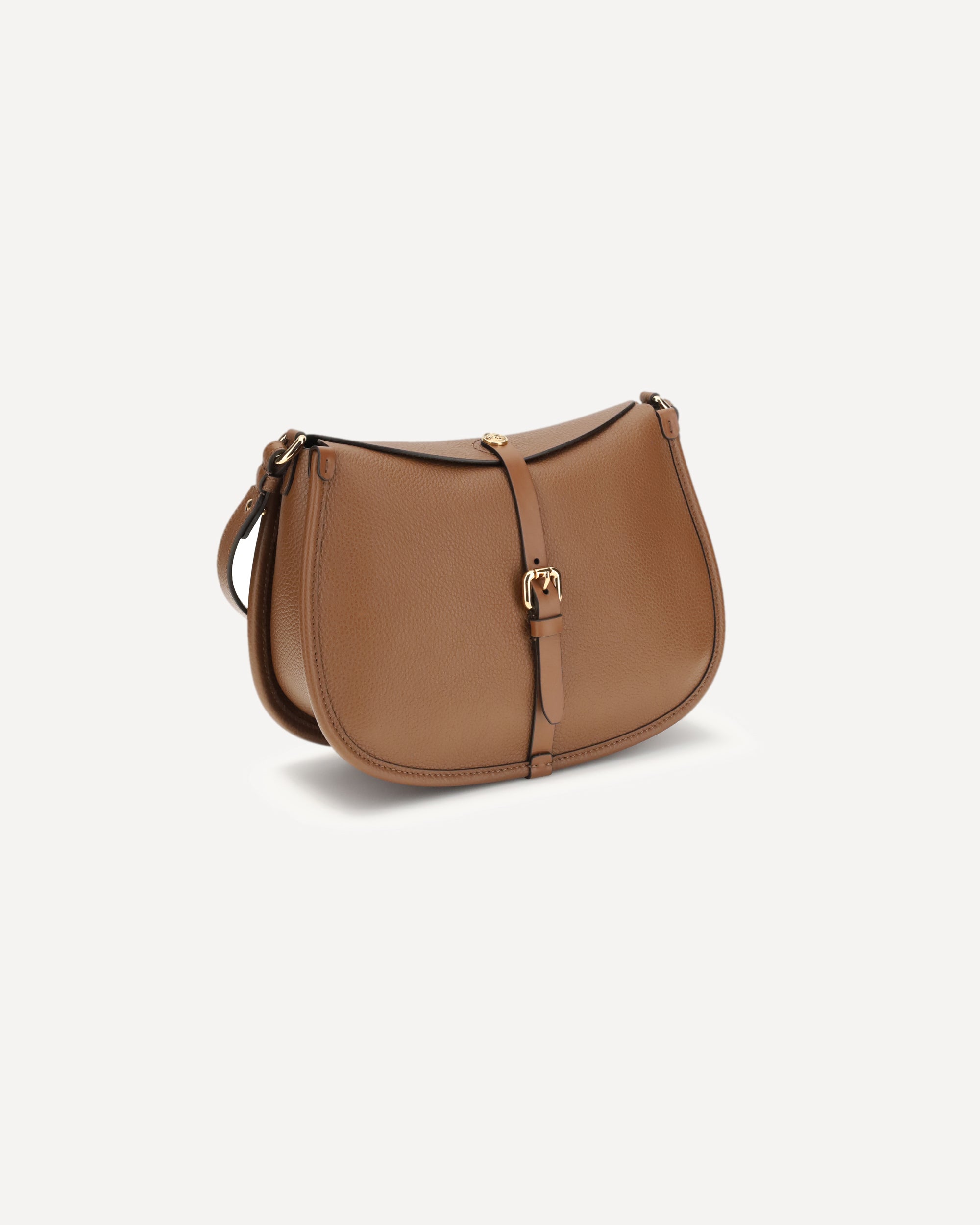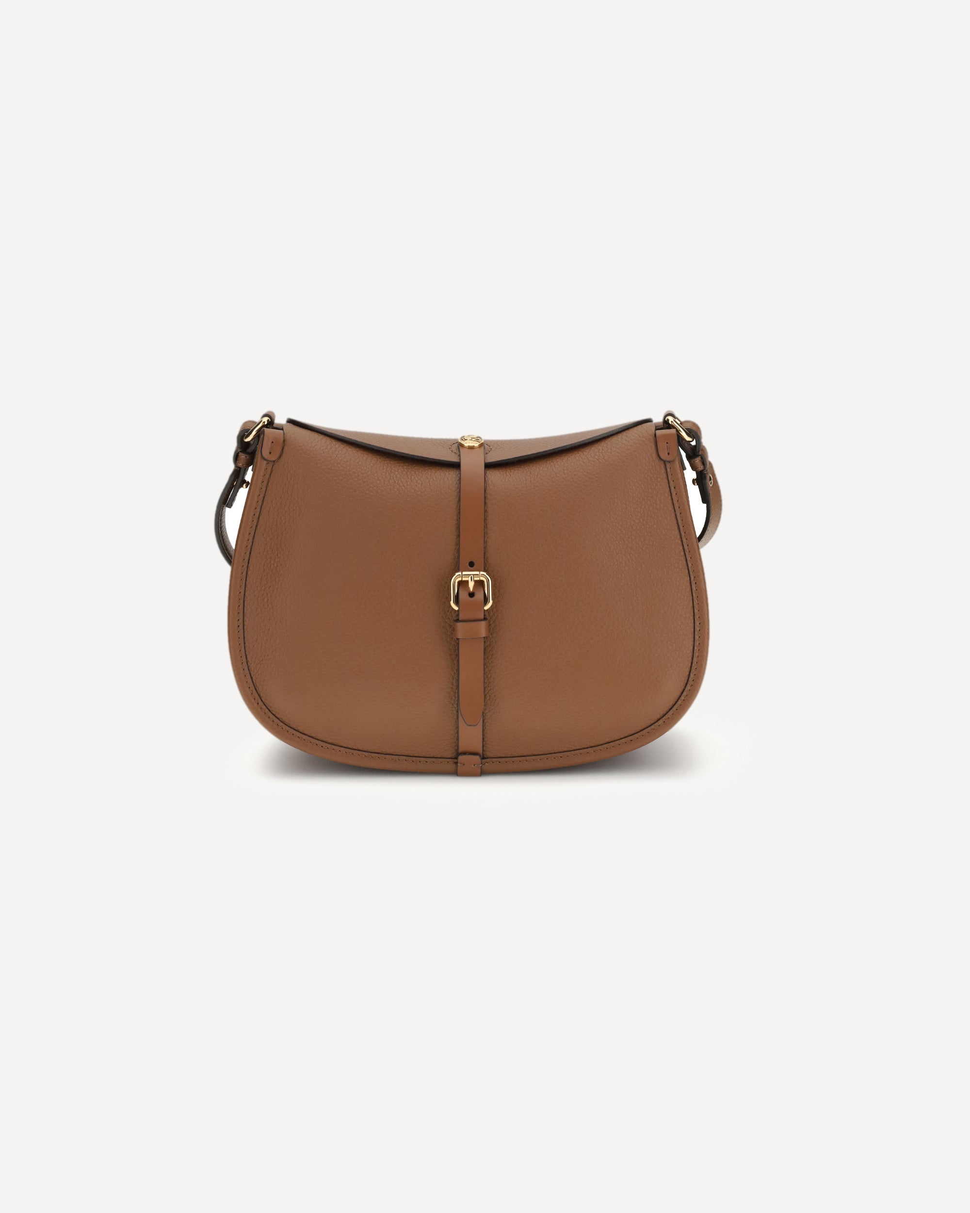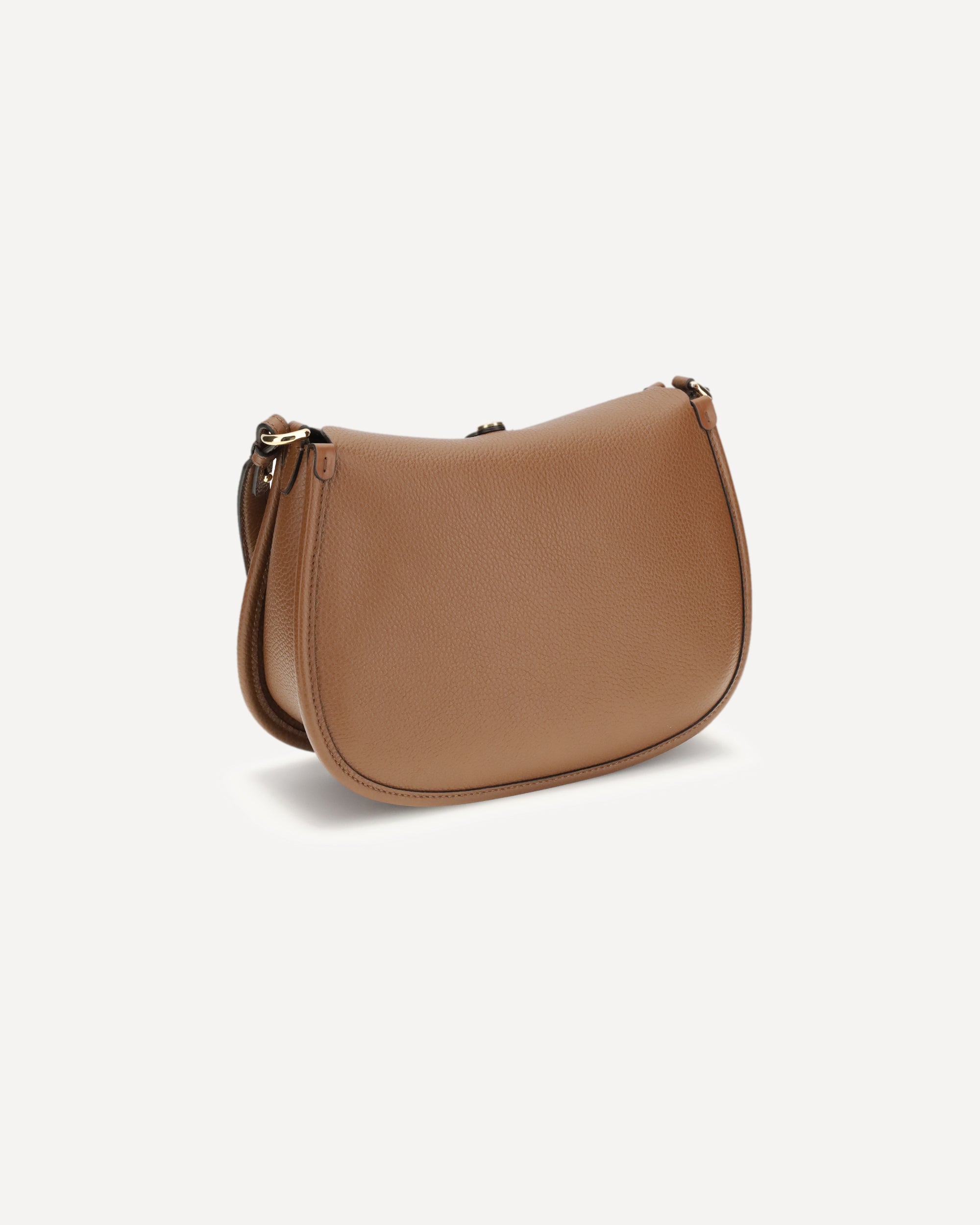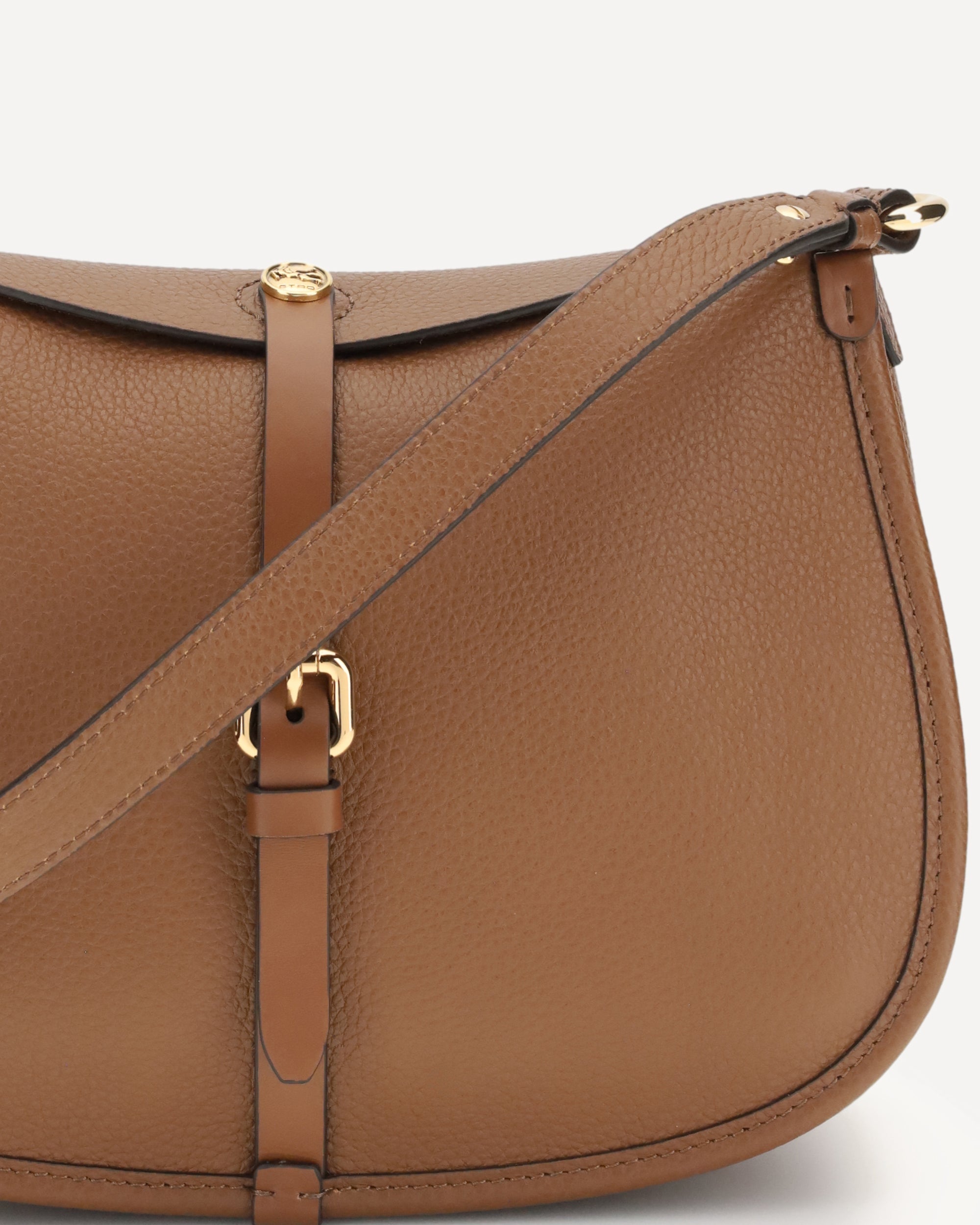 The medium Pony Bag by Etro is crafted from solid-color grained leather with a suede interior and features soft, fluid lines. Presented during the Fall-Winter 2025 fashion show, it offers a double closure: a magnetic button engraved with the ETRO logo and Pegaso motif—crafted using coin-minting techniques—and a functional metal buckle. The design includes interchangeable handles and shoulder straps enhanced by Paisley details on the clasps, an inner wall pocket, and gold-finish metal hardware.